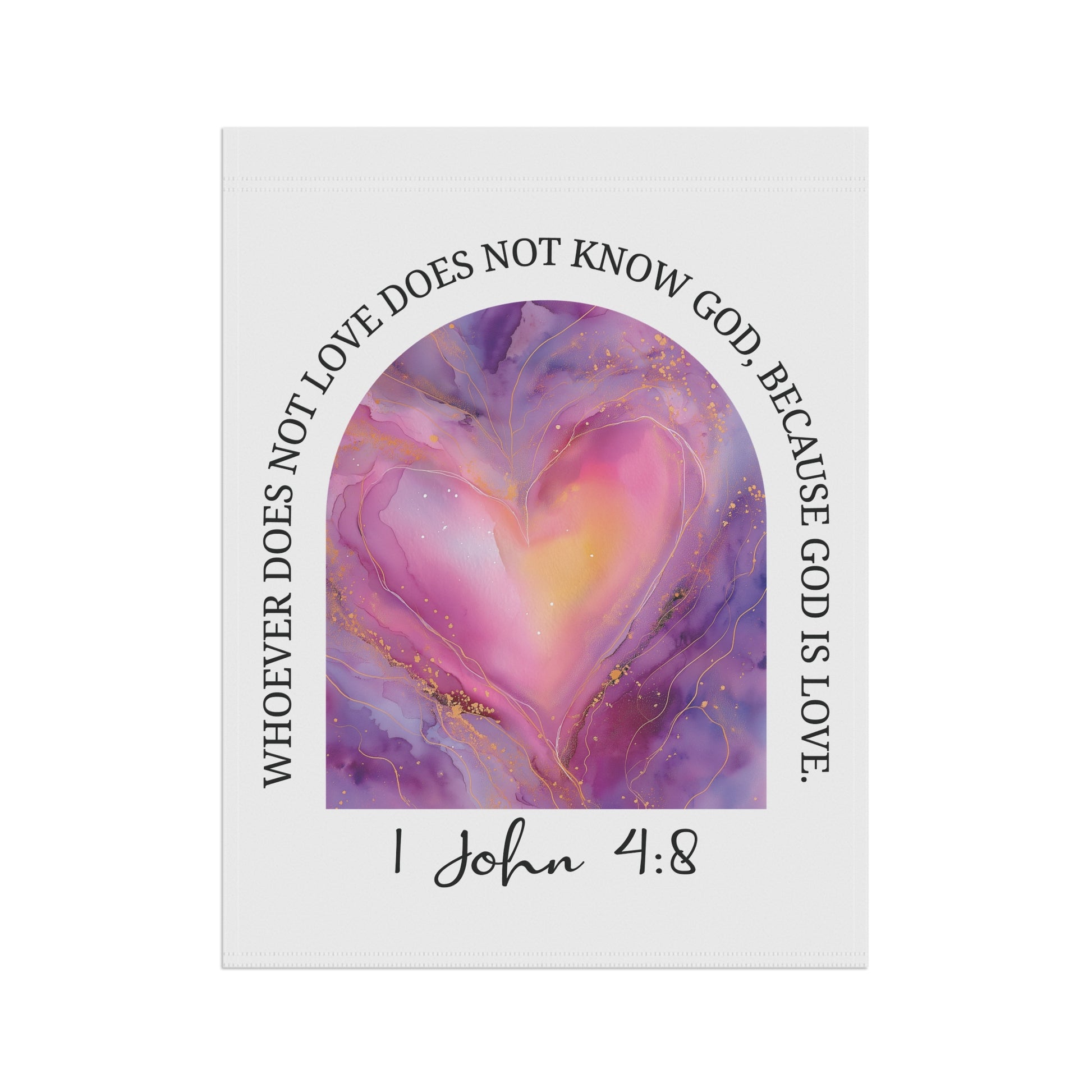 Our 1 John 4:8 Garden Flag features a radiant watercolor heart surrounded by the powerful scripture: