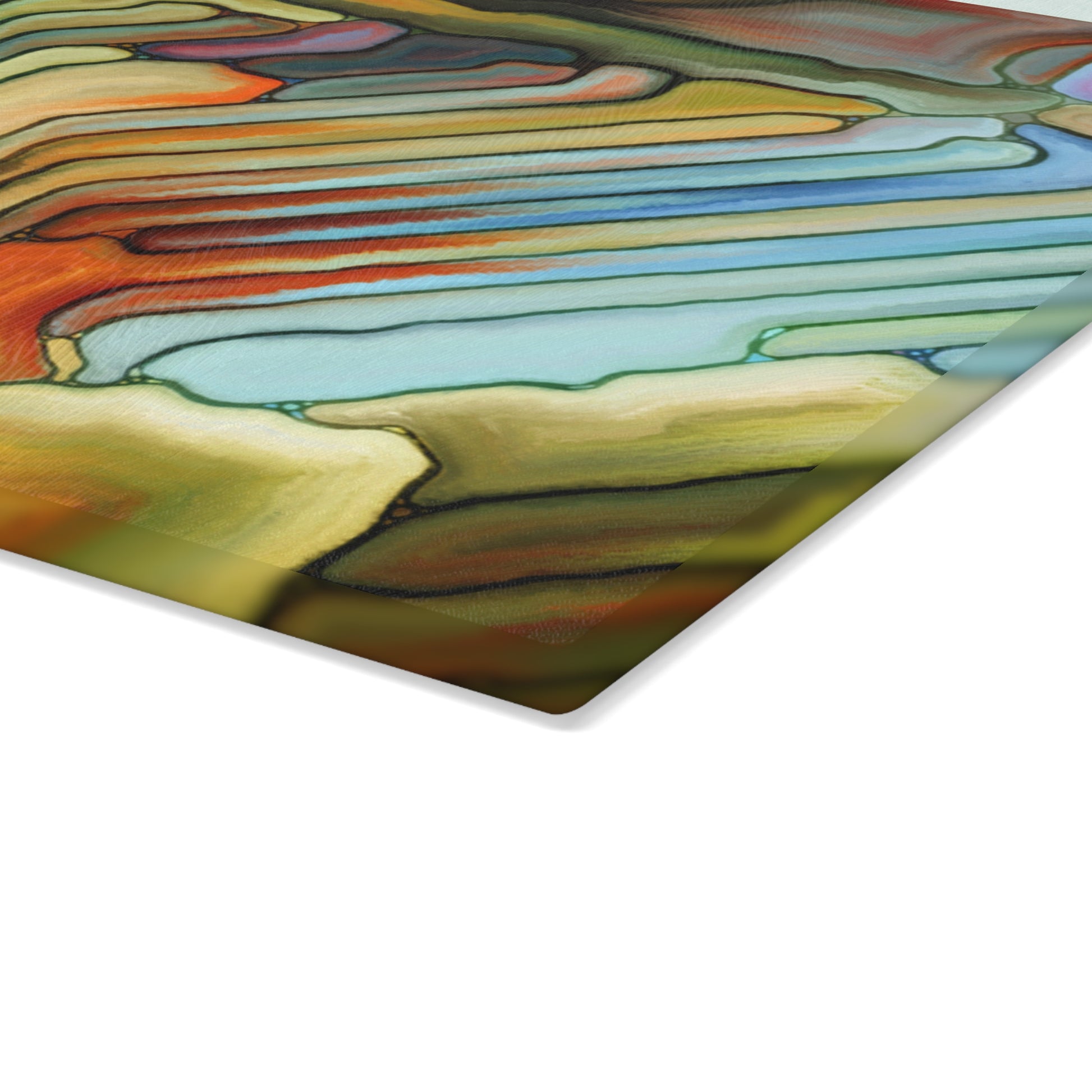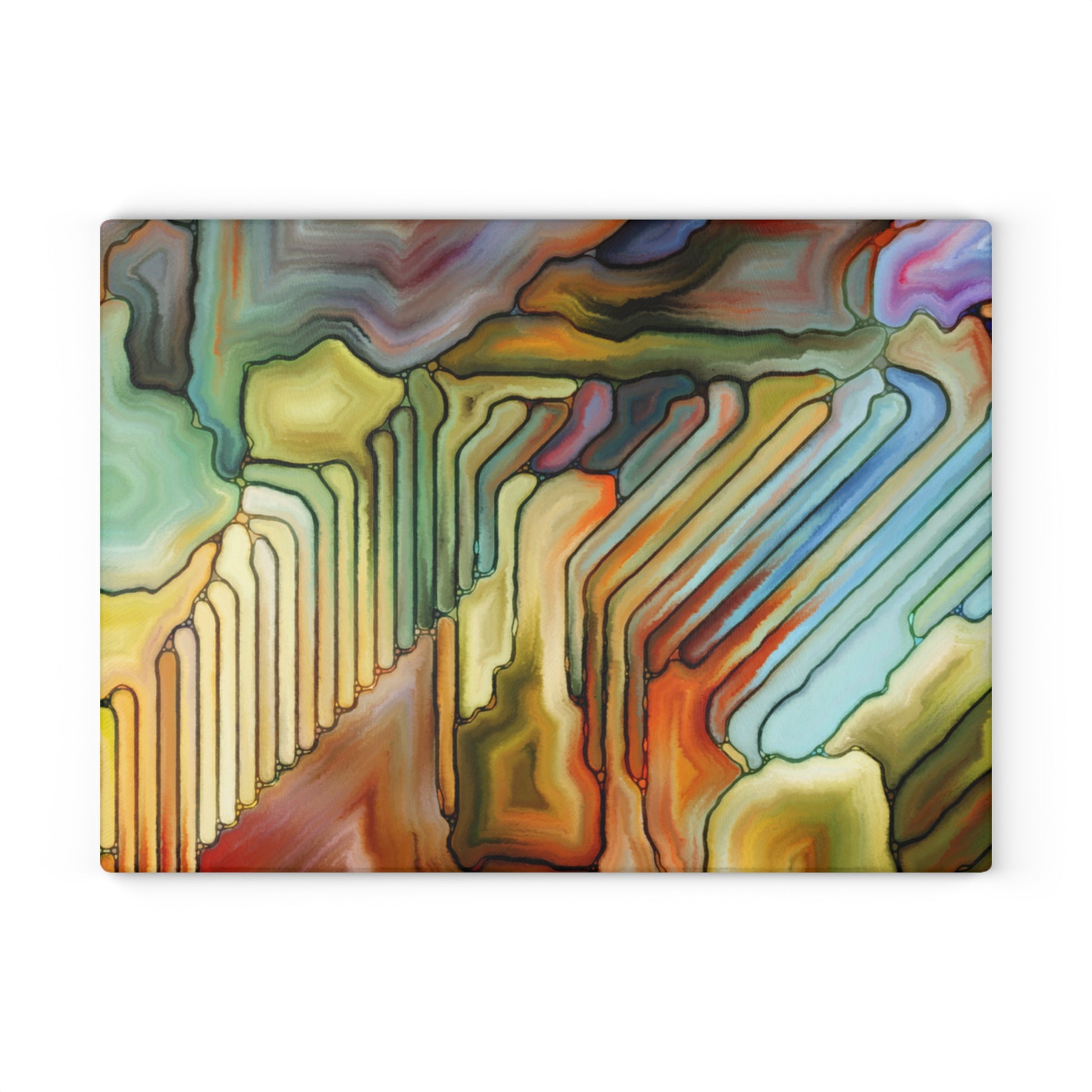 This tempered glass cutting board brings art into the rhythm of your kitchen. A warm, abstract design of layered colors and flowing geometric lines catches the light and resists everyday wear thanks to a durable printing process. The textured glass surface feels clean under your hands and is more sanitary than wood or plastic, while four rubber feet keep the board steady during prep. Choose from two compact sizes to fit your counter or to use as a striking serving piece when friends drop by. Hand-wash care preserves the bright, crisp colors so the pattern stays lively for years.