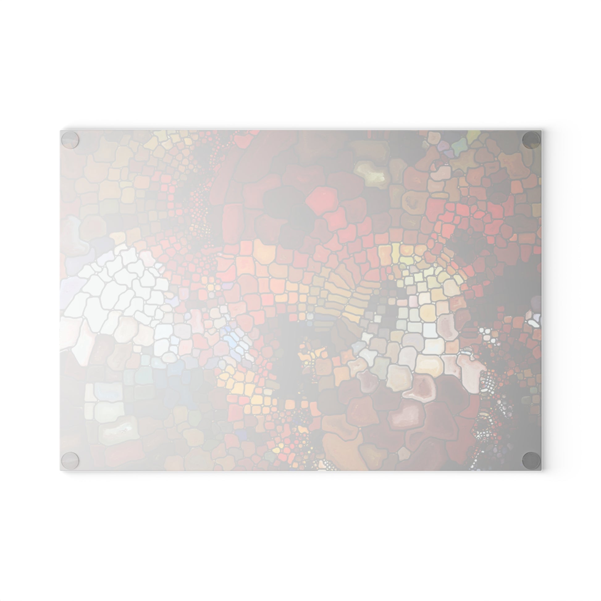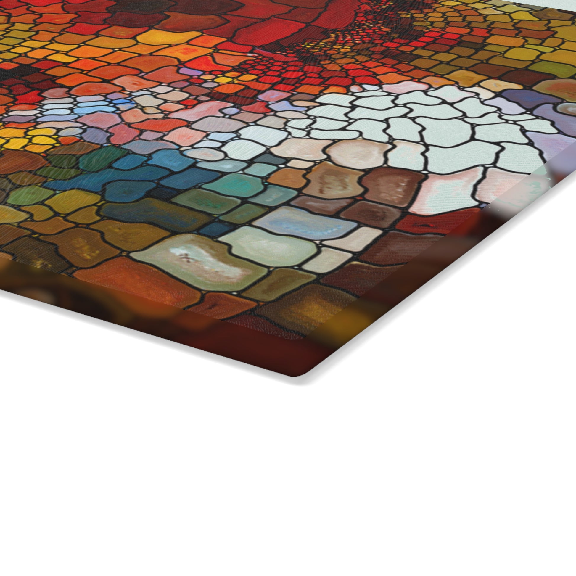 Bring color and calm into your kitchen with this tempered glass cutting board. The design reads like a warm mosaic — deep ambers, brick reds, and honeyed golds that catch the light and add quiet artistry to meal prep. It feels cool and smooth under your hands, stays steady on the counter thanks to four rubber feet, and resists scratches so the pattern stays vivid even after regular use. Use it for chopping, as a bright resting spot for hot dishes, or set it on the counter as a piece of functional art that makes weekday routines feel thoughtful and intentional.