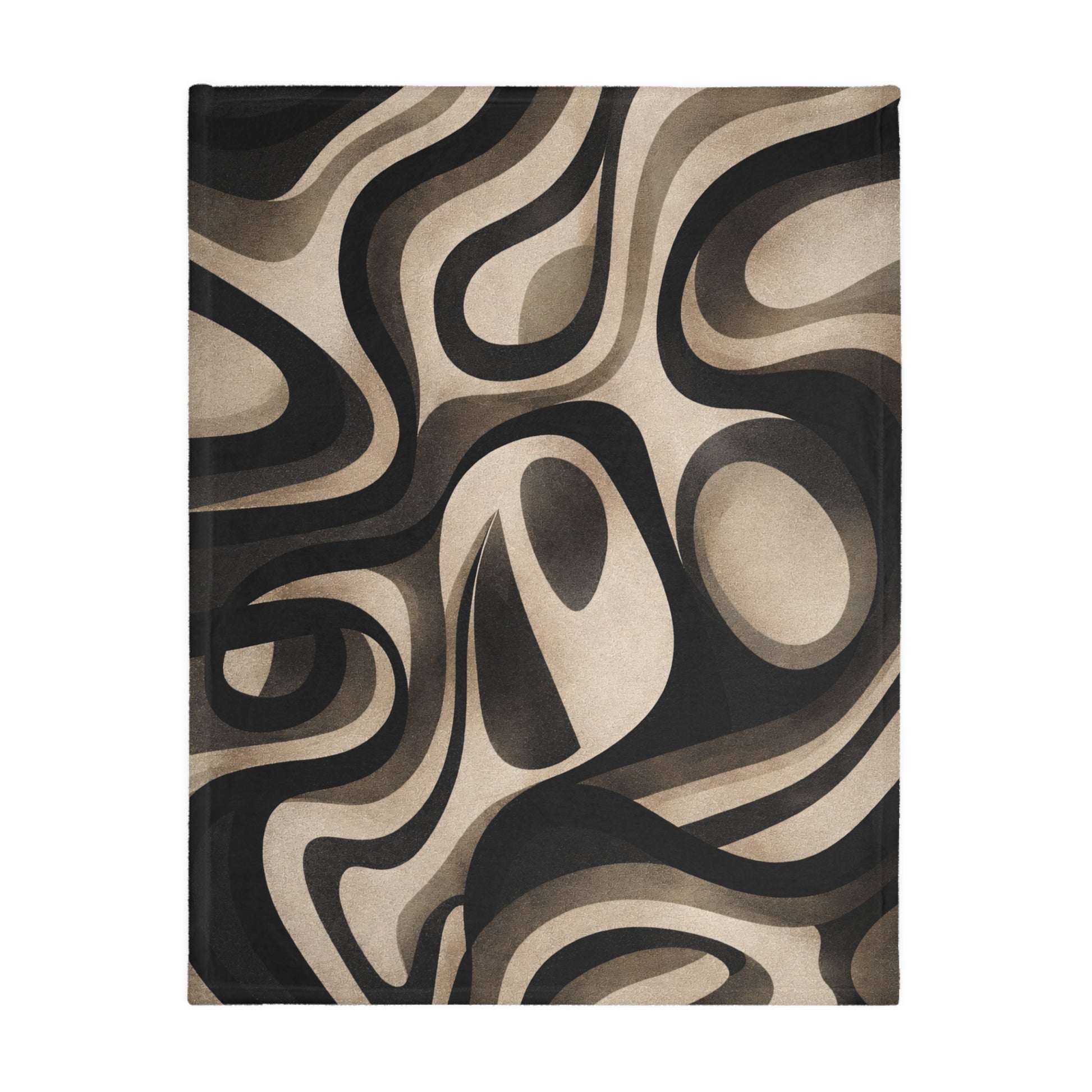Wrap yourself in a cloud of soft warmth that feels like a quiet, late-night studio session. This velveteen microfiber blanket carries a flowing, abstract swirl of warm neutrals — deep charcoal, mocha, and cream — that move like ink in water. It settles into living rooms with low light and record players, or drapes over a reading chair beside a lamp.