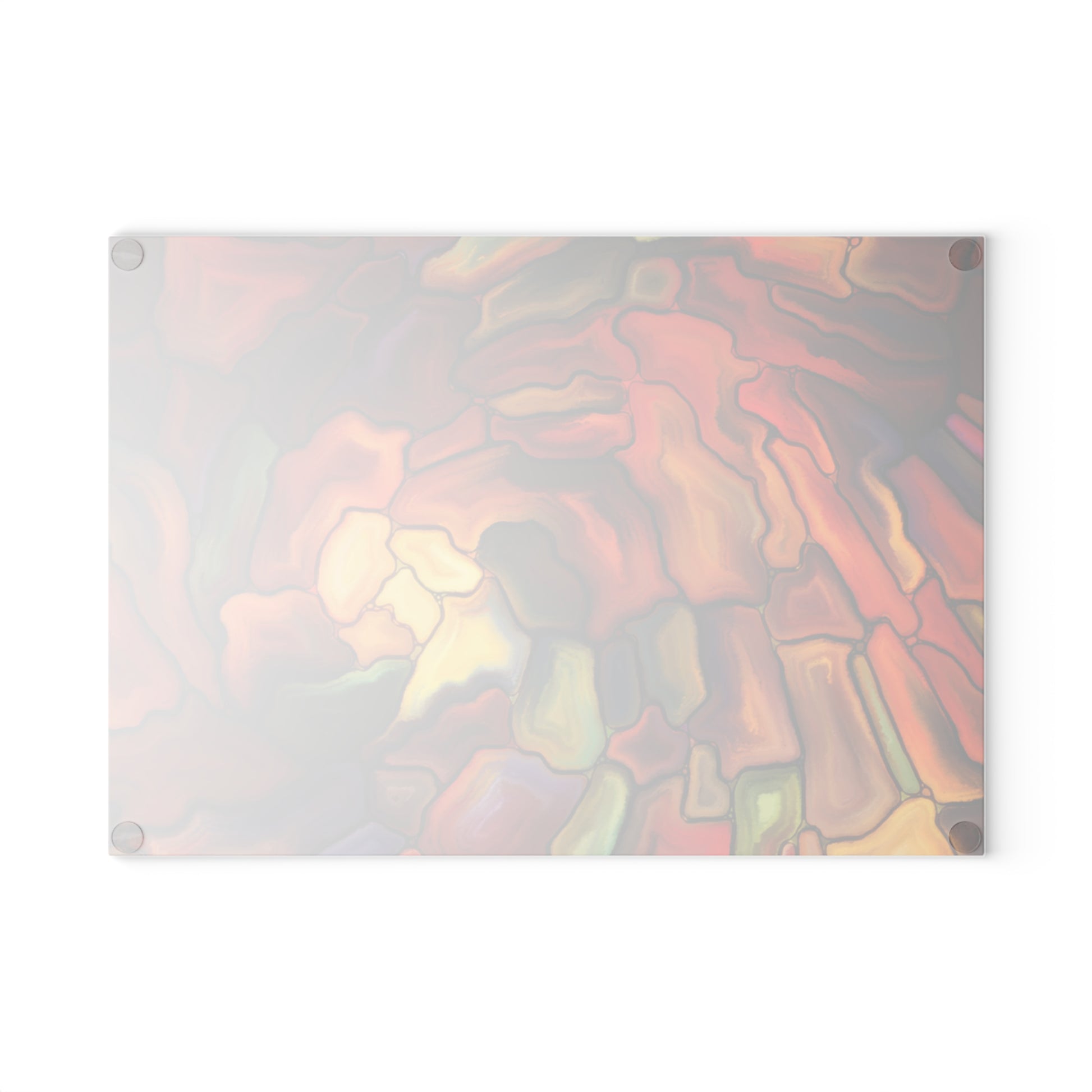 This tempered glass cutting board brings a burst of painterly color to your kitchen countertop. The design reads like stained glass in warm autumn tones — molten ambers, deep crimsons and mossy greens swirl together over a subtly textured surface. It stays steady while you work thanks to four rubber feet, and the printing process locks the artwork into the glass so the pattern won’t scratch off with regular use. Lightweight yet sturdy, the board doubles as a prep surface and an eye-catching display when not in use. Hand wash recommended to keep the colors vibrant.