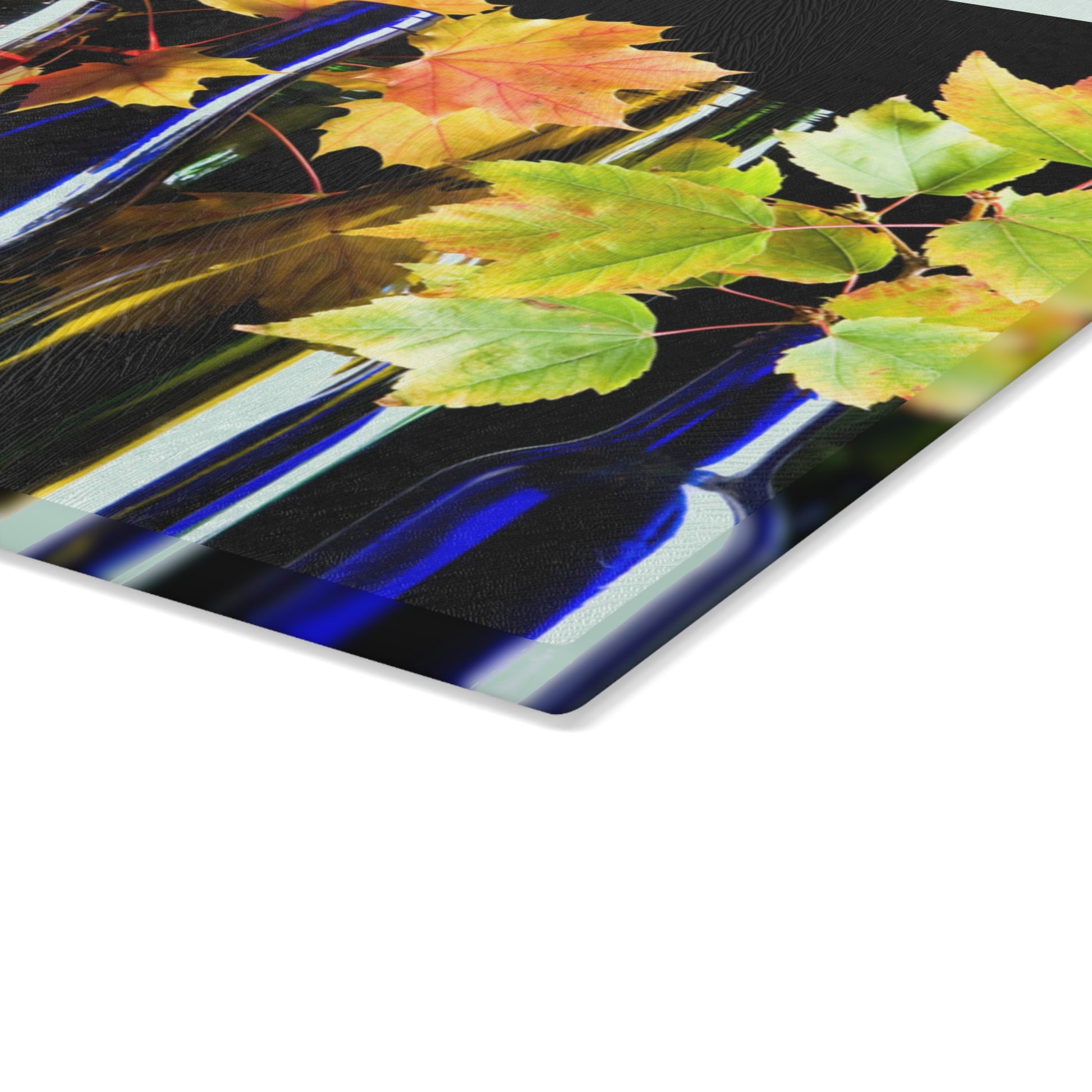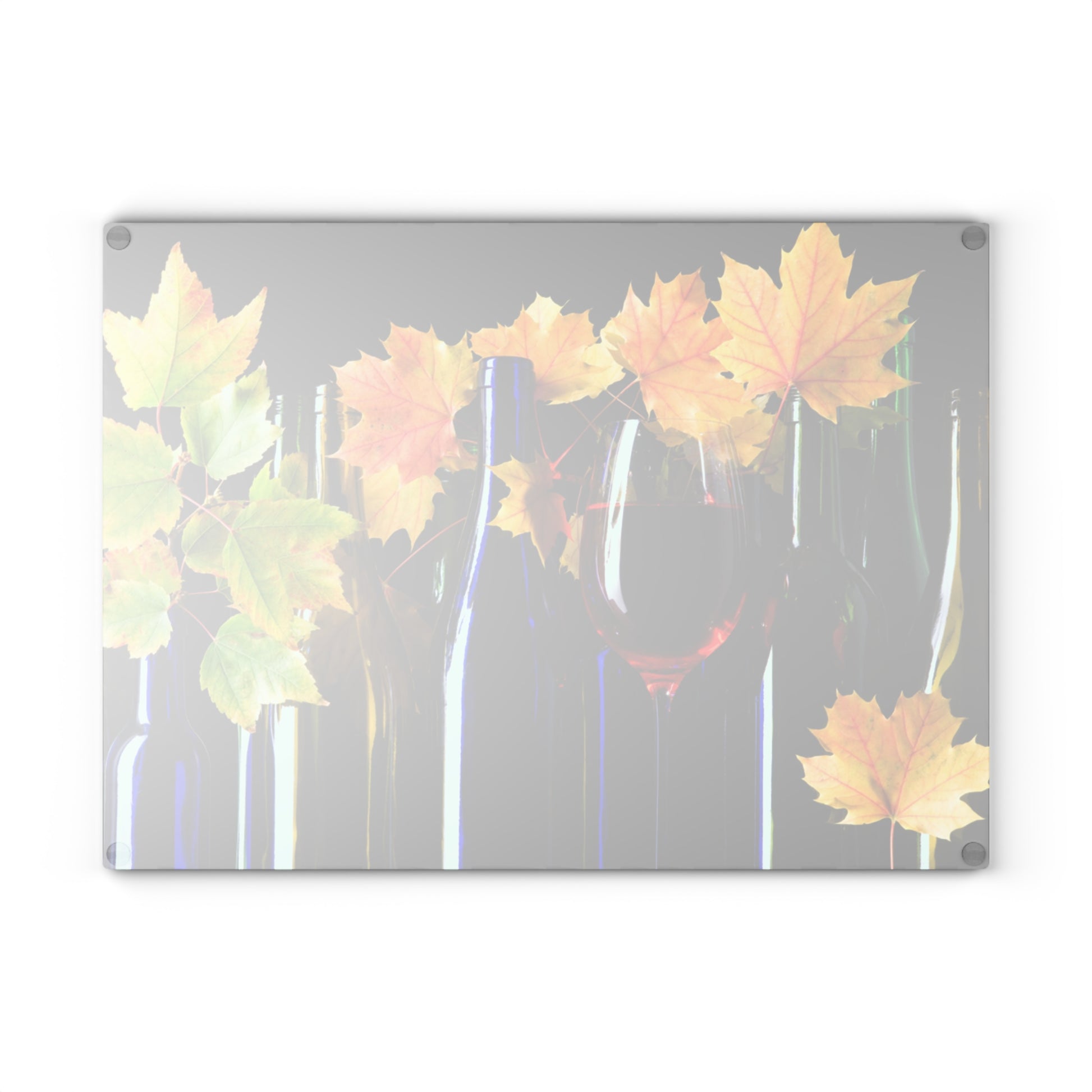Bring warm seasonal charm to your kitchen with this elegant autumn wine glass cutting board. Featuring rich wine bottles, a filled red wine glass, and vibrant maple leaves against a dramatic dark background, this design blends functional kitchen prep with sophisticated fall décor.