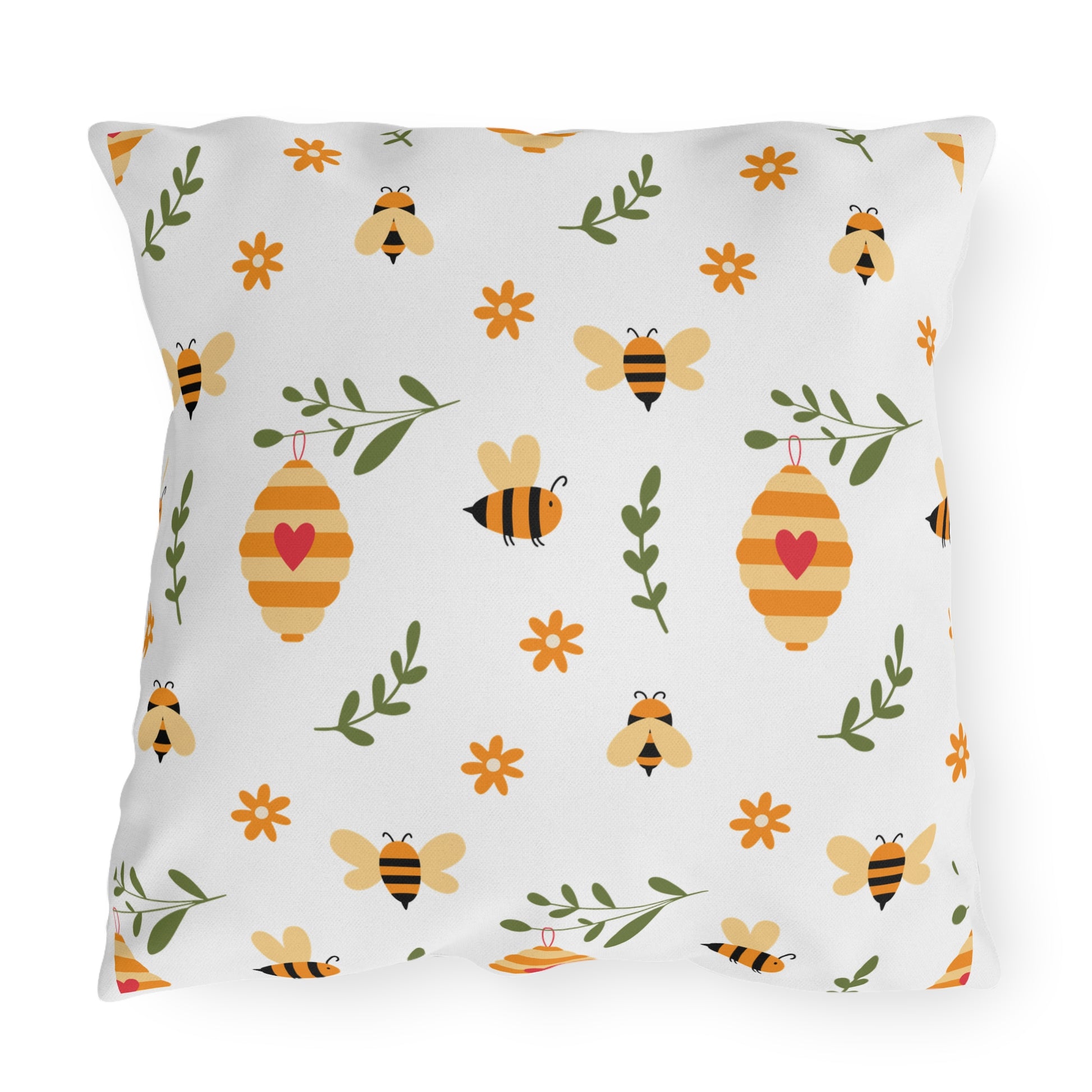 Bright and colorful outdoor pillows featuring bees and heart accented bee hives, perfect for adding a touch of nature to your outdoor space. These pillows are water and UV resistant, making them durable for outdoor use and easy to clean. Ideal for nature lovers and those who enjoy spending time in their outdoor living areas. Perfect for spring and summer decor.