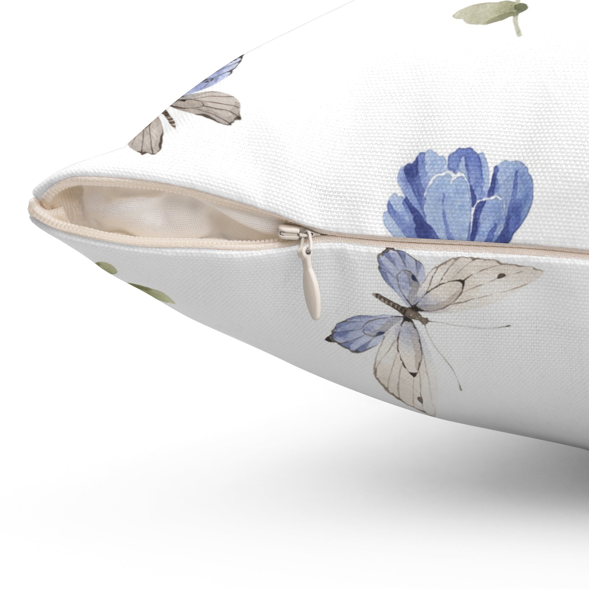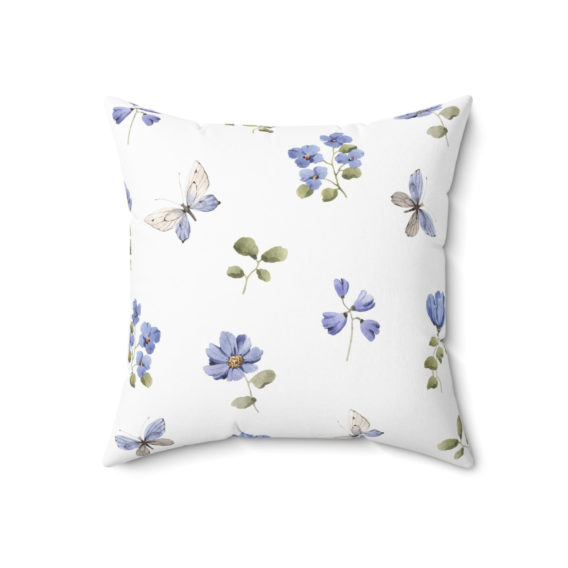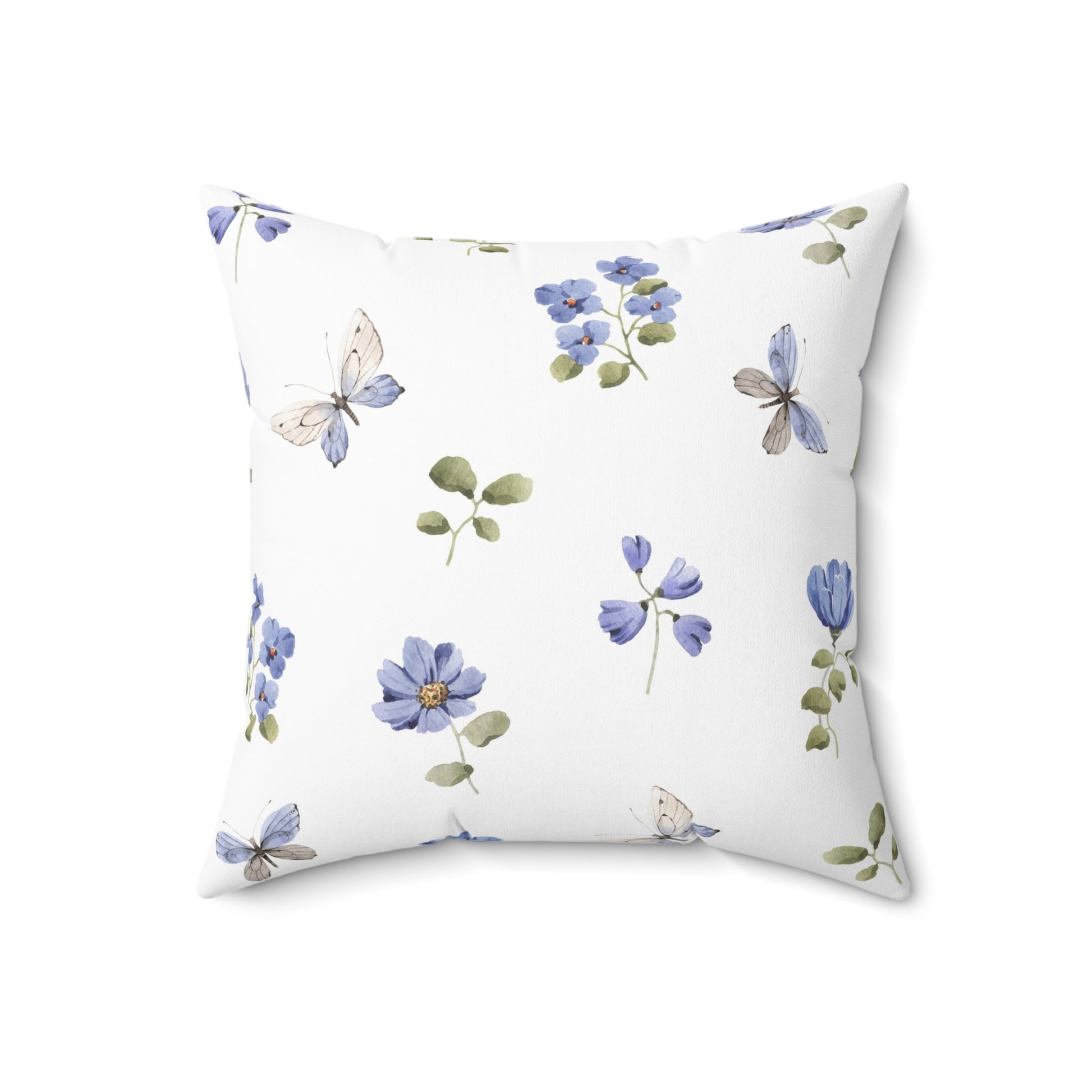 Indoor pillow featuring butterflies and light blue flowers, giving a delicate and calming vibe to any room. Perfect for those who love nature-inspired decor or want to add a touch of tranquility to their space. Great for home decor, springtime, Easter, or Mother's Day.
