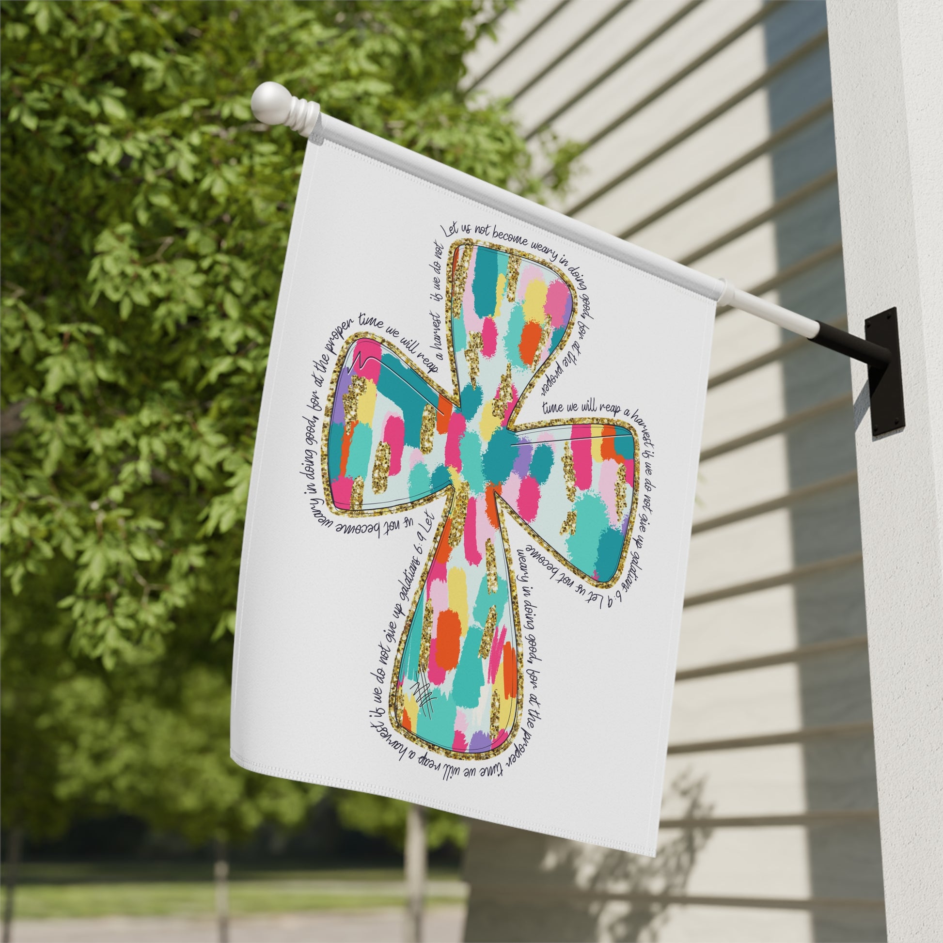 Share faith and encouragement with this Christian Cross Garden Flag, featuring a vibrant, hand-painted style cross surrounded by uplifting scripture inspired by Galatians 6:9. 'Let us not become weary in doing good, for at the proper time we will reap a harvest if we do not give up.' The colorful brushstroke design paired with meaningful words creates a beautiful expression of hope, perseverance, and faith.