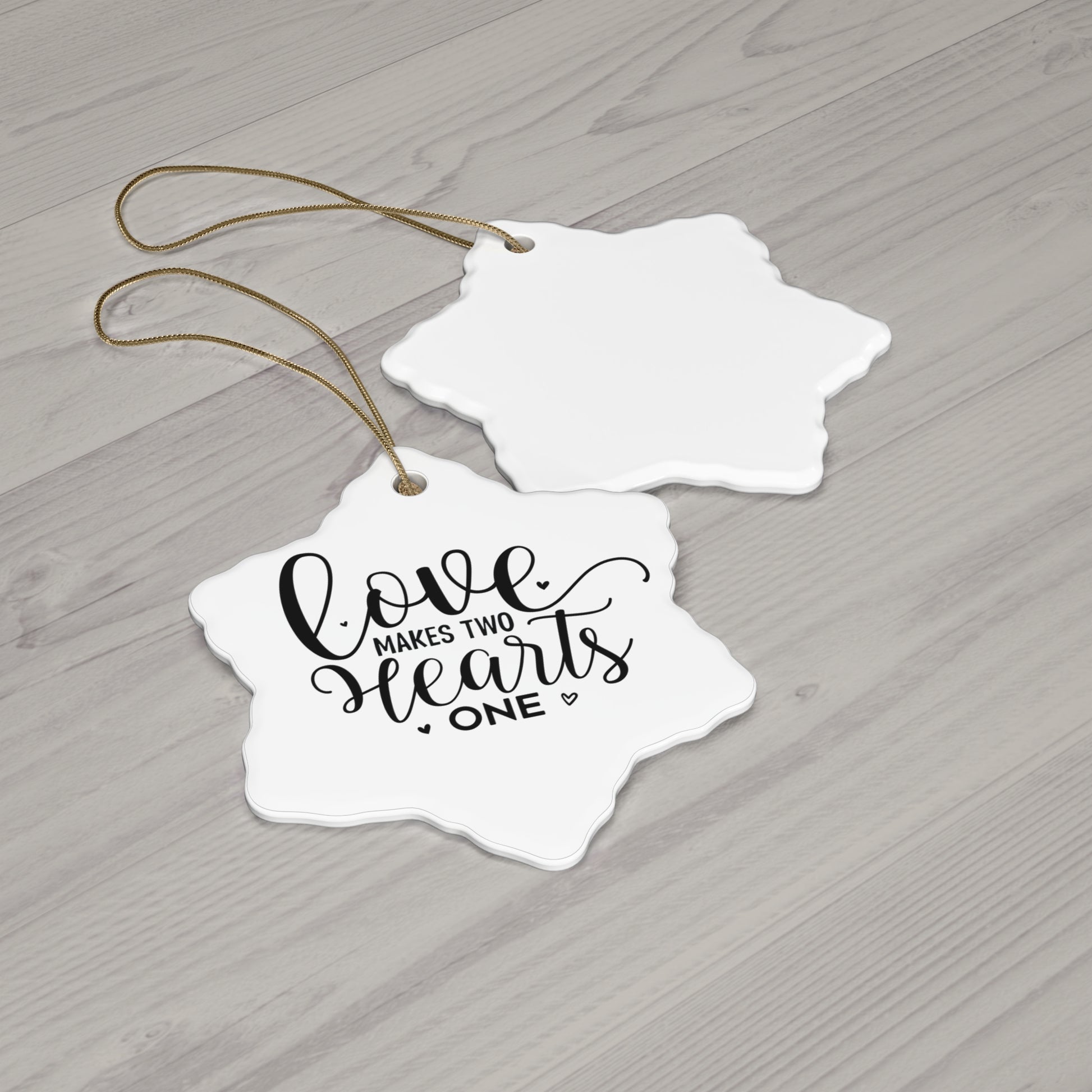 A beautiful Christmas ornament with the phrase 'Love Makes Two Hearts One'. Perfect for adding a touch of love and warmth to your holiday decorations. Ideal for those who cherish love and togetherness during the festive season. Relevant for Christmas, Valentine's Day, and anniversary celebrations.