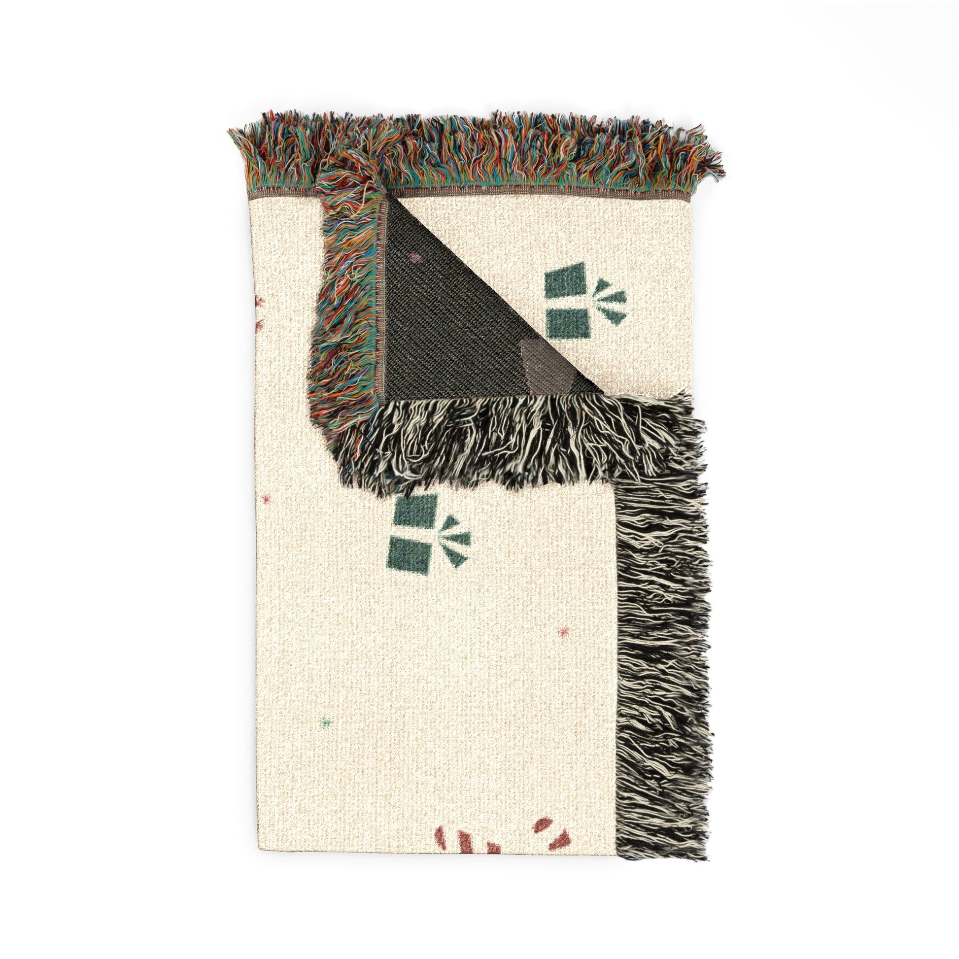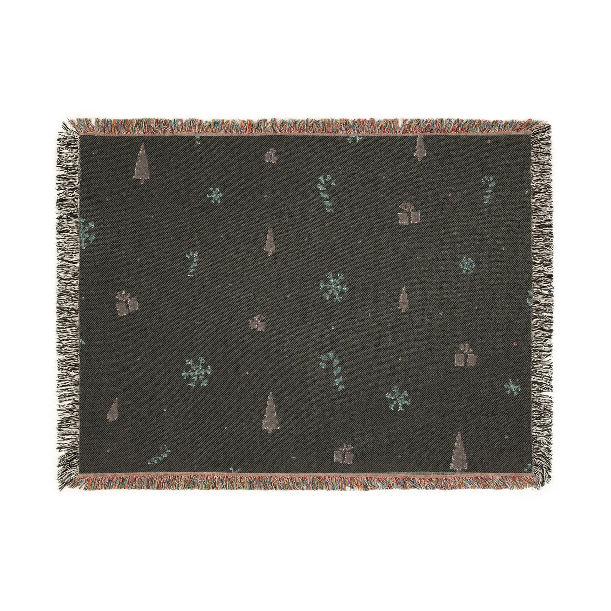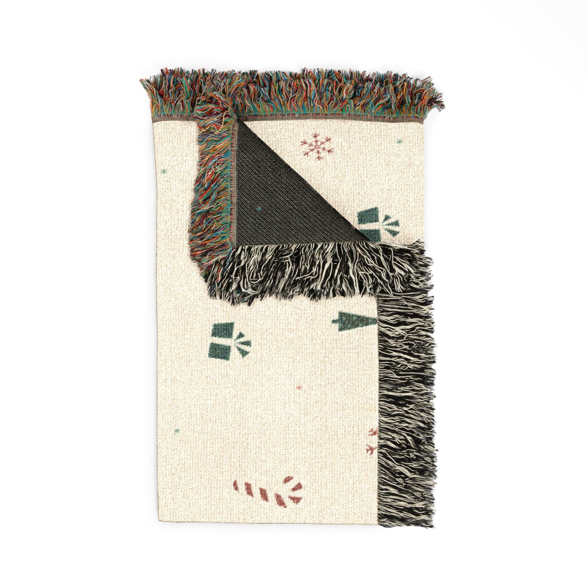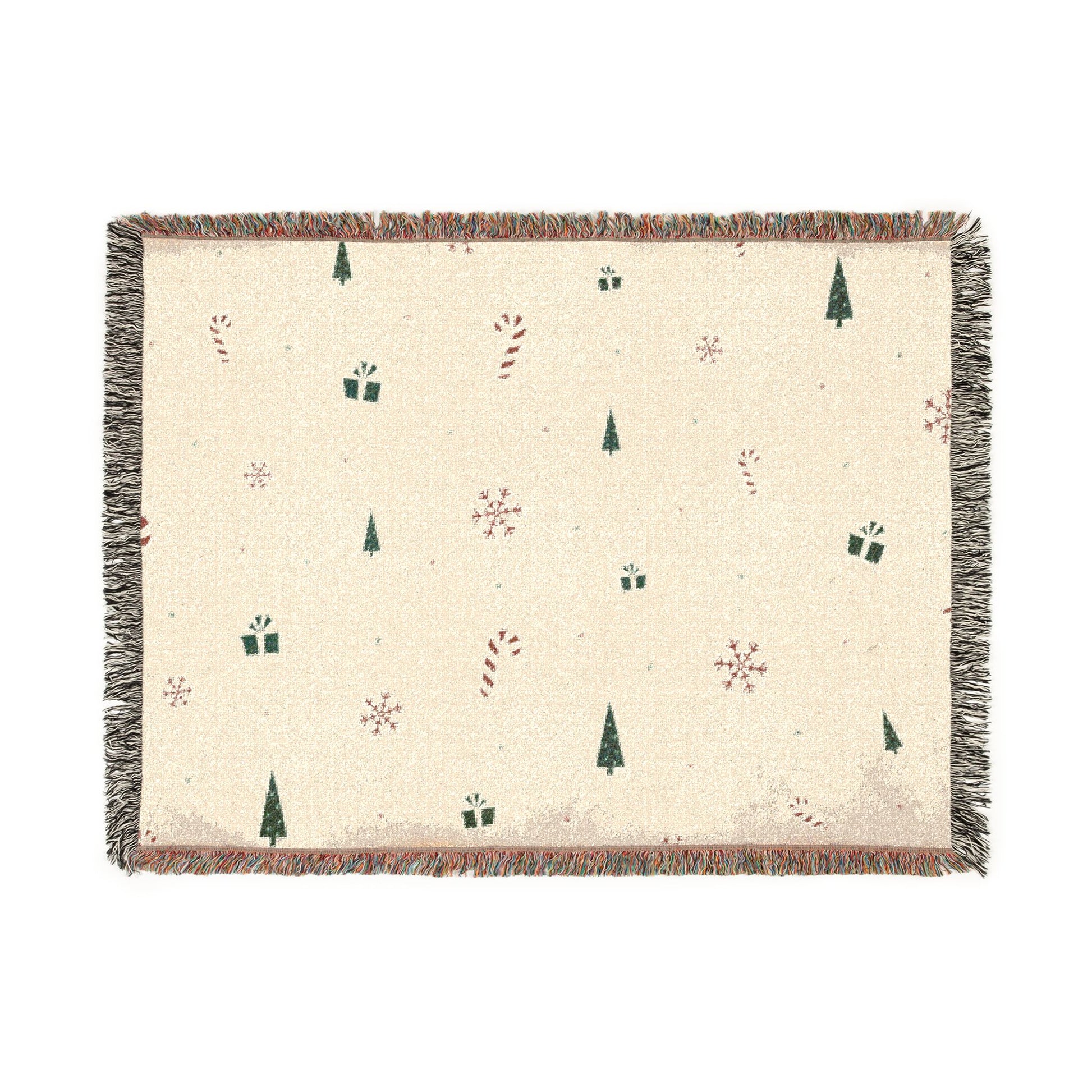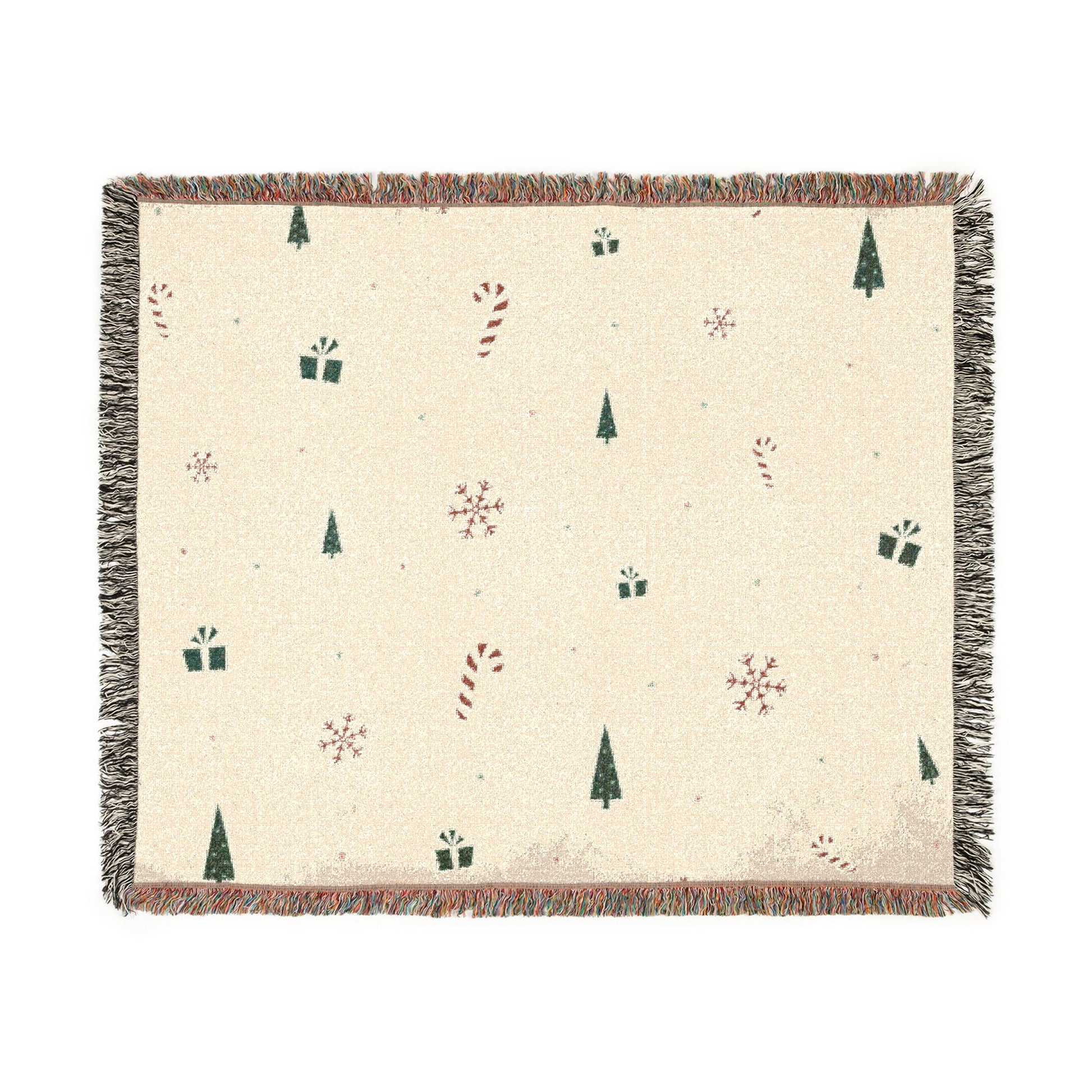 Celebrate the season in cozy style with this Christmas woven throw blanket, featuring a simple and charming pattern of holiday trees, snowflakes, candy canes, and gift boxes on a soft neutral background.