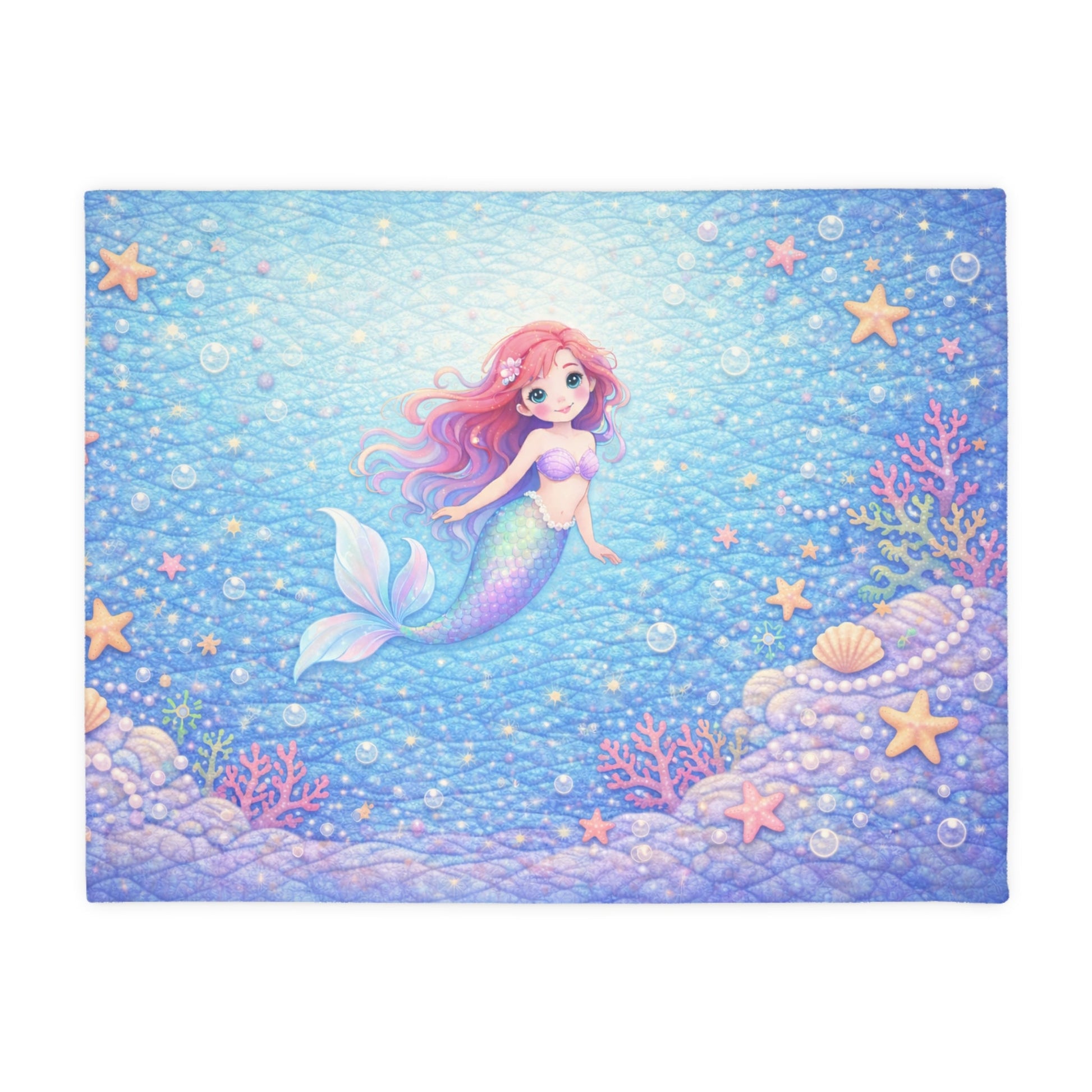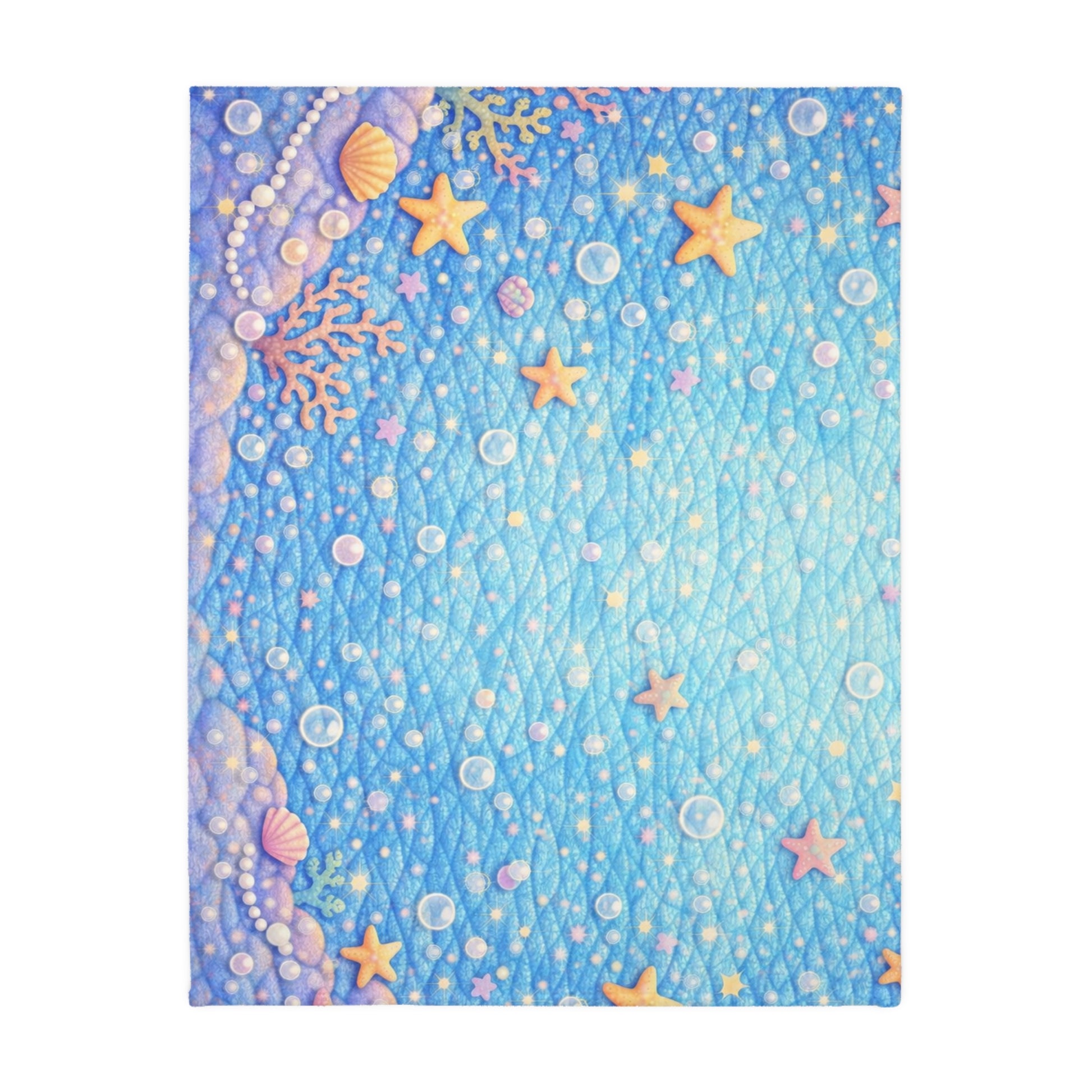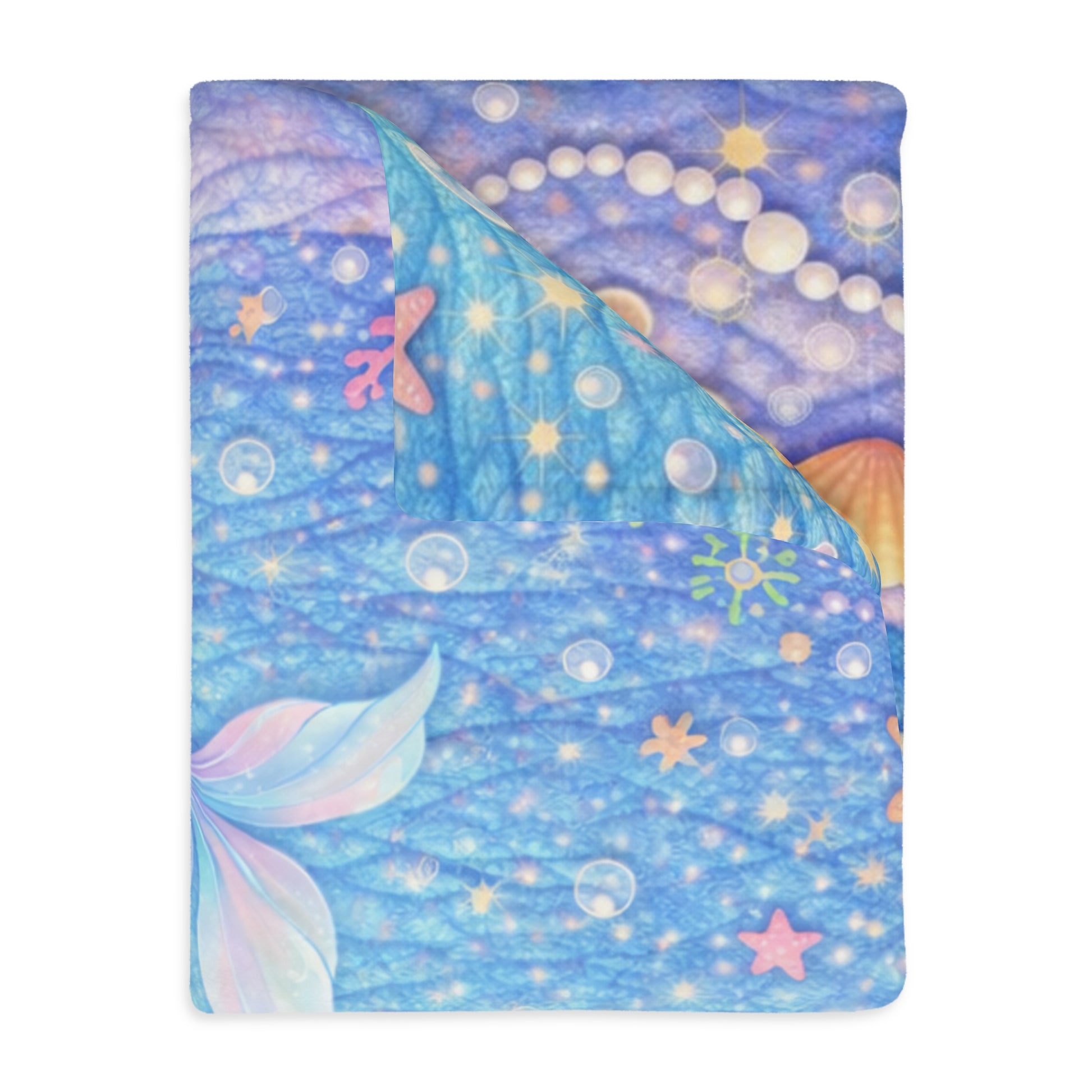 Float into a bedtime story with this velveteen microfiber blanket. The two-sided print wraps little dreamers in a glowing underwater world — coral gardens, pearly shells, drifting bubbles and a smiling mermaid — rendered in soft pastels and shimmering blues.