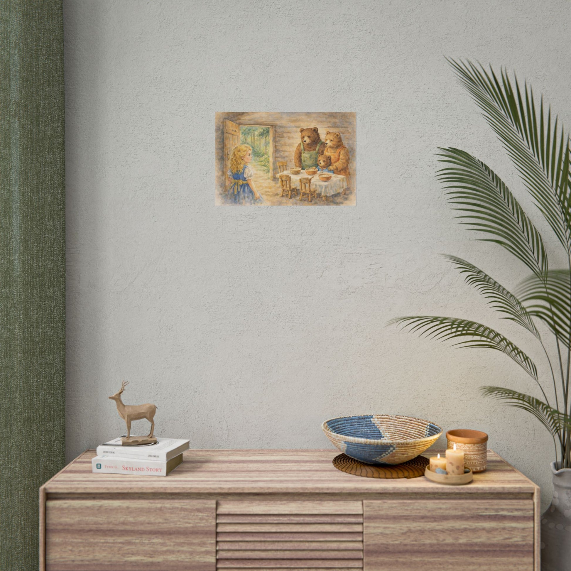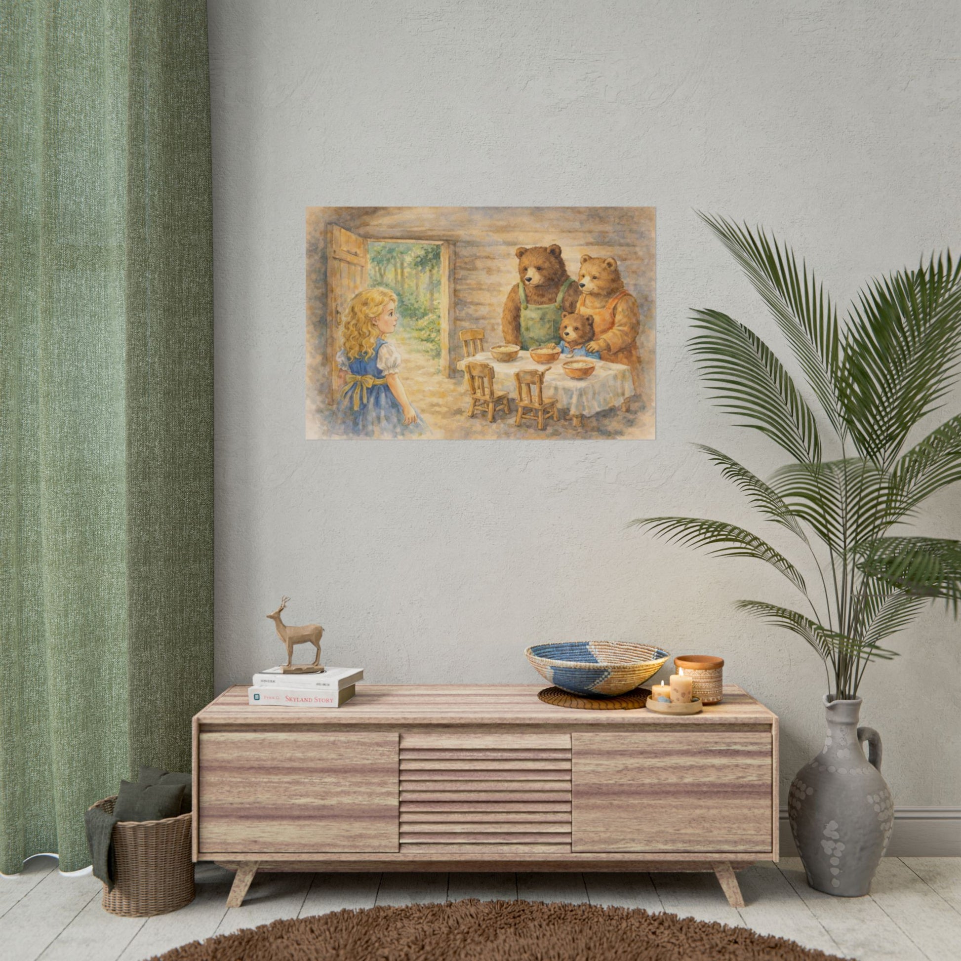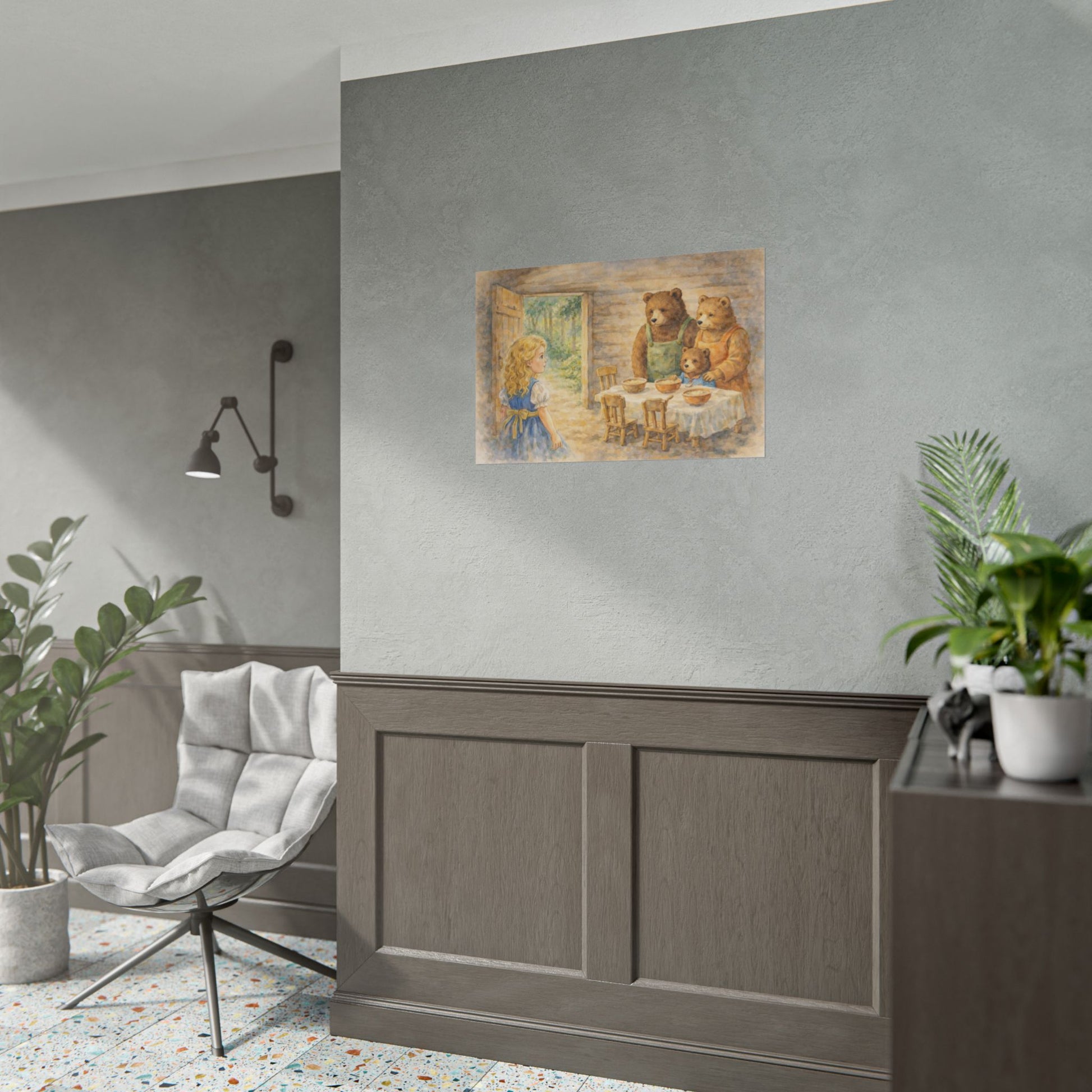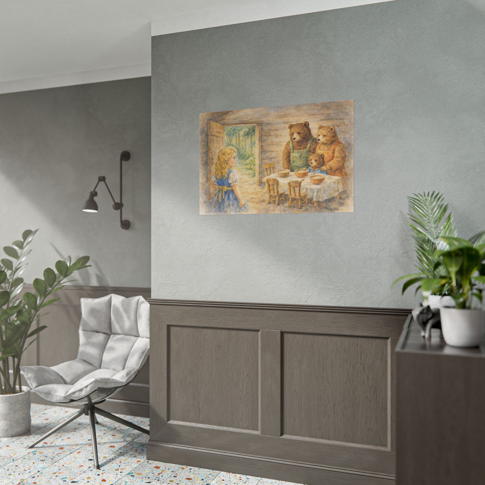 Soft watercolor strokes and warm, homey light — this rolled poster brings a quiet nursery-story moment to your walls. The scene of a curious child meeting a gentle bear family feels like a page torn from a beloved picture book: sun filtering through an open door, simple wooden chairs, bowls set on a linen-covered table. It adds a nostalgic hush to reading nooks, nursery corners, or cozy hallways, settling into rooms that favor gentle colors and hand-painted detail. Choose fine art for textured, archival depth; semi-glossy for vivid photographic clarity; or matte for a calm, low-sheen look. Each print ships rolled to preserve the paper and arrives ready to be framed or mounted however you like. Our own AI assisted design.
