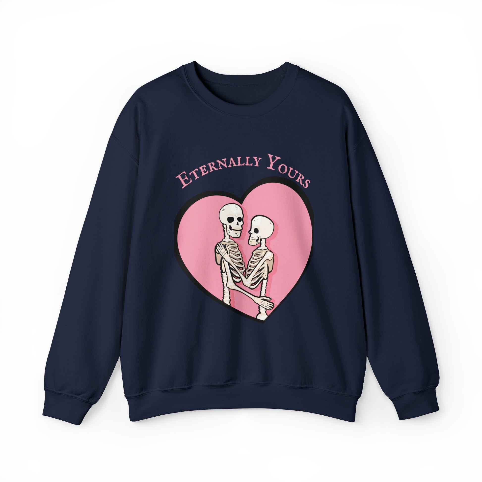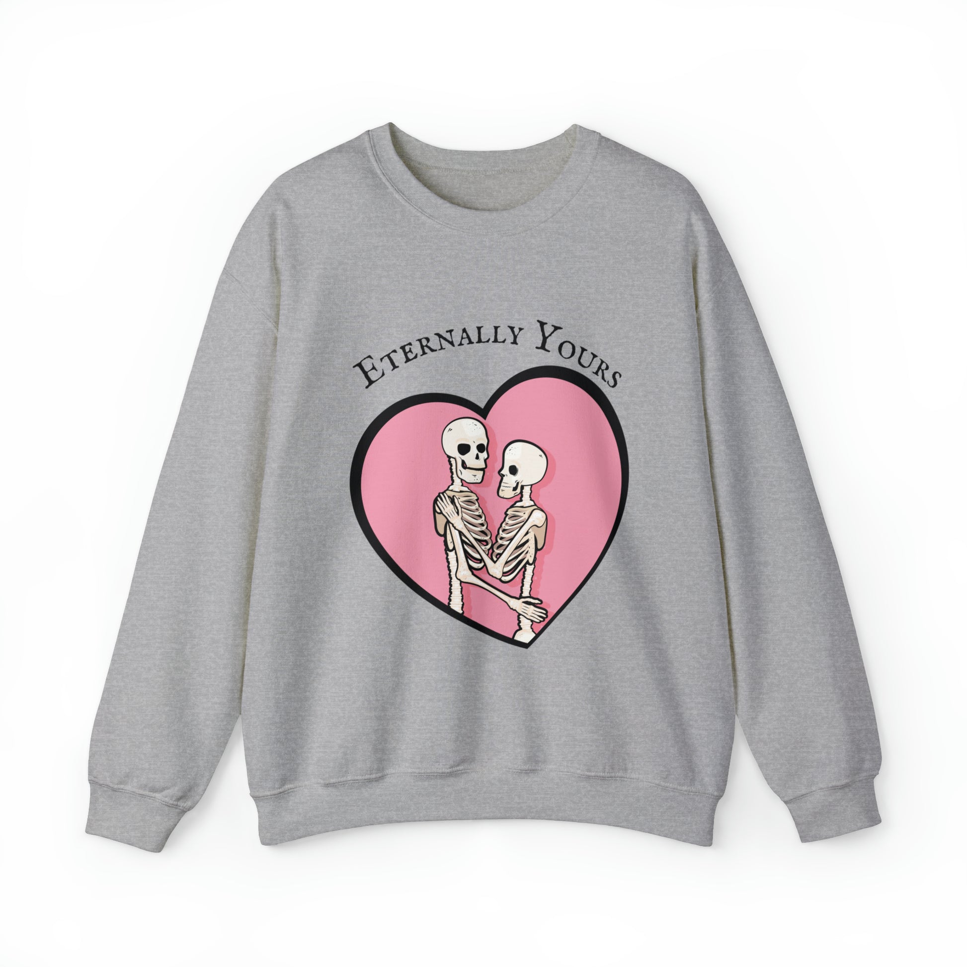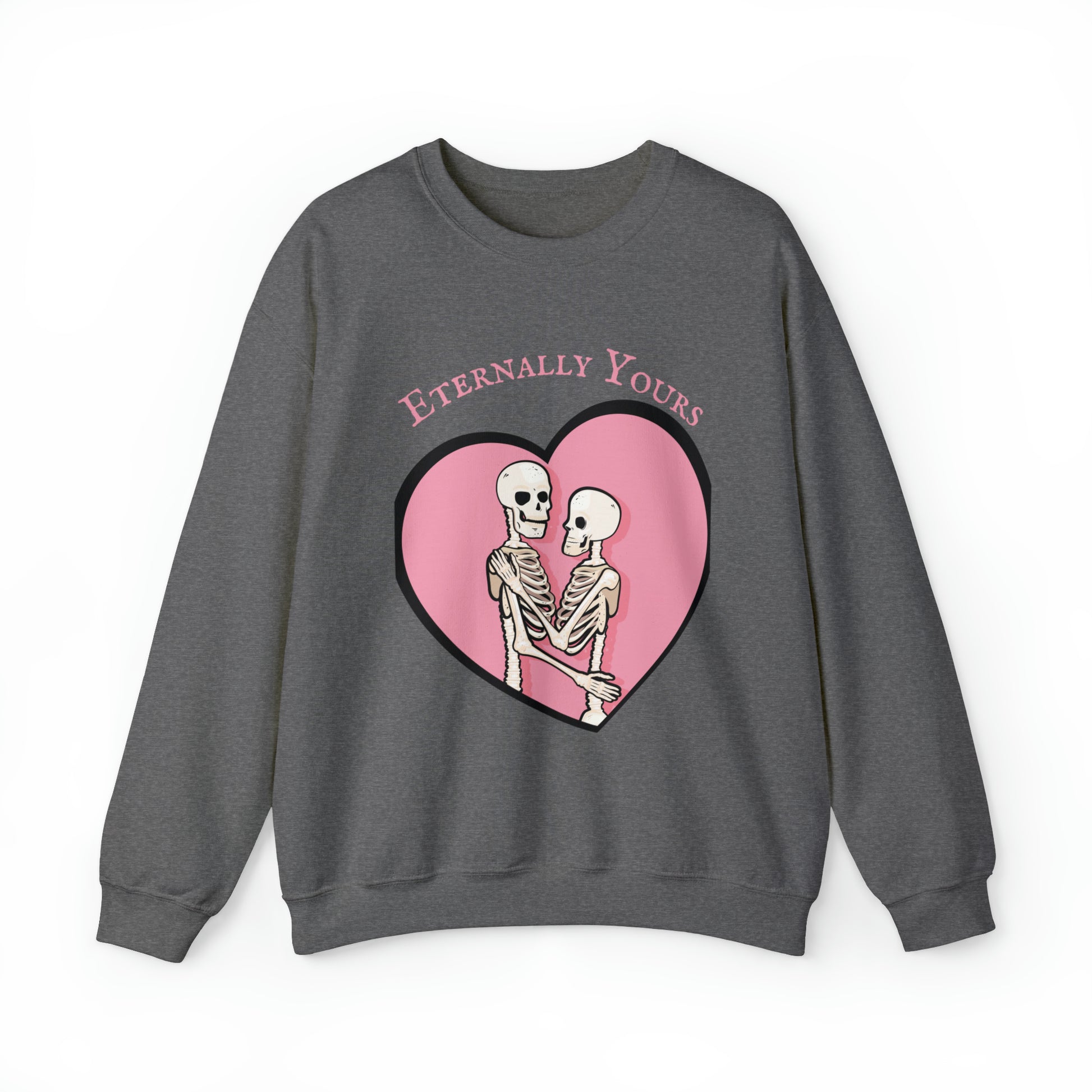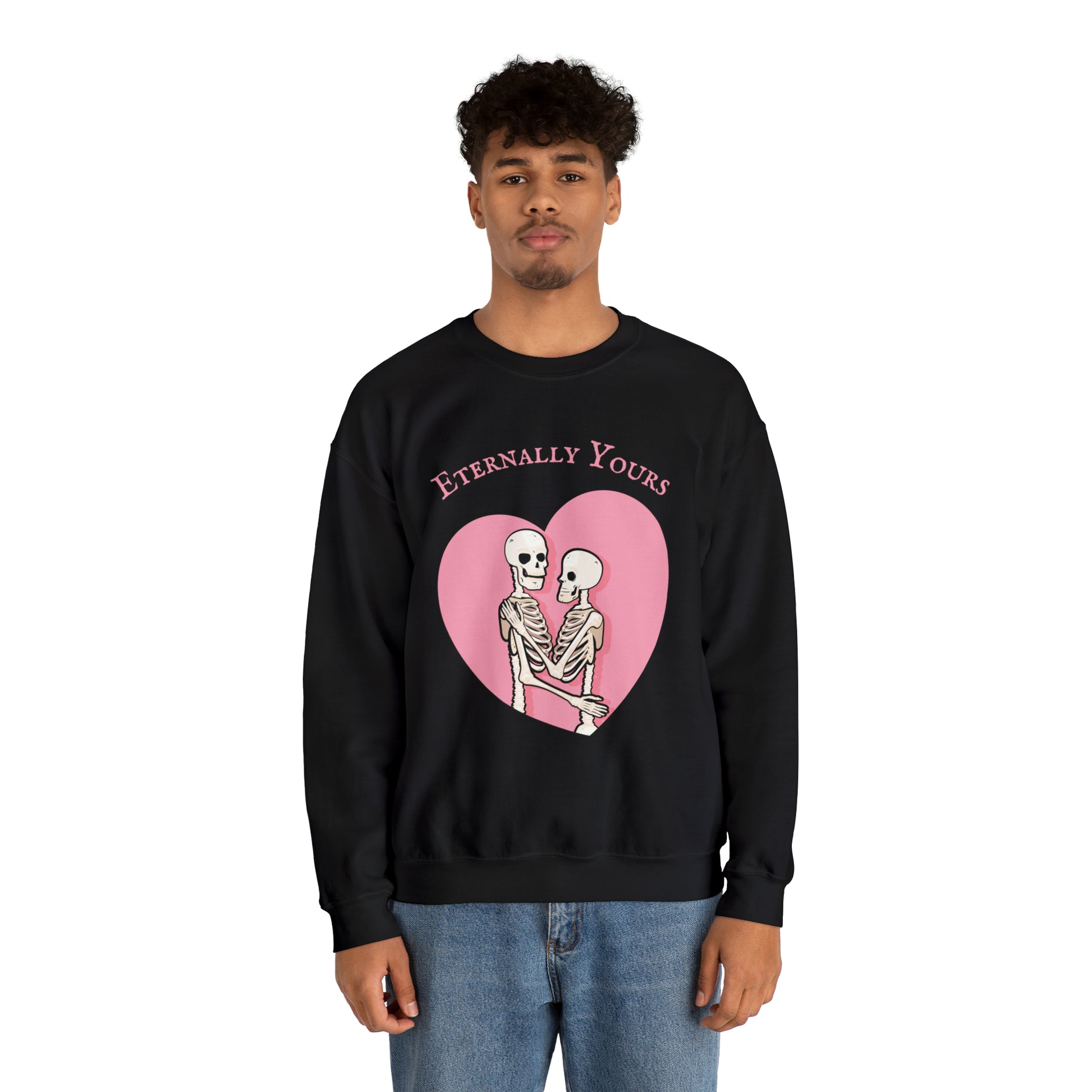 This 'Eternally Yours' Halloween Love sweatshirt is the perfect spooky gift for your favorite sweetheart. Show your Boo that your love is un-d(e)athable with this sweatshirt that features two skeletons embracing and a punny phrase for an extra spooky touch!