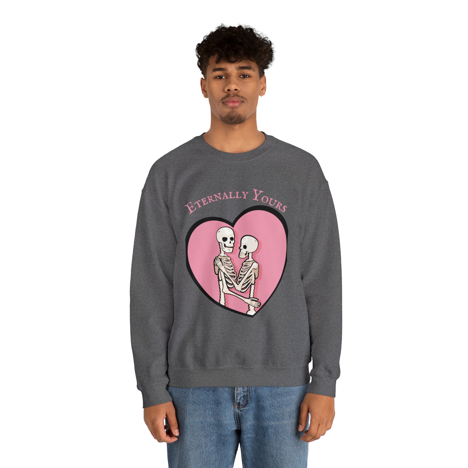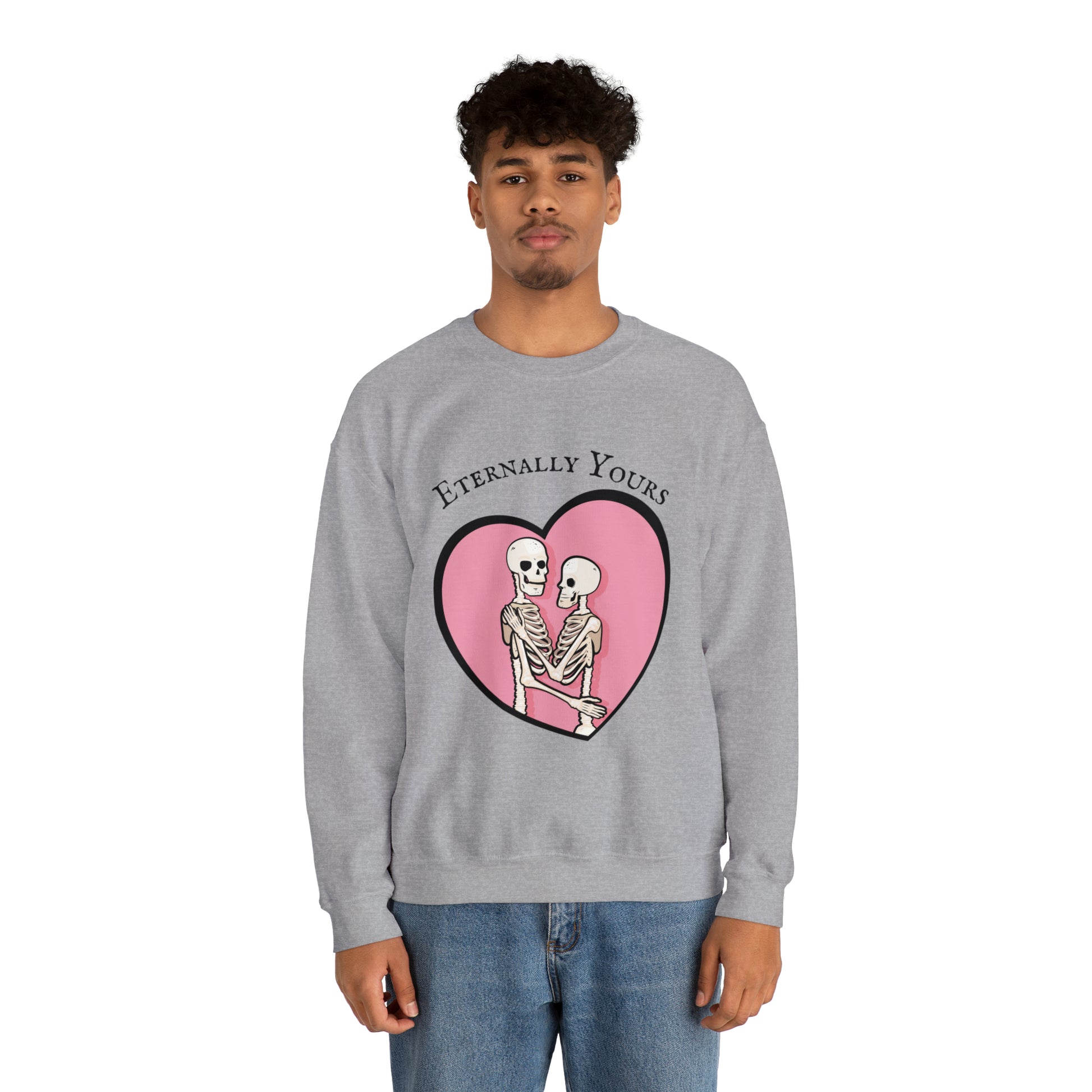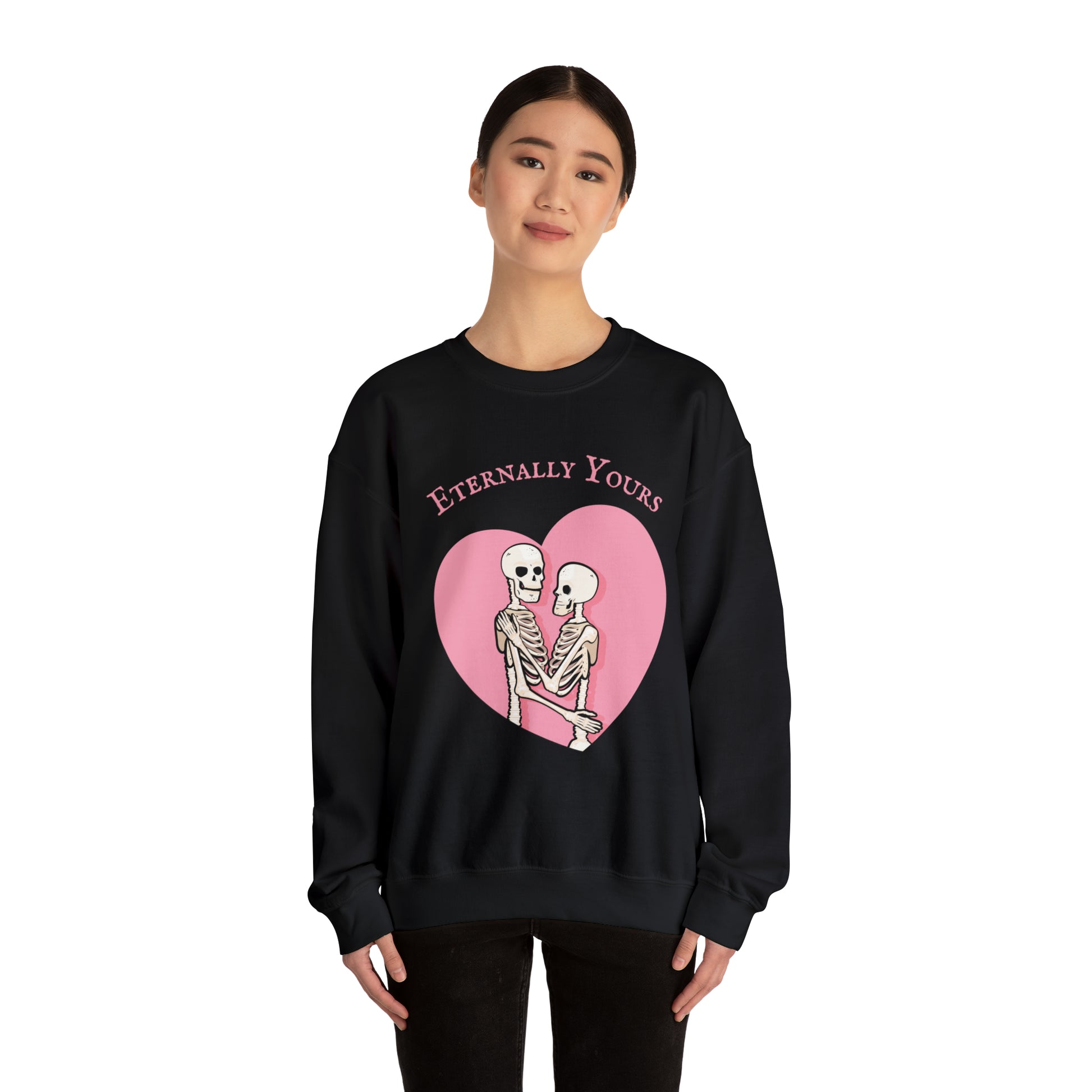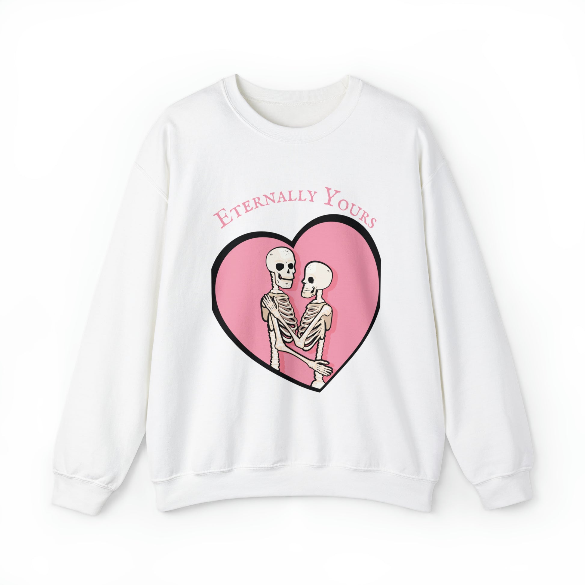 This 'Eternally Yours' Halloween Love sweatshirt is the perfect spooky gift for your favorite sweetheart. Show your Boo that your love is un-d(e)athable with this sweatshirt that features two skeletons embracing and a punny phrase for an extra spooky touch!