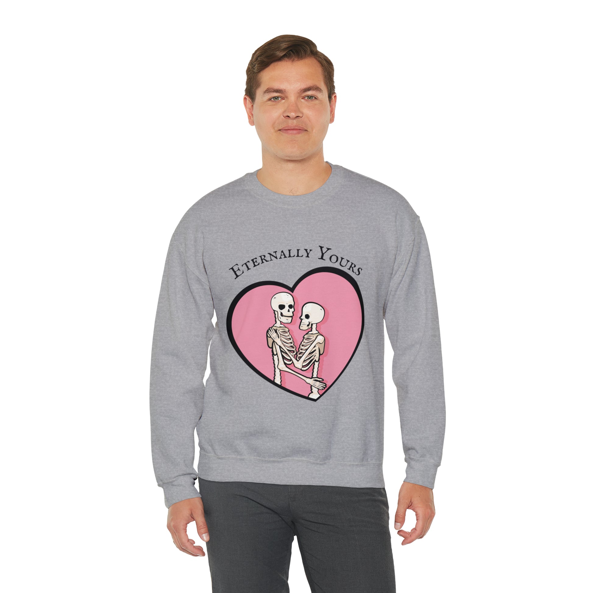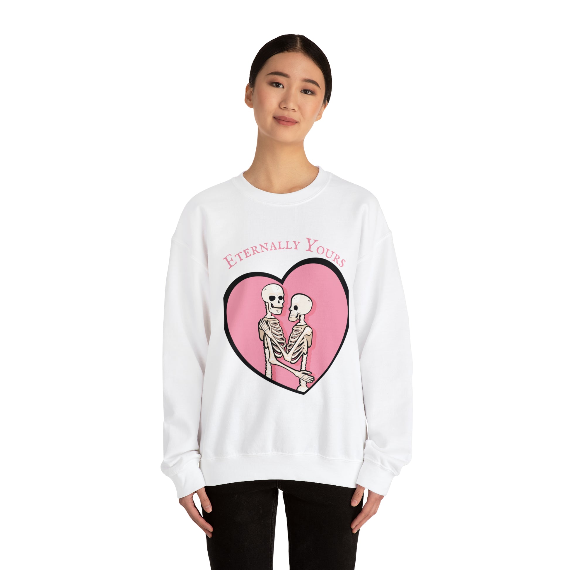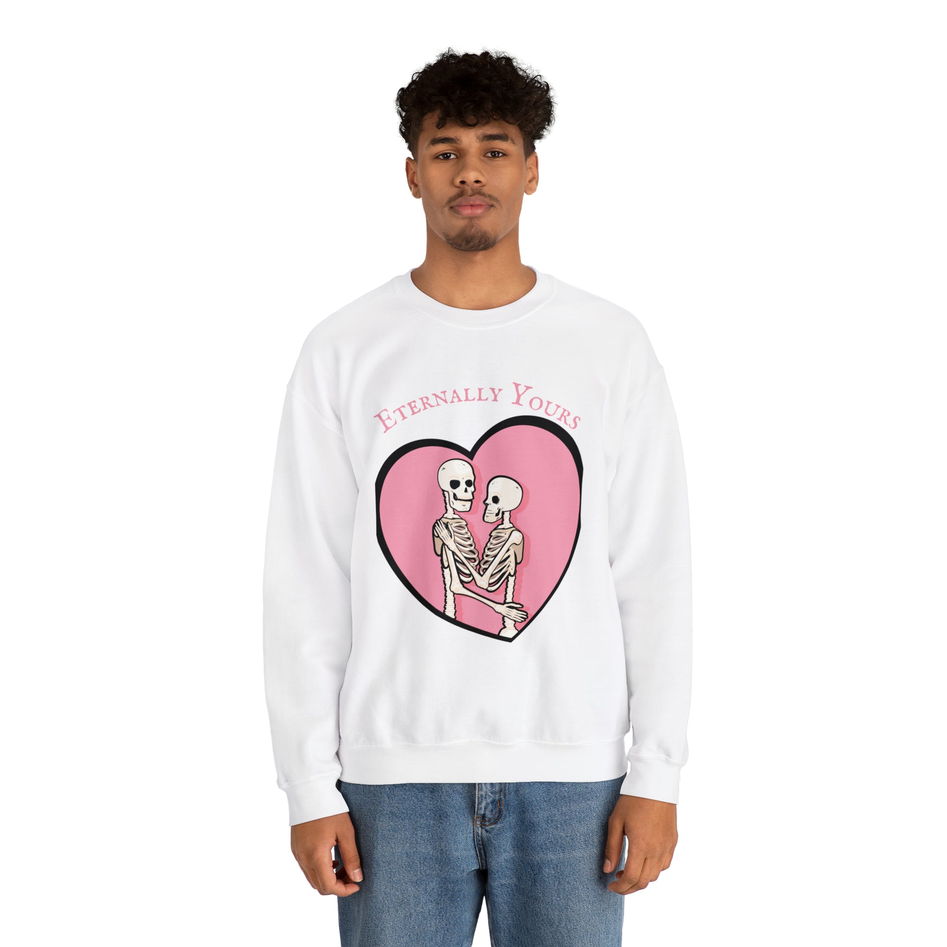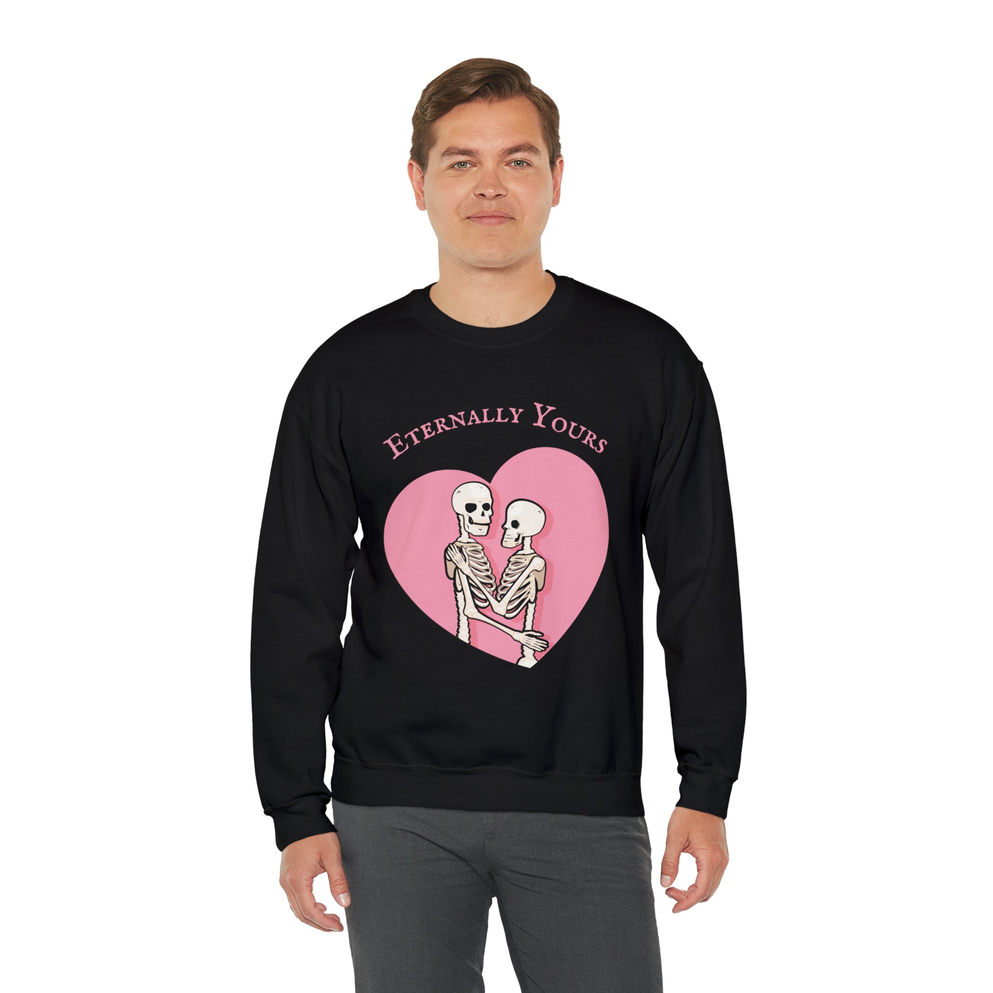 This 'Eternally Yours' Halloween Love sweatshirt is the perfect spooky gift for your favorite sweetheart. Show your Boo that your love is un-d(e)athable with this sweatshirt that features two skeletons embracing and a punny phrase for an extra spooky touch!