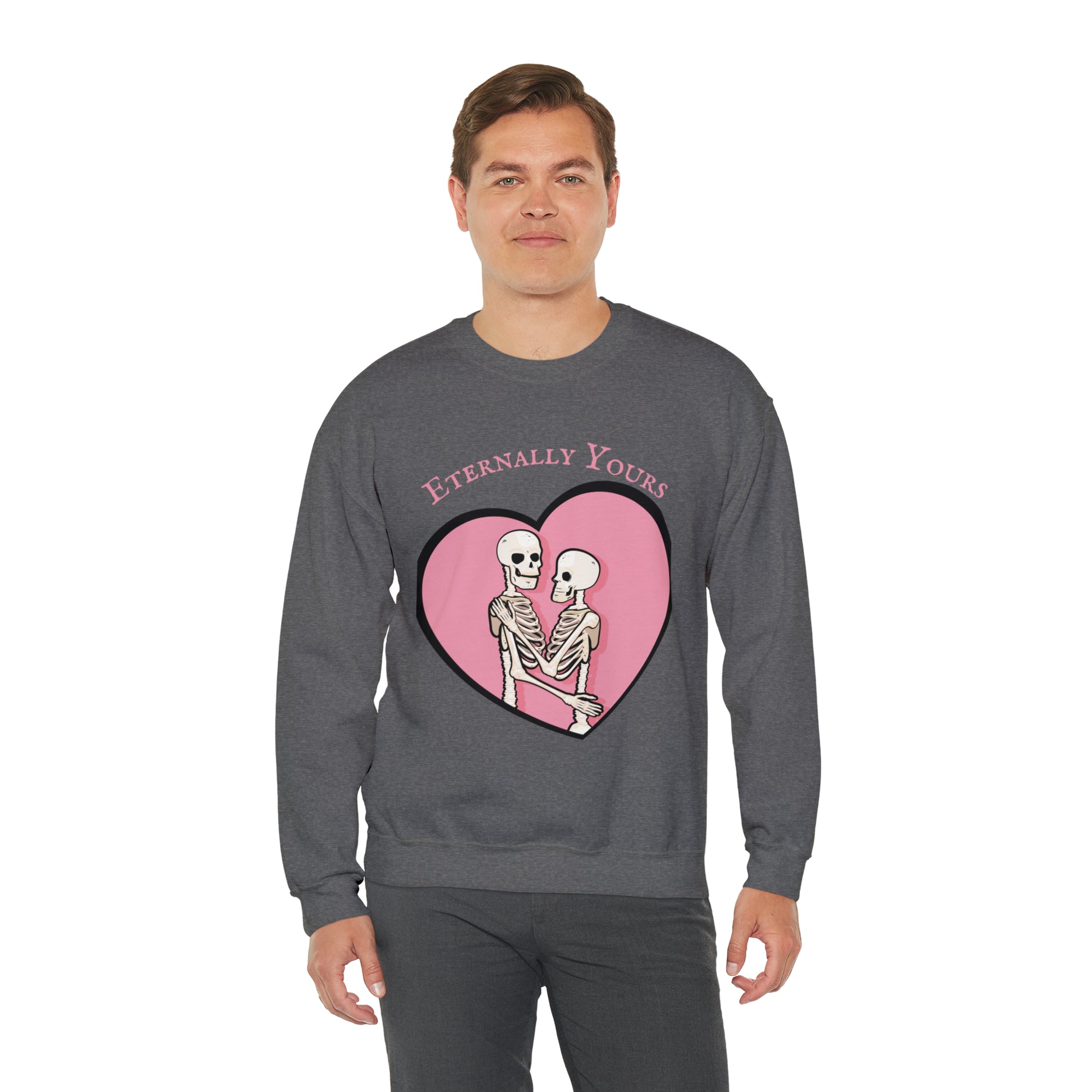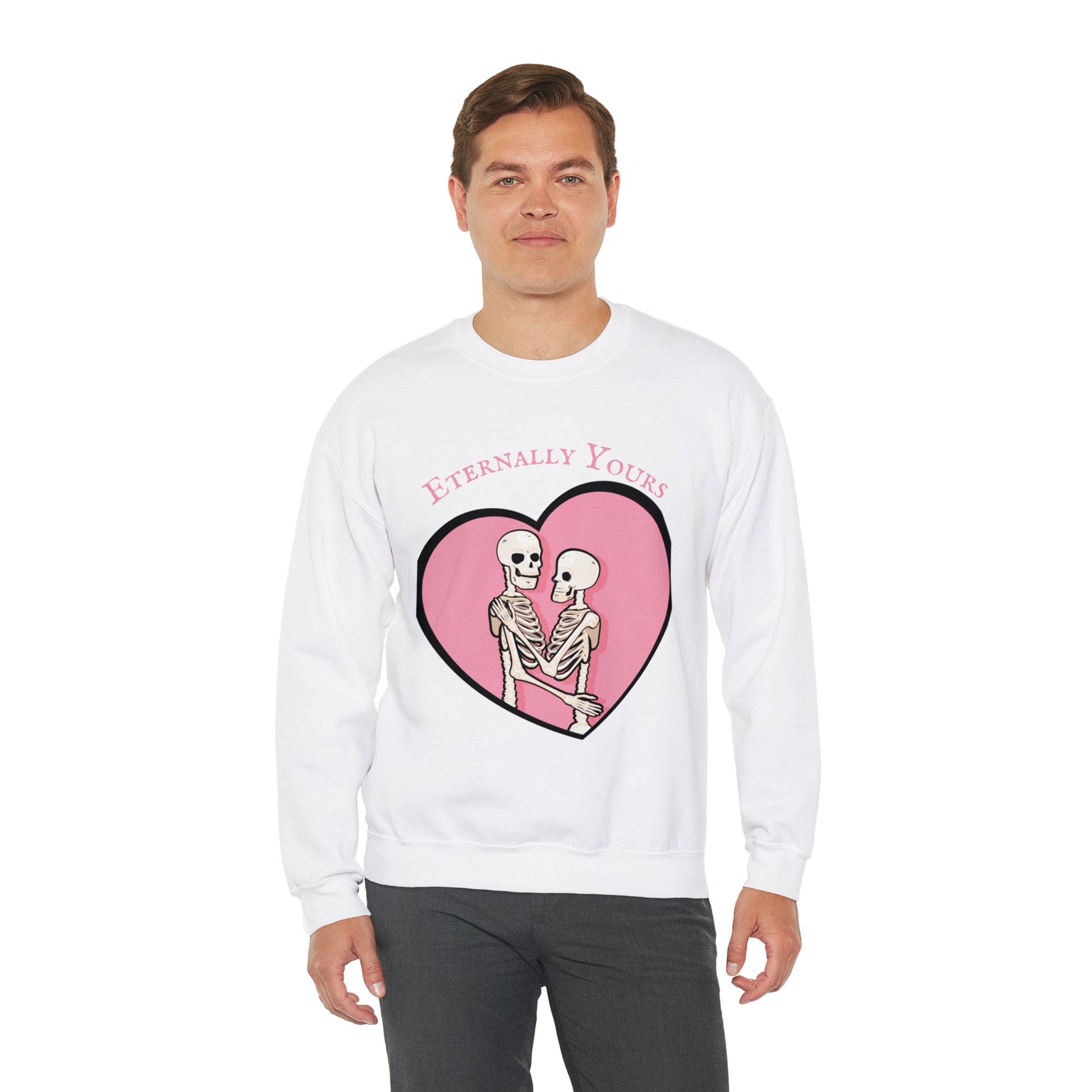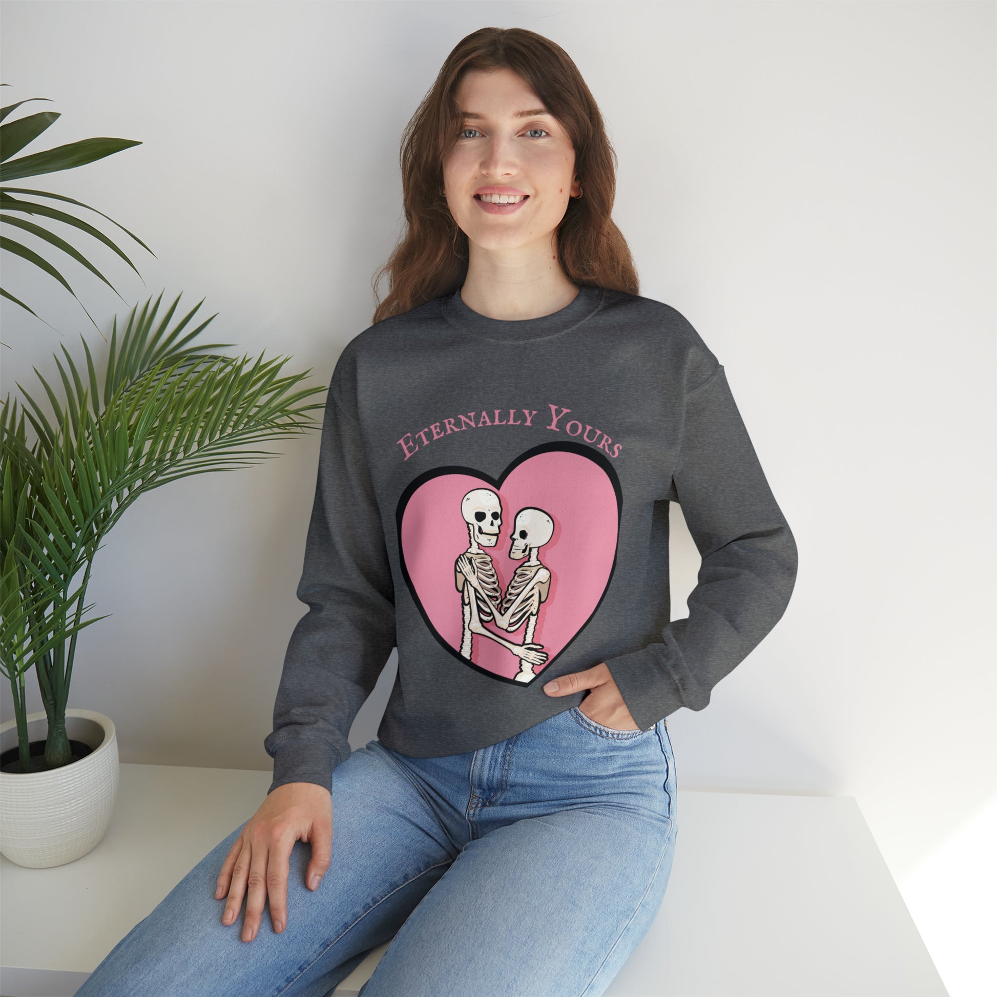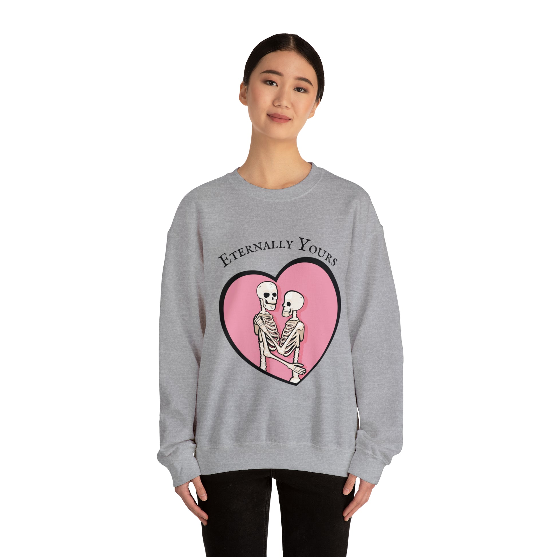 This 'Eternally Yours' Halloween Love sweatshirt is the perfect spooky gift for your favorite sweetheart. Show your Boo that your love is un-d(e)athable with this sweatshirt that features two skeletons embracing and a punny phrase for an extra spooky touch!