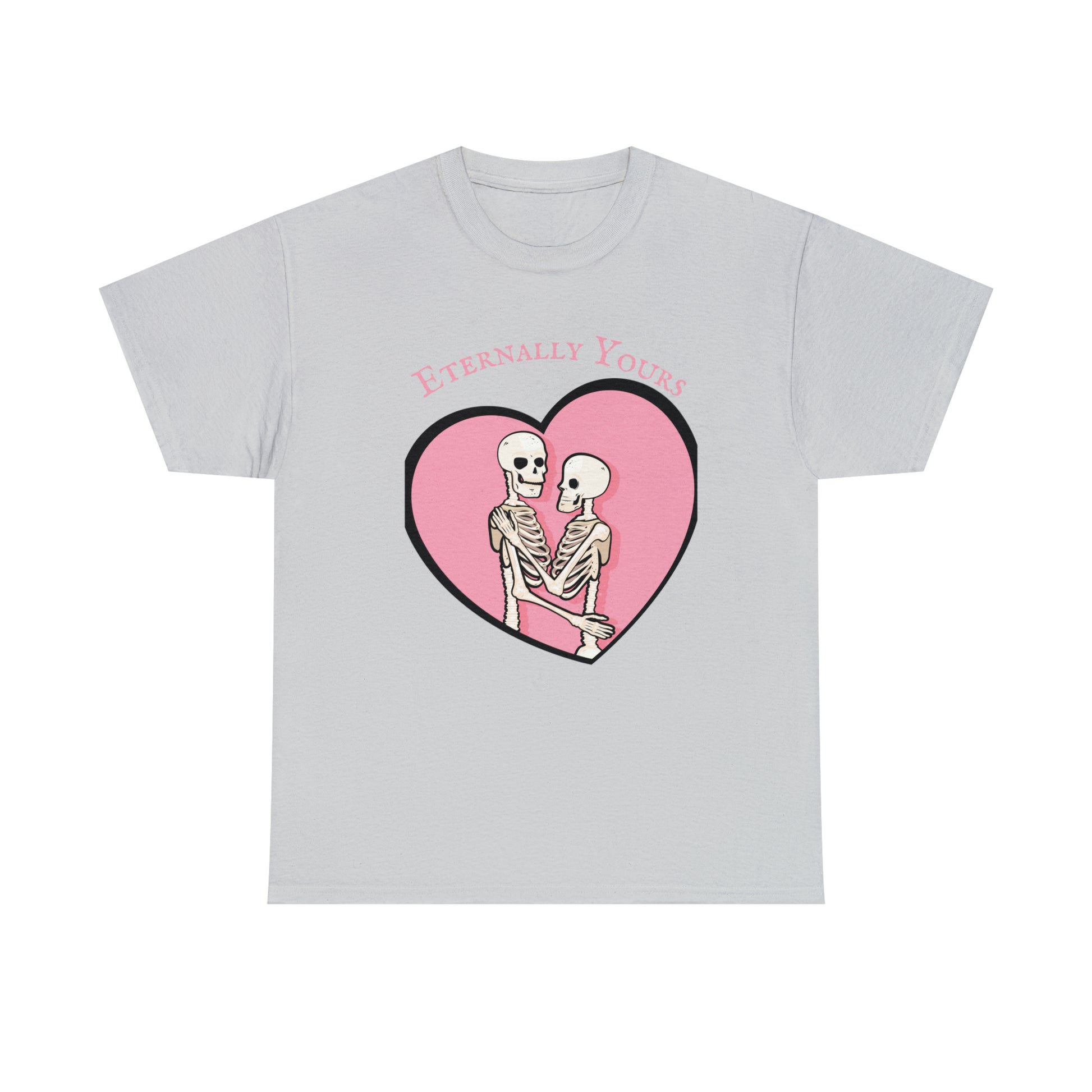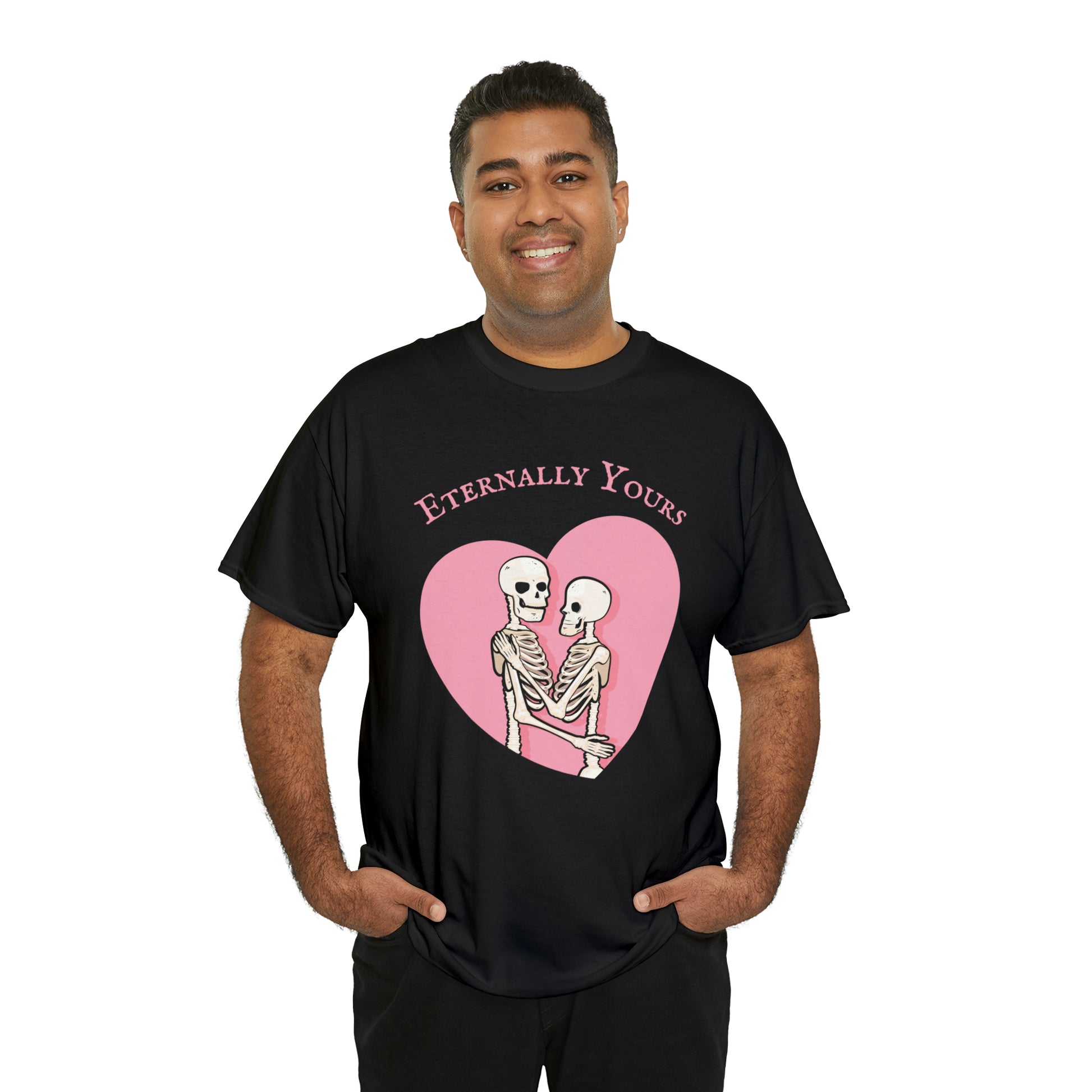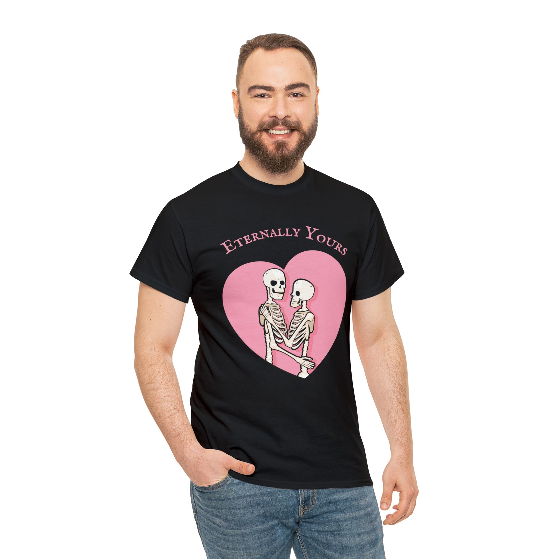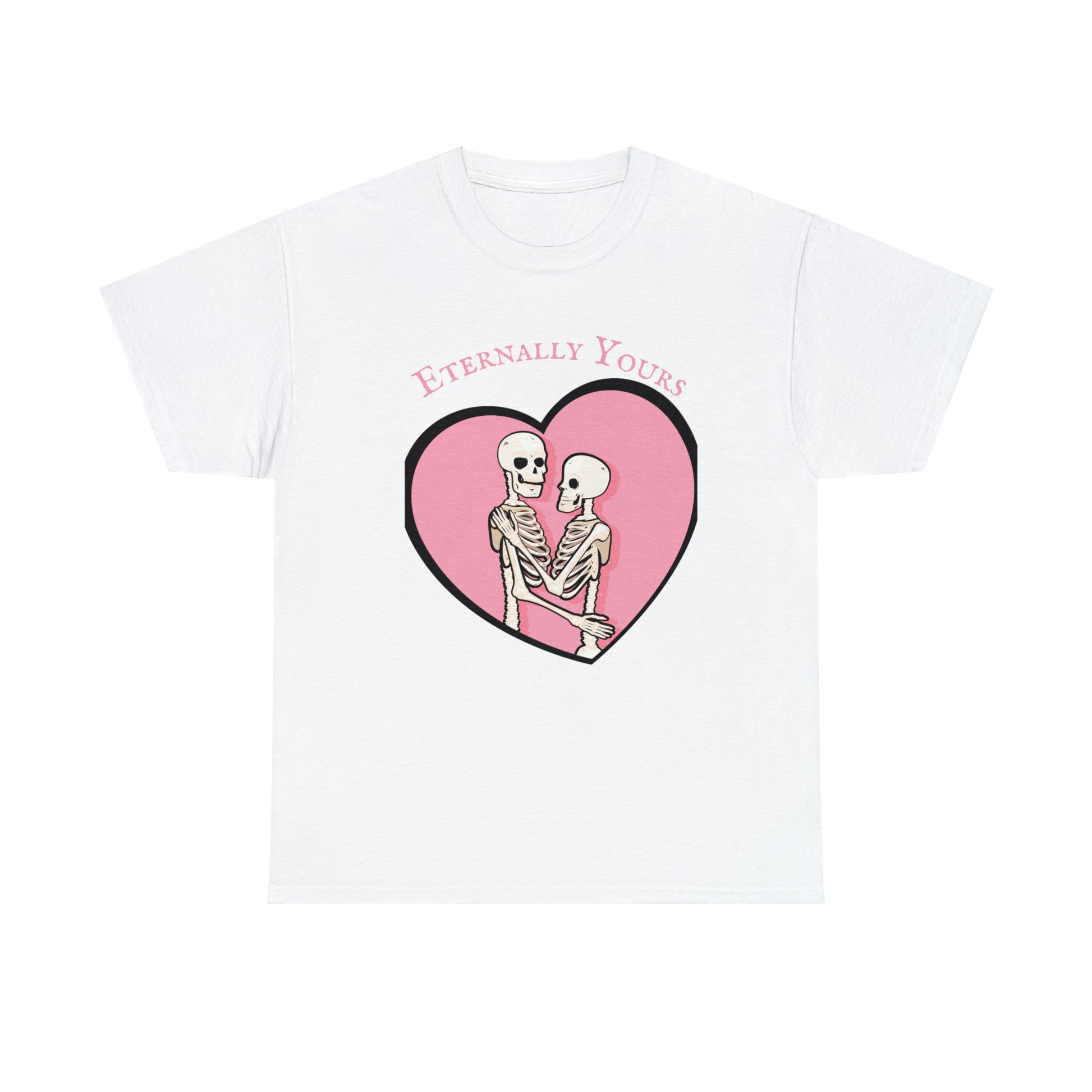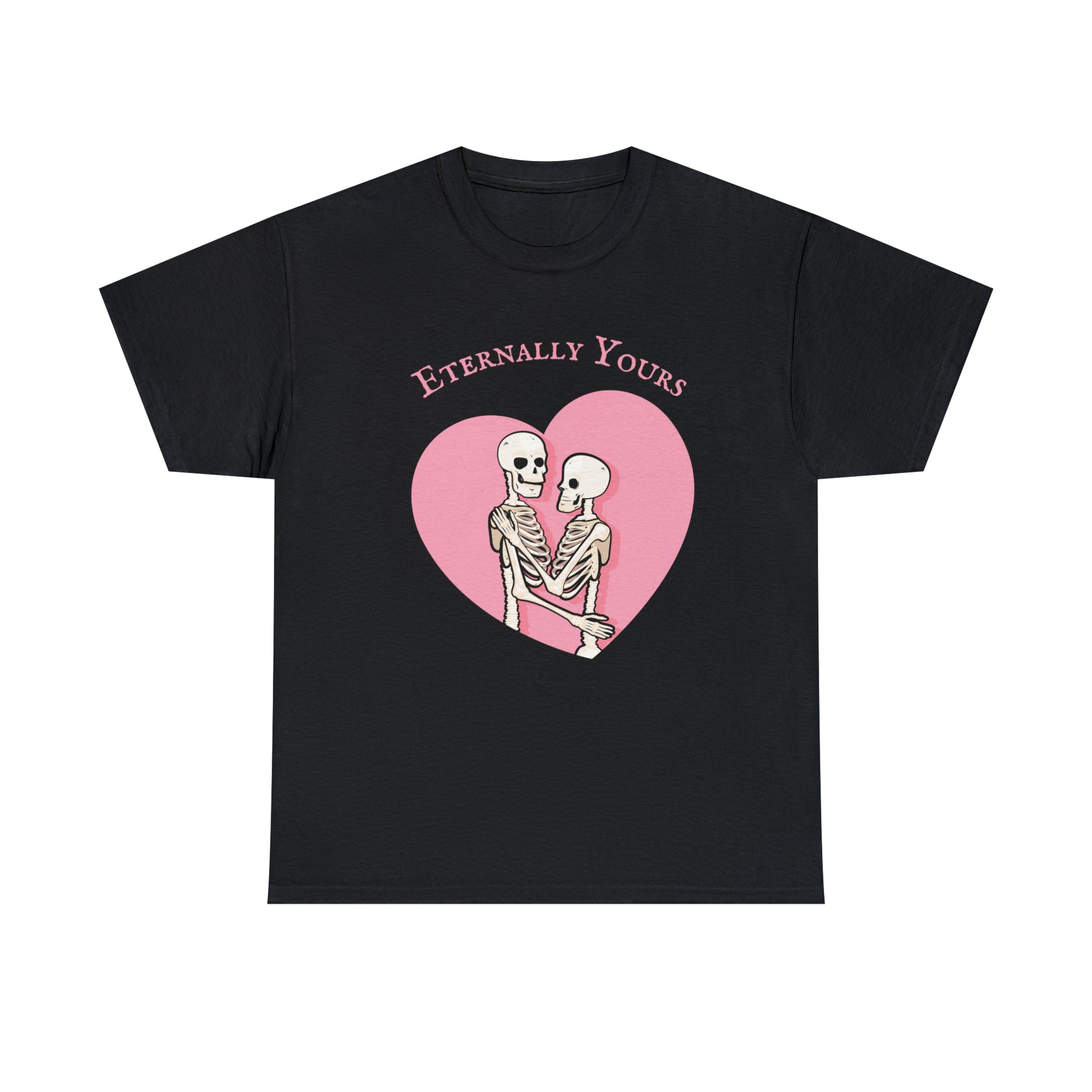 This 'Eternally Yours' Halloween Love T-Shirt is the perfect spooky gift for your favorite sweetheart. Show your Boo that your love is un-d(e)athable with this t-shirt that features two skeletons embracing and a punny phrase for an extra spooky touch!