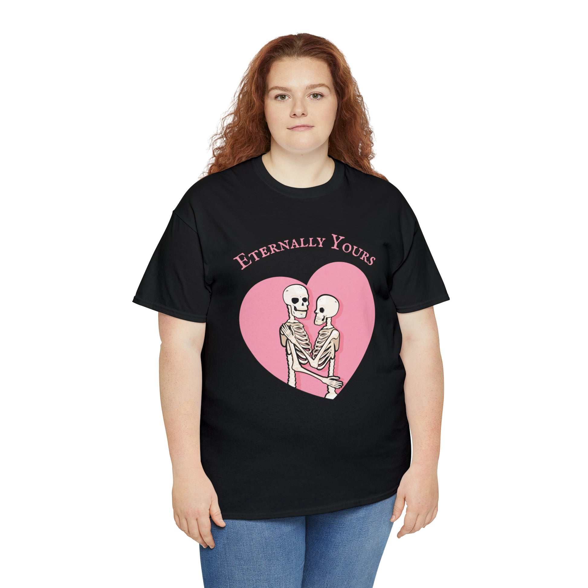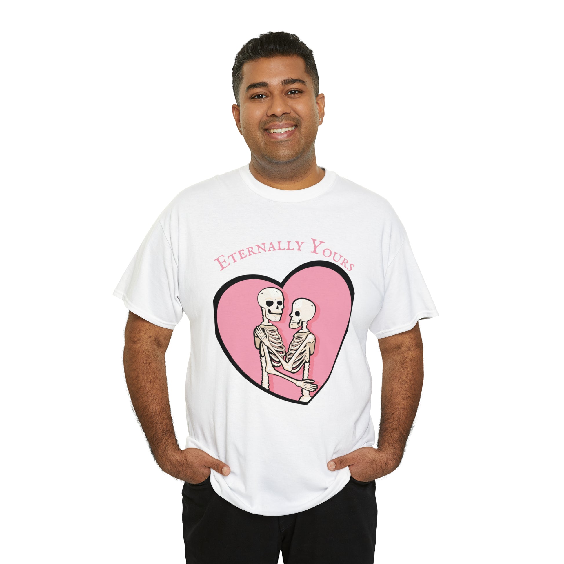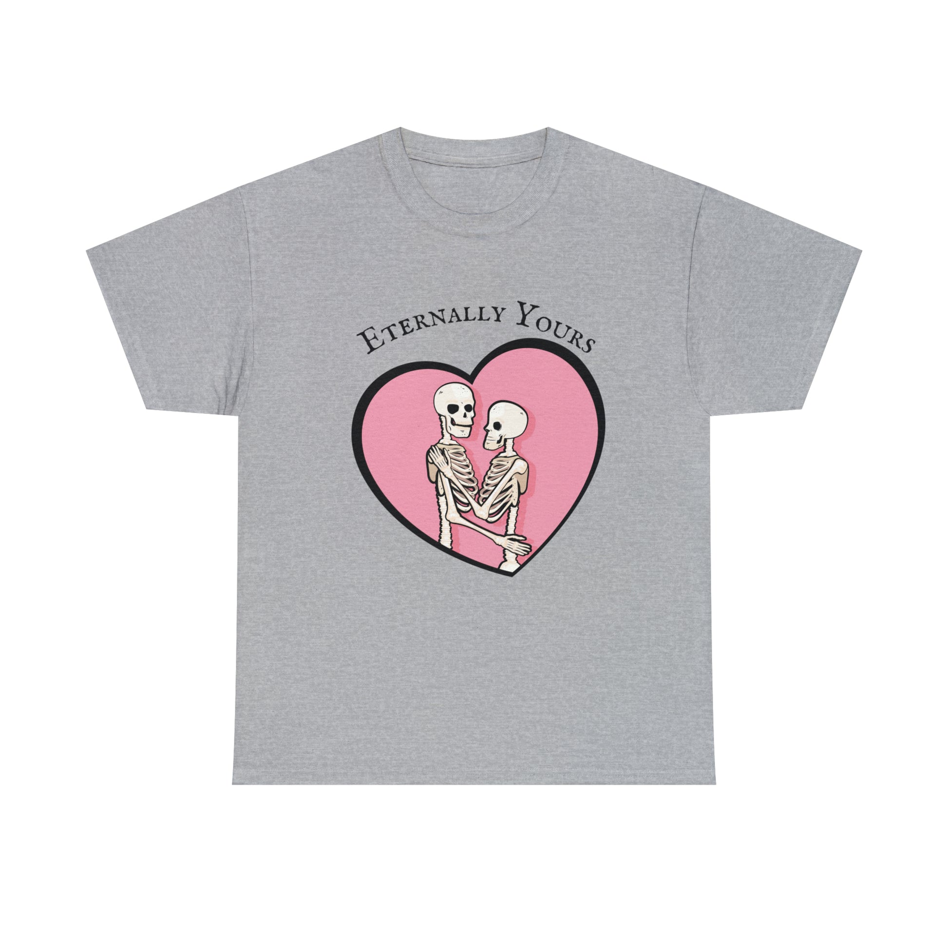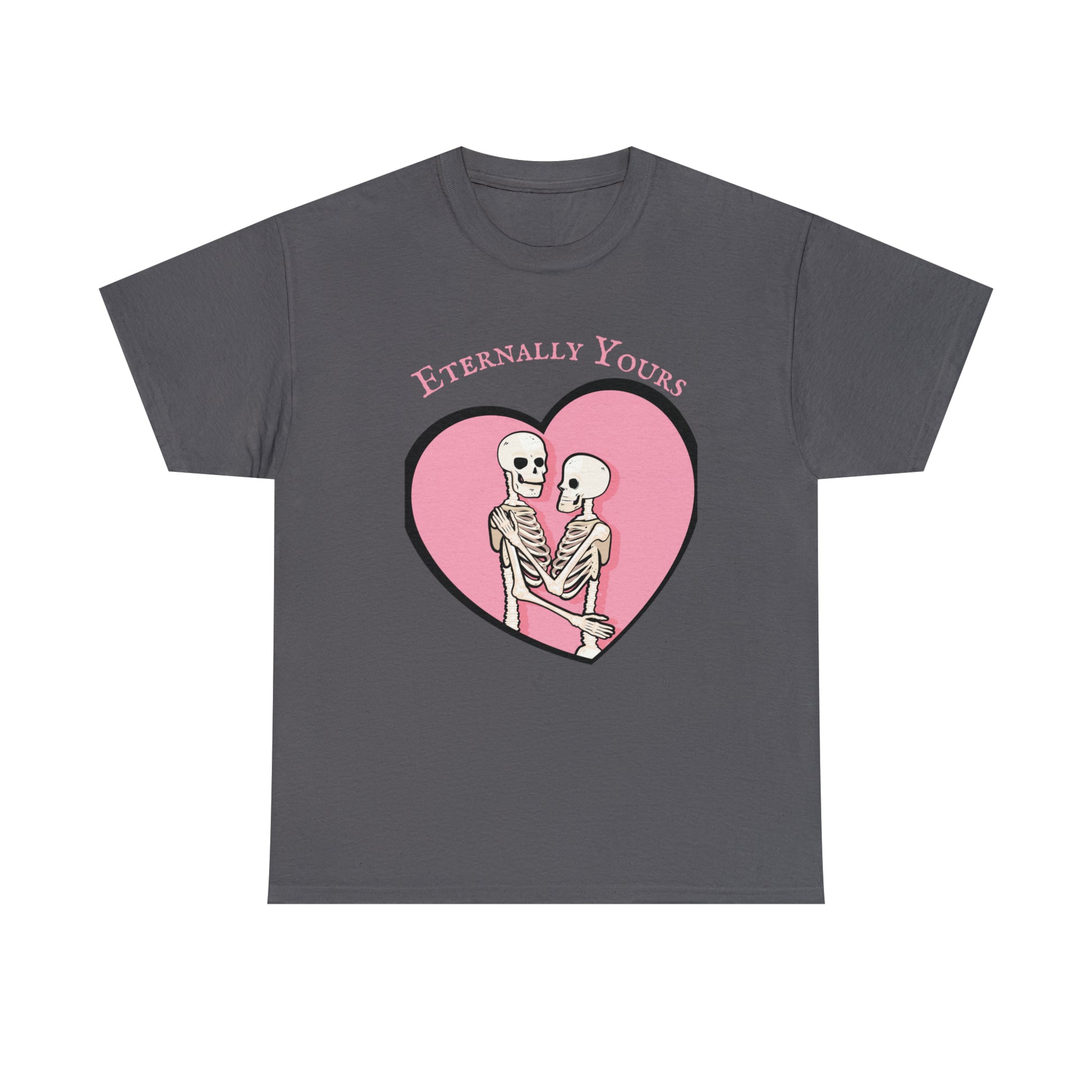 This 'Eternally Yours' Halloween Love T-Shirt is the perfect spooky gift for your favorite sweetheart. Show your Boo that your love is un-d(e)athable with this t-shirt that features two skeletons embracing and a punny phrase for an extra spooky touch!