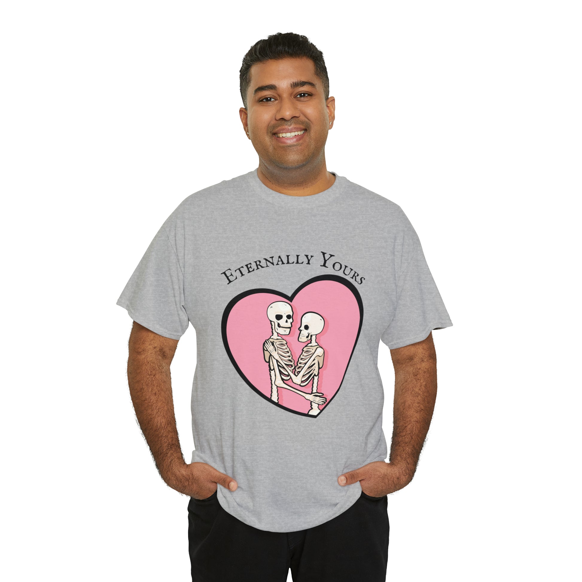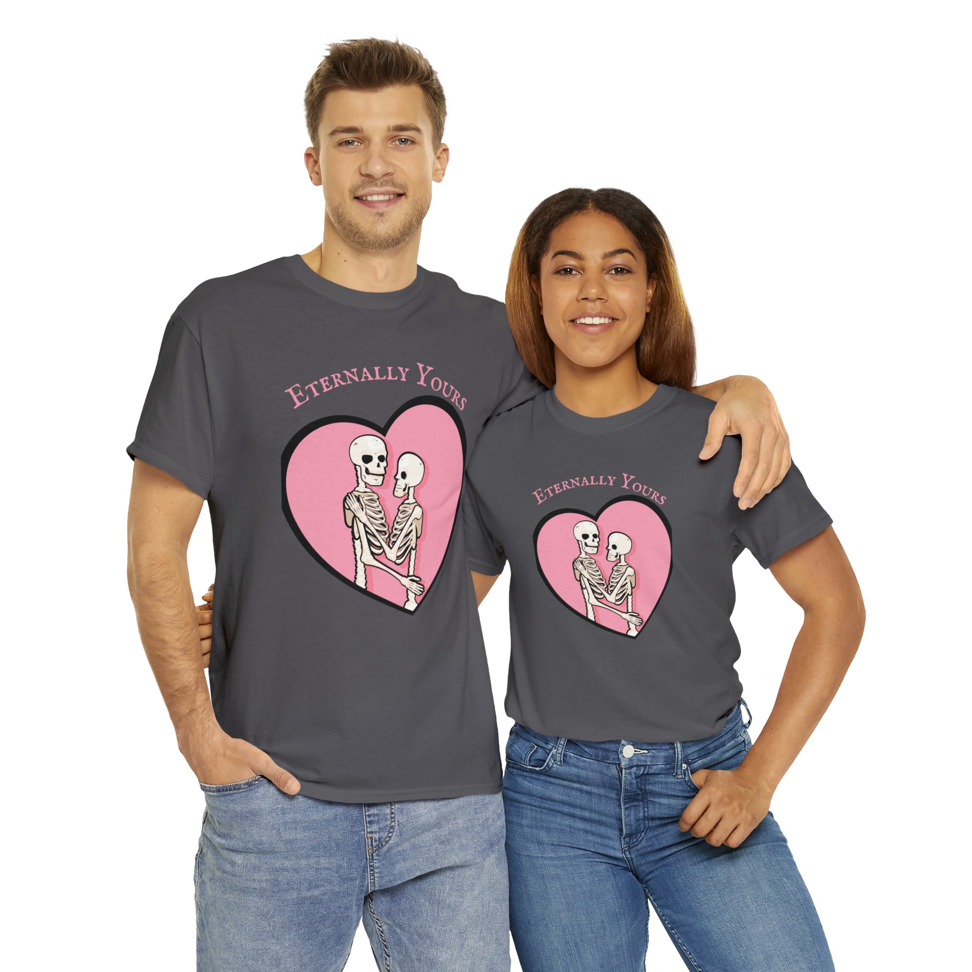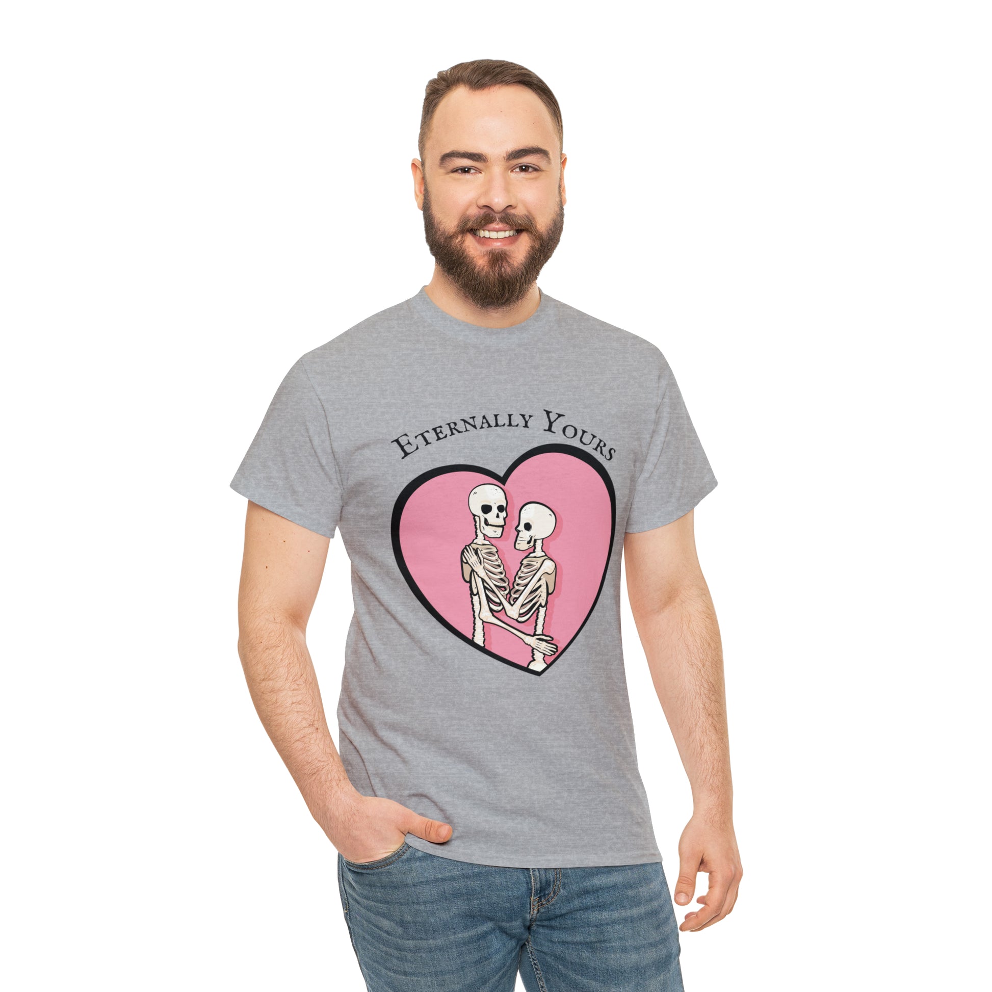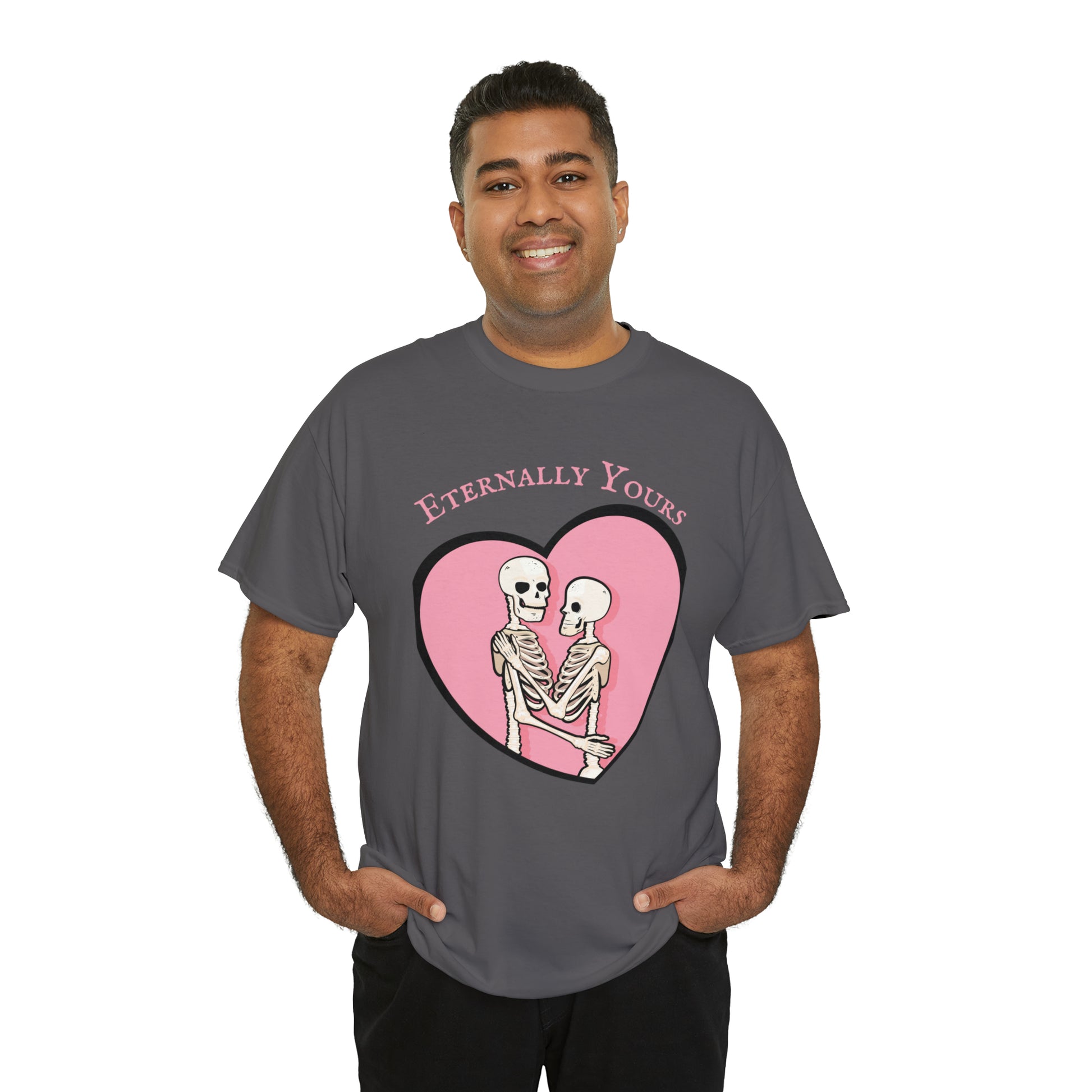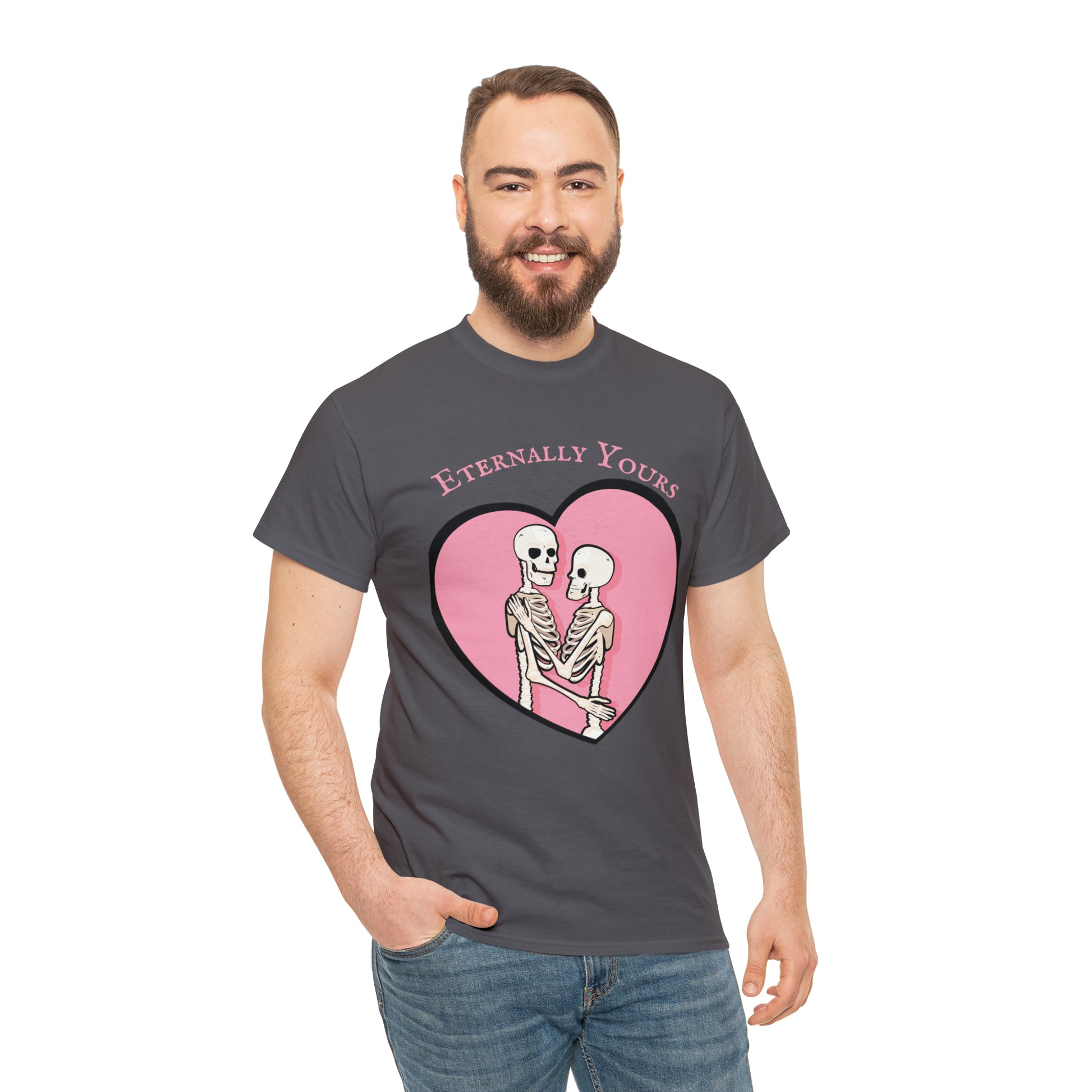 This 'Eternally Yours' Halloween Love T-Shirt is the perfect spooky gift for your favorite sweetheart. Show your Boo that your love is un-d(e)athable with this t-shirt that features two skeletons embracing and a punny phrase for an extra spooky touch!