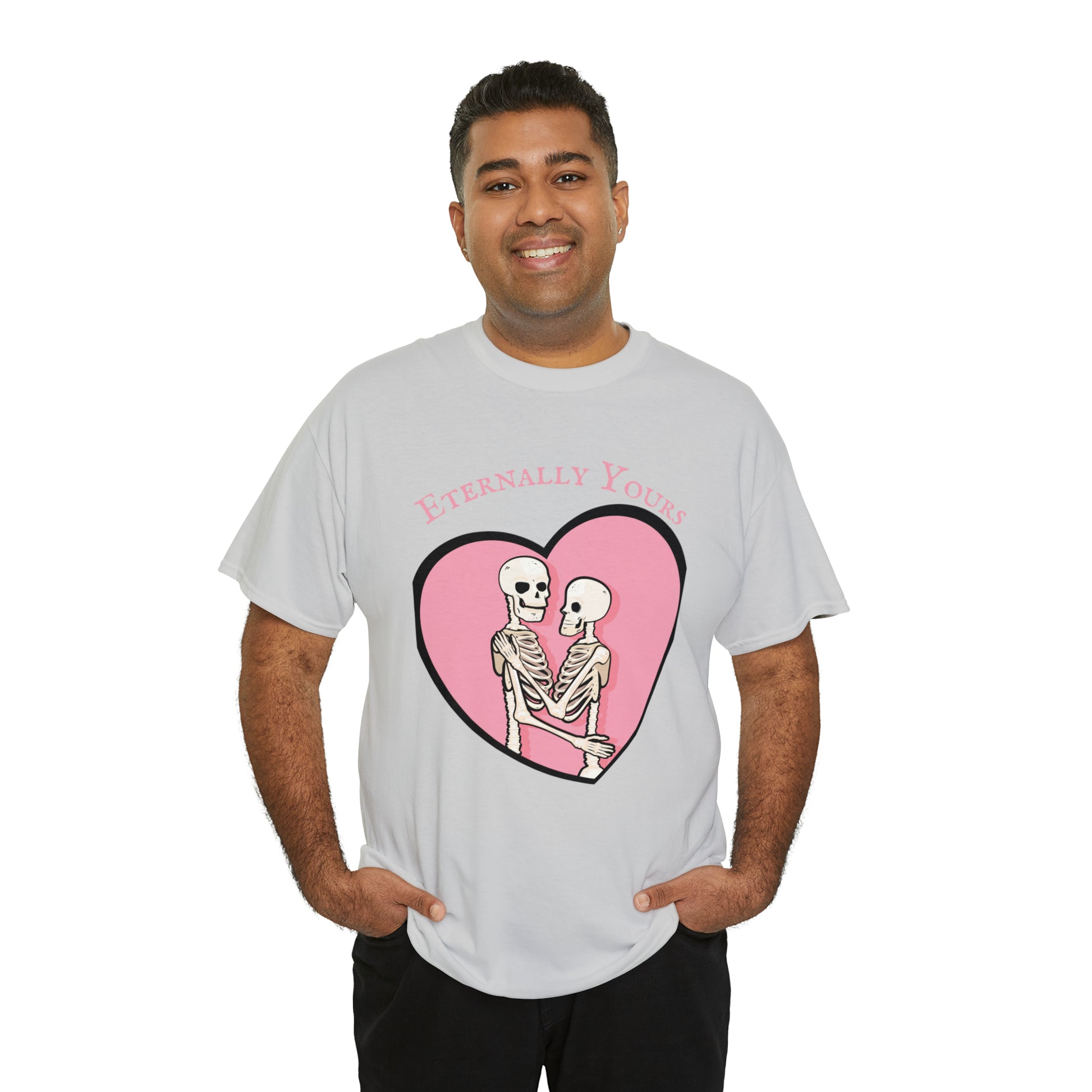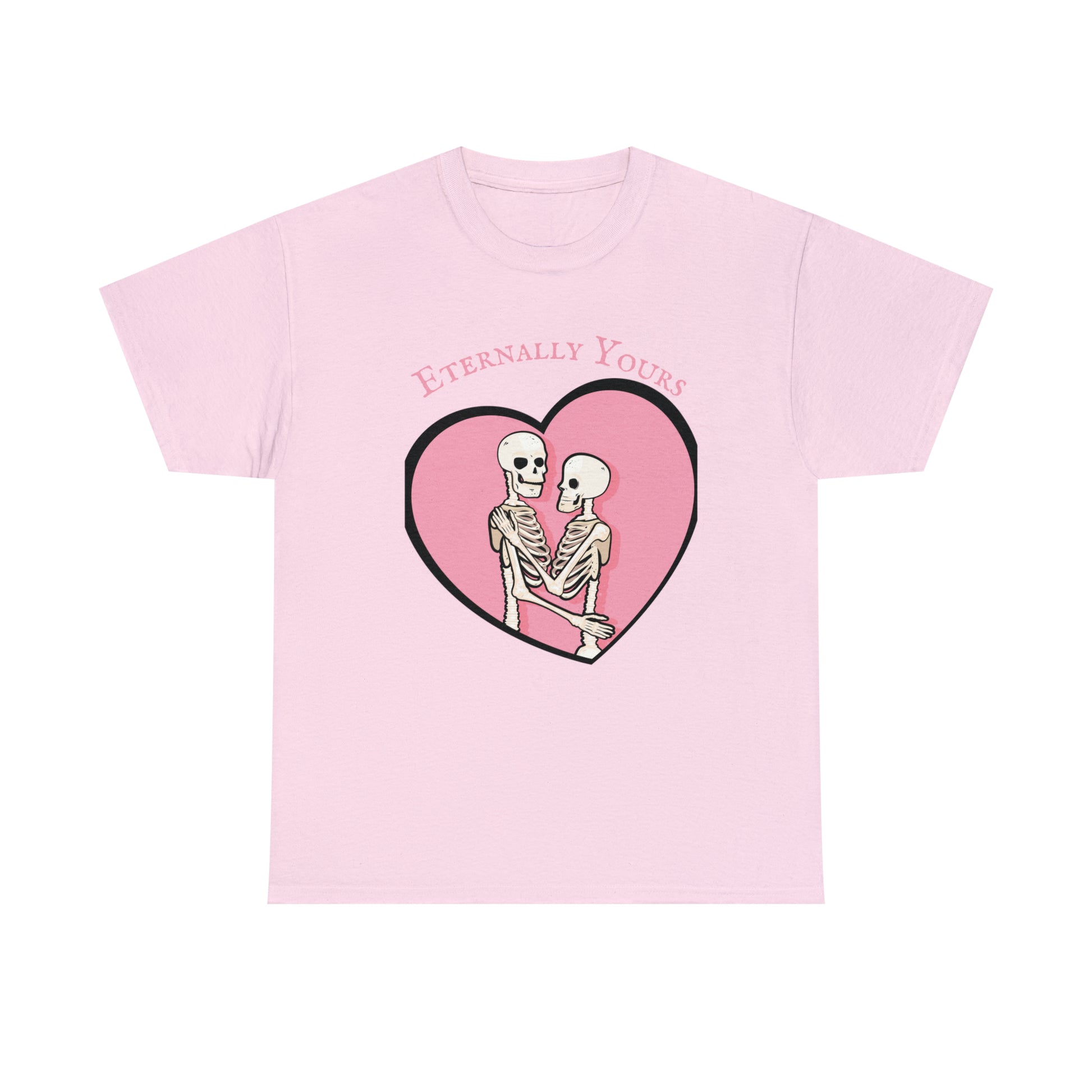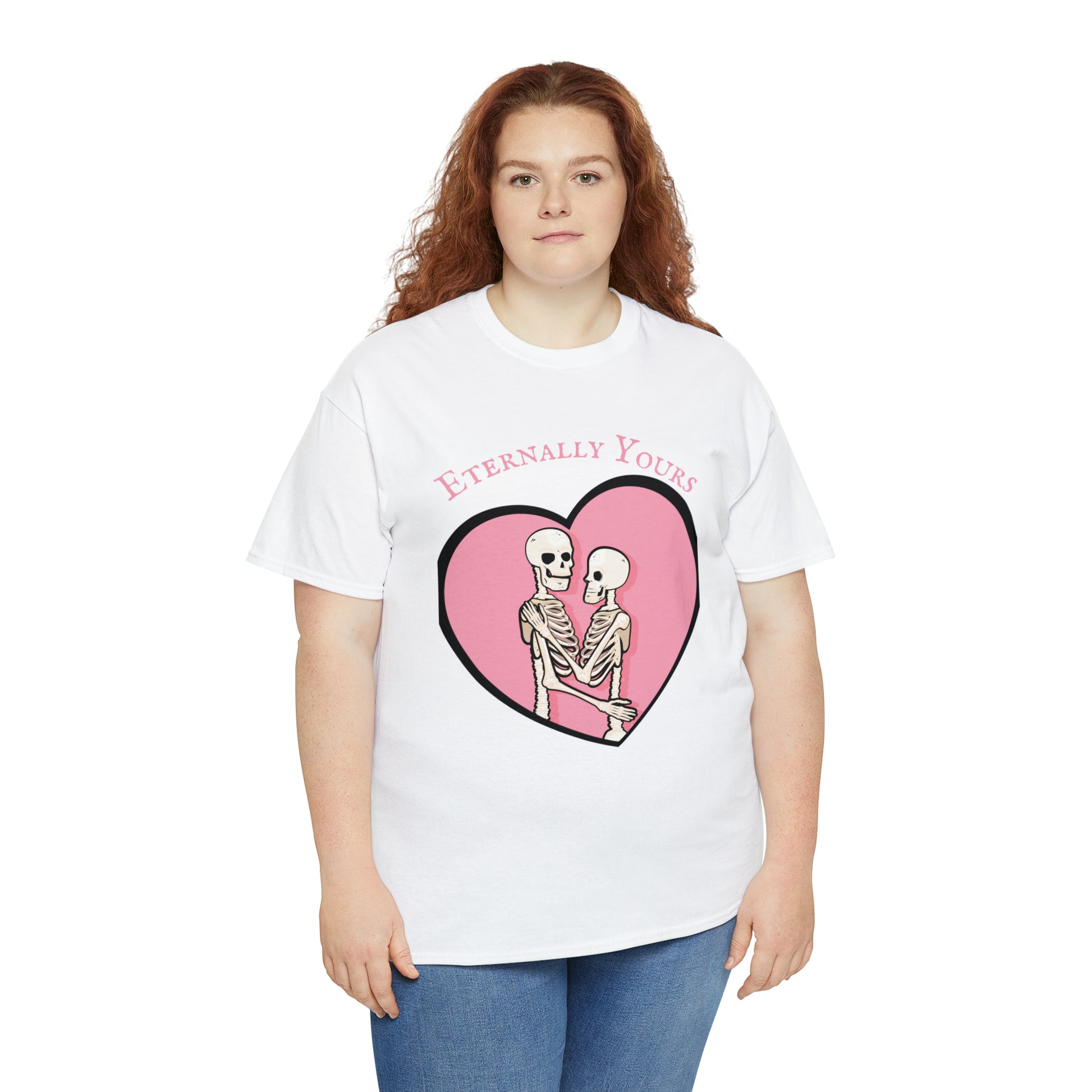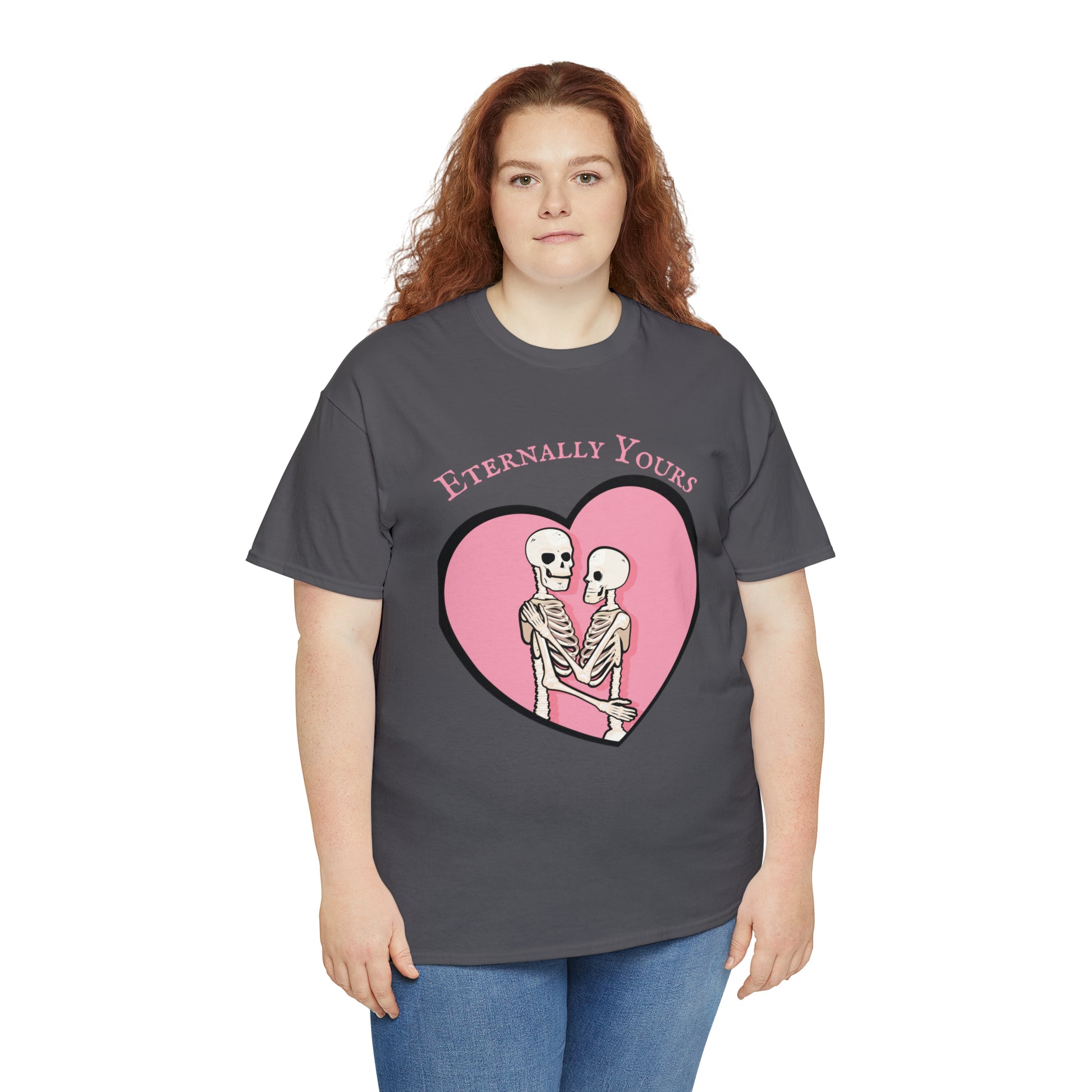 This 'Eternally Yours' Halloween Love T-Shirt is the perfect spooky gift for your favorite sweetheart. Show your Boo that your love is un-d(e)athable with this t-shirt that features two skeletons embracing and a punny phrase for an extra spooky touch!