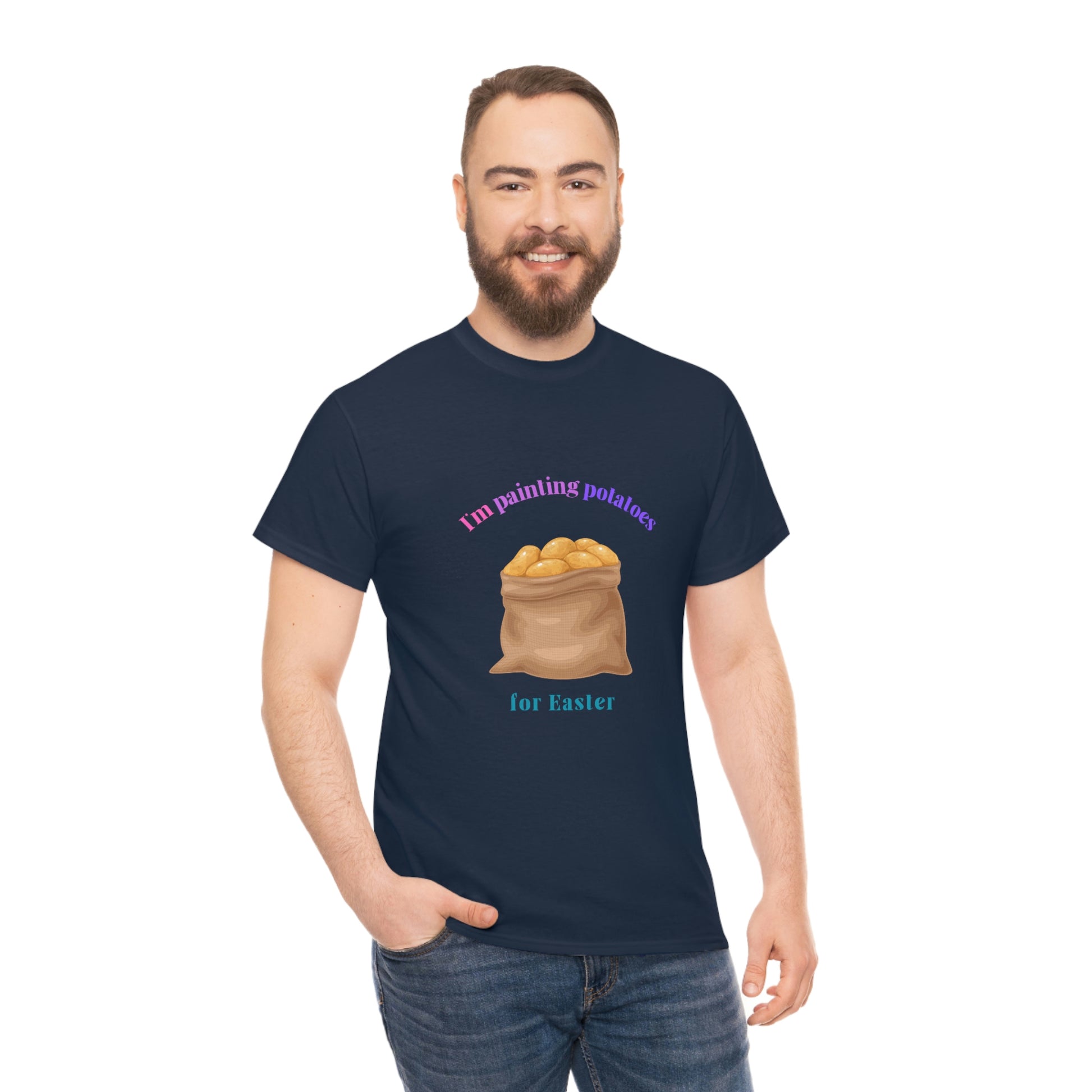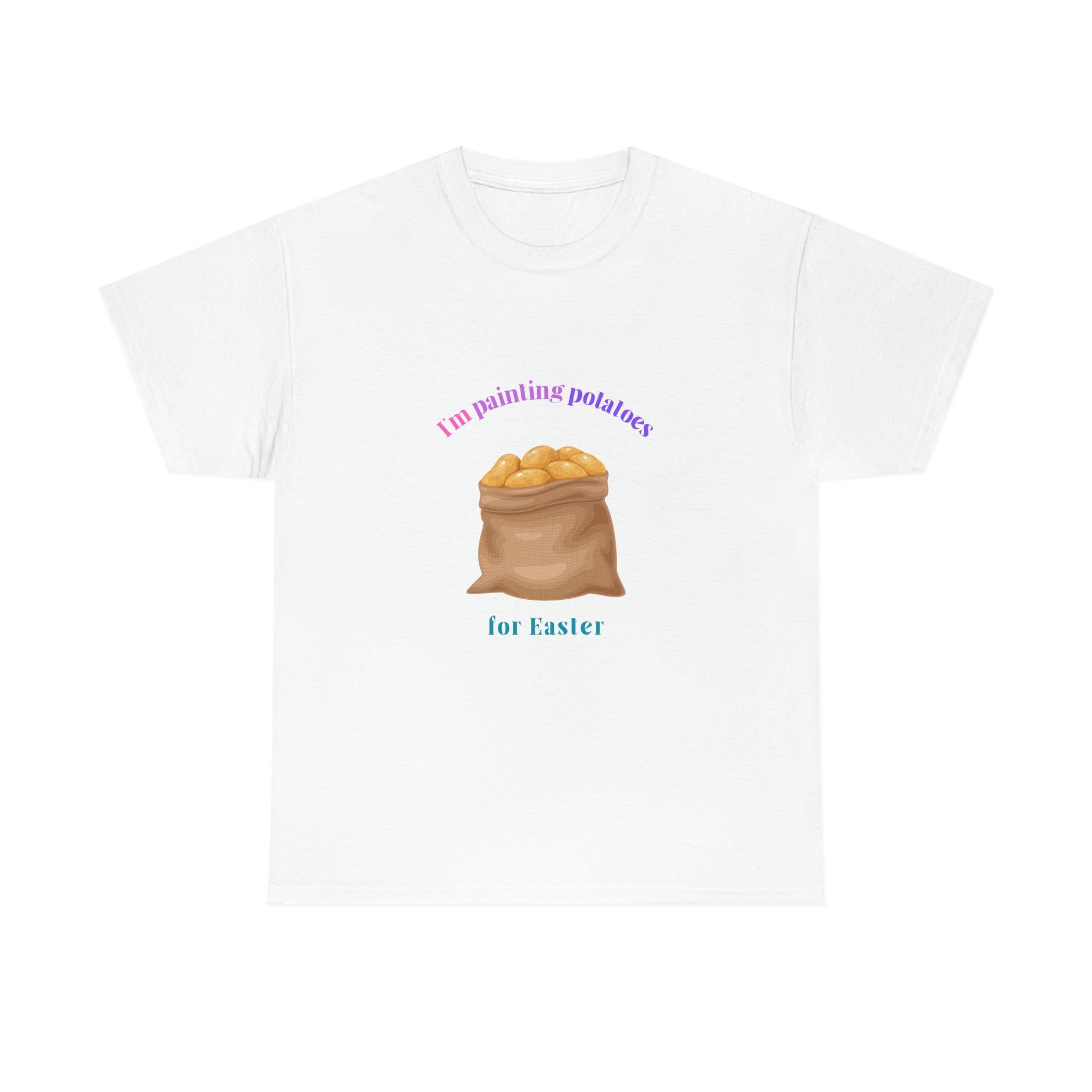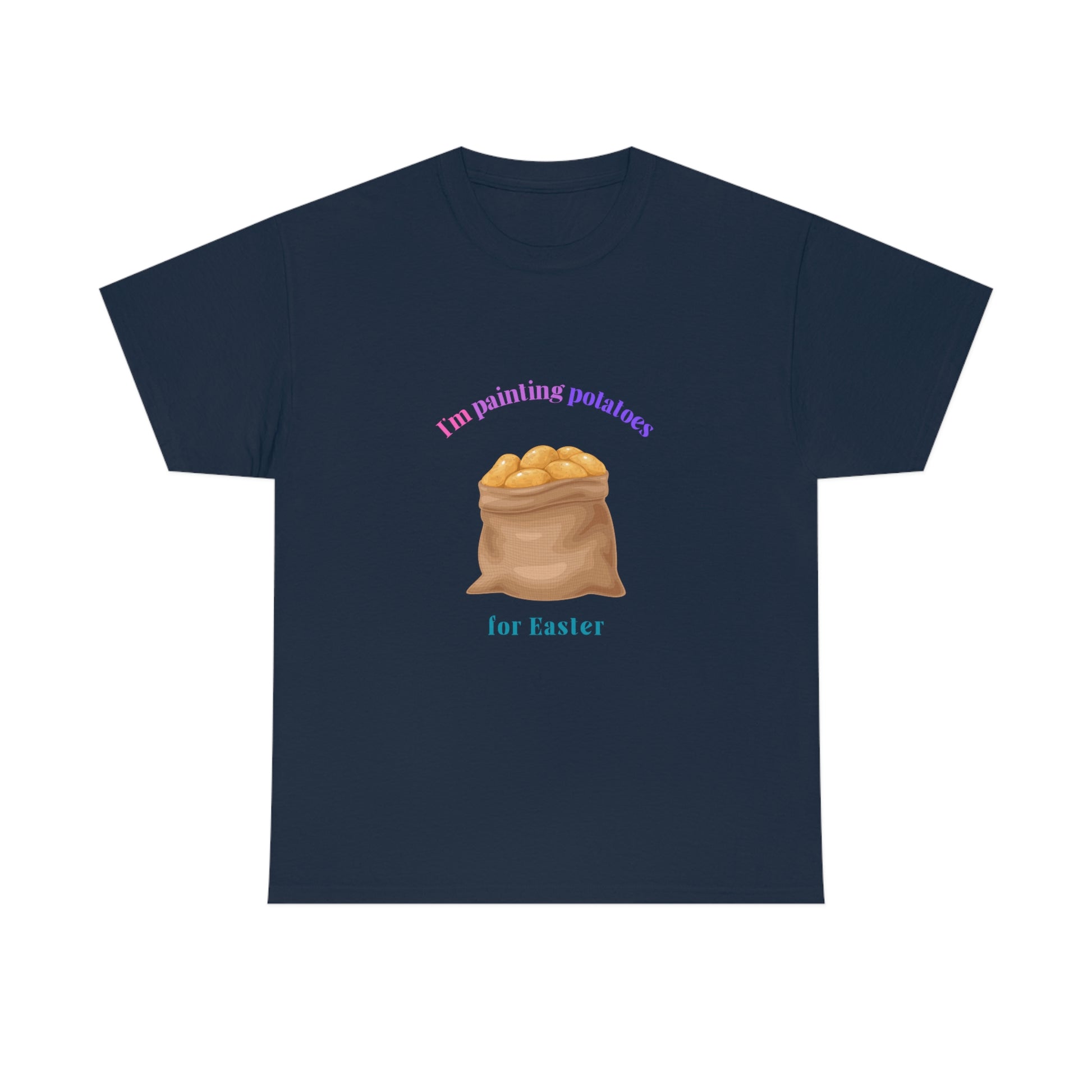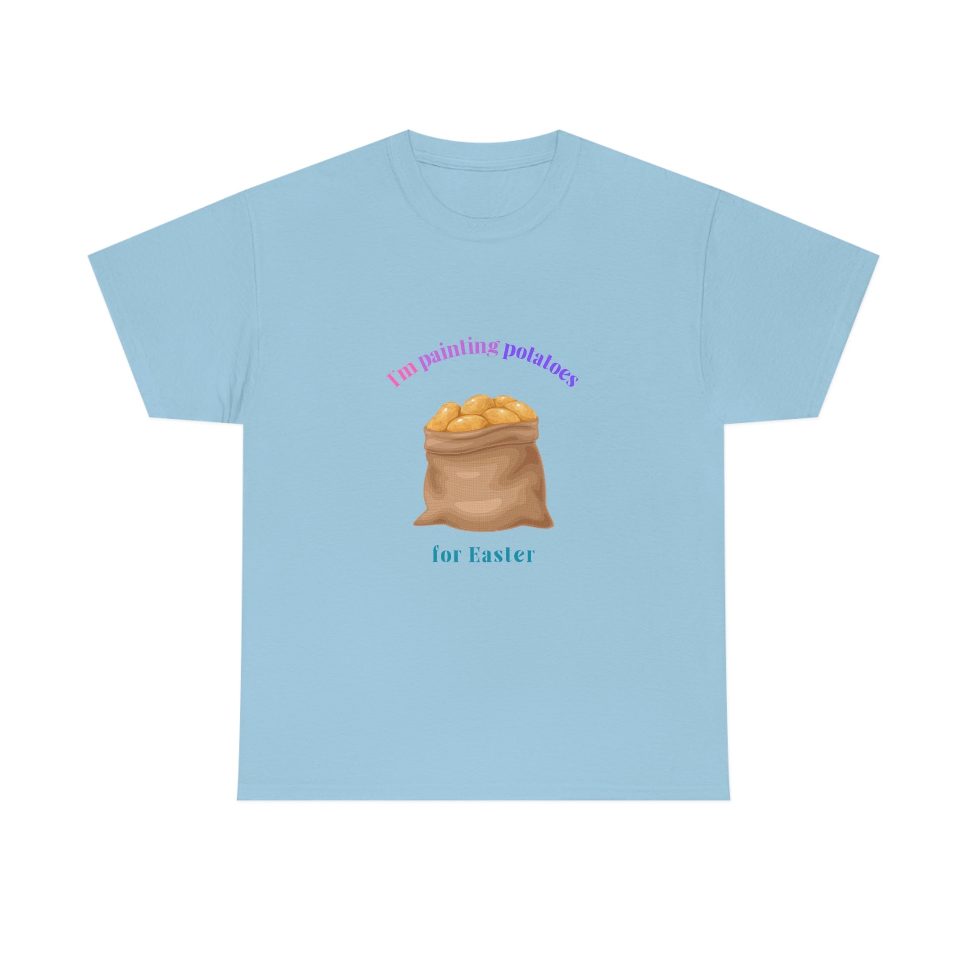 Get egg-cited with our Painting Potatoes Easter t-shirt! Whether you're planning on doing some potato painting this Easter or just want a chuckle, this t-shirt is the perfect addition to your holiday celebration. Made with quality cotton and featuring a hilarious saying and an adorable picture of a bag of potatoes, it's sure to put a smile on everyone's face. Get yours today and get ready to enjoy some Easter fun!
