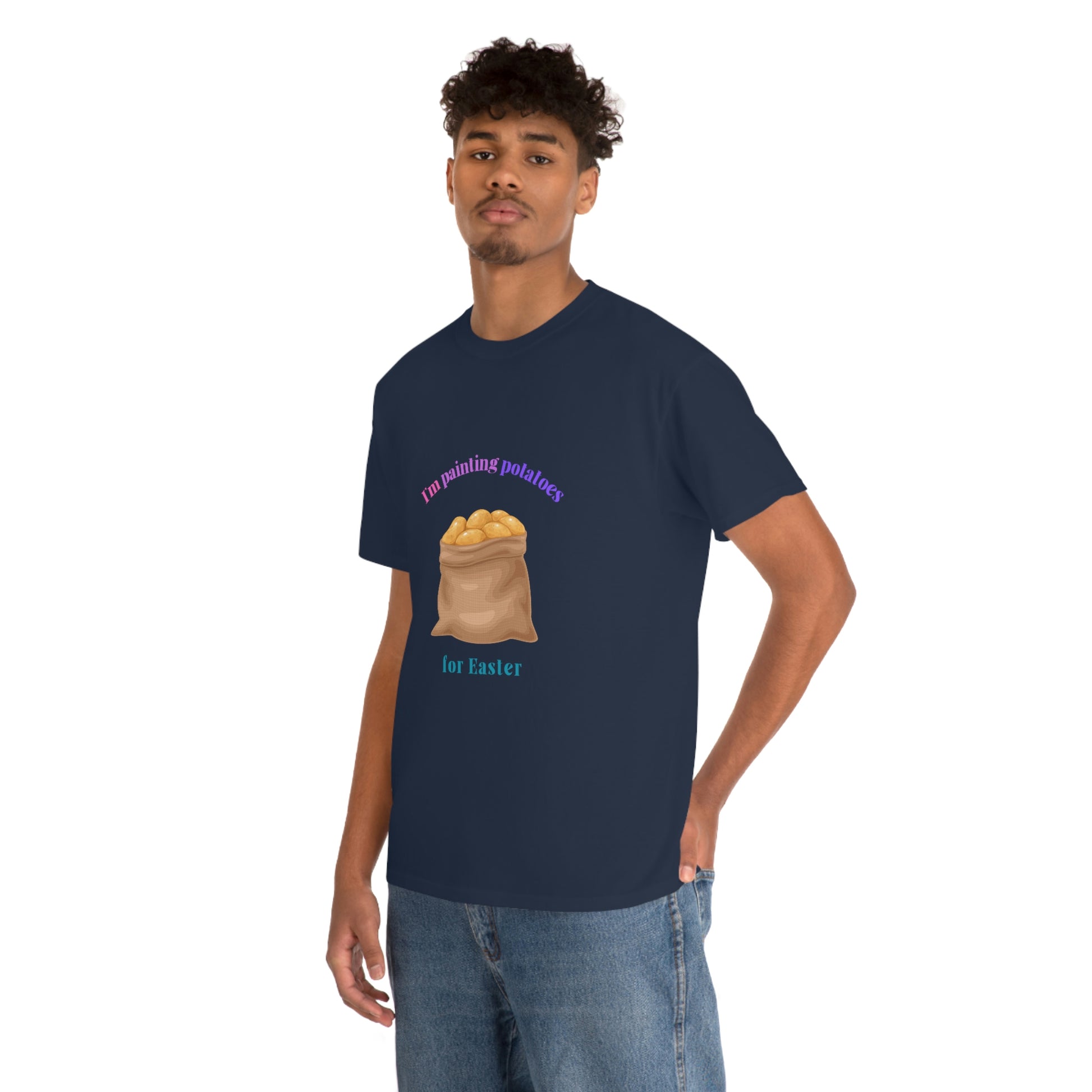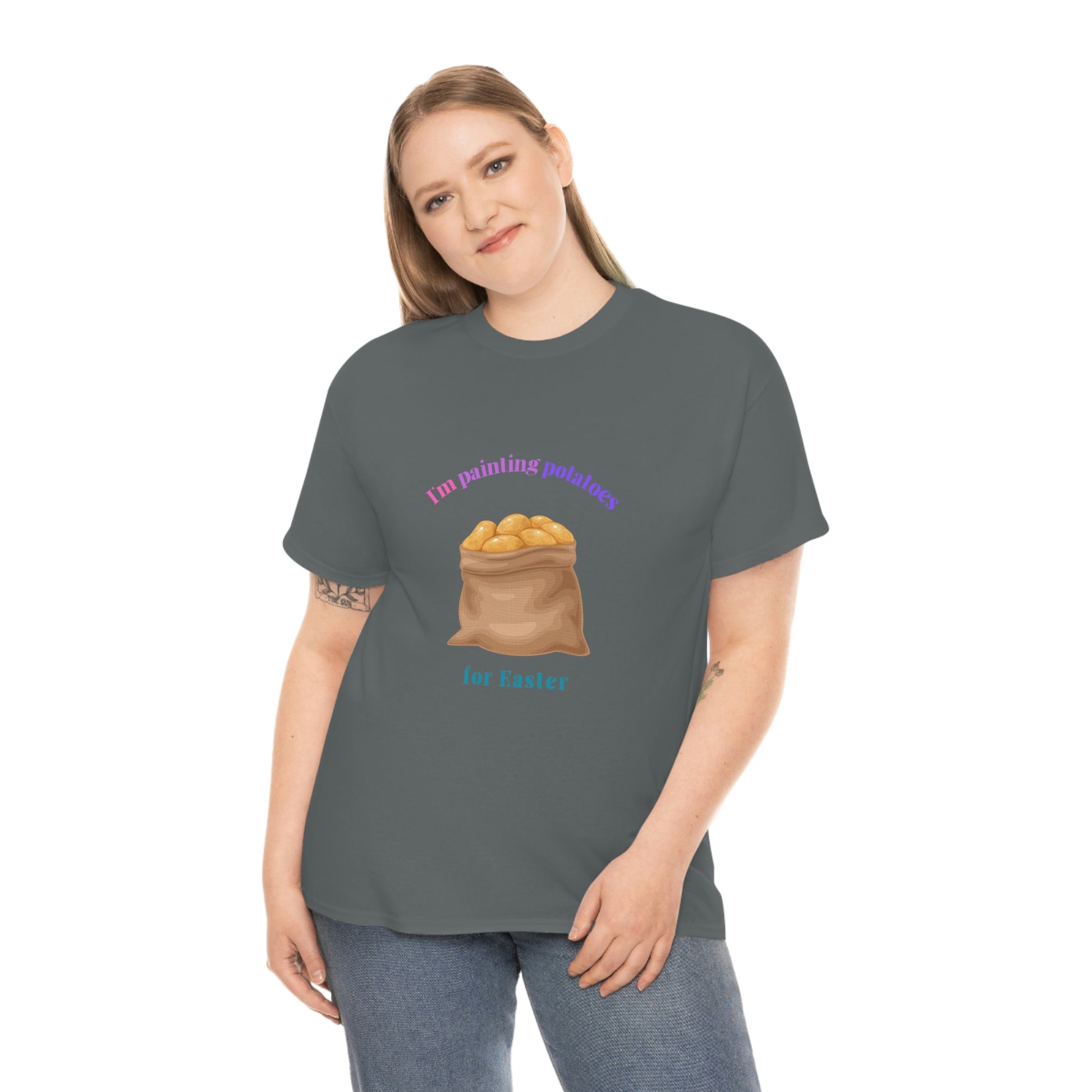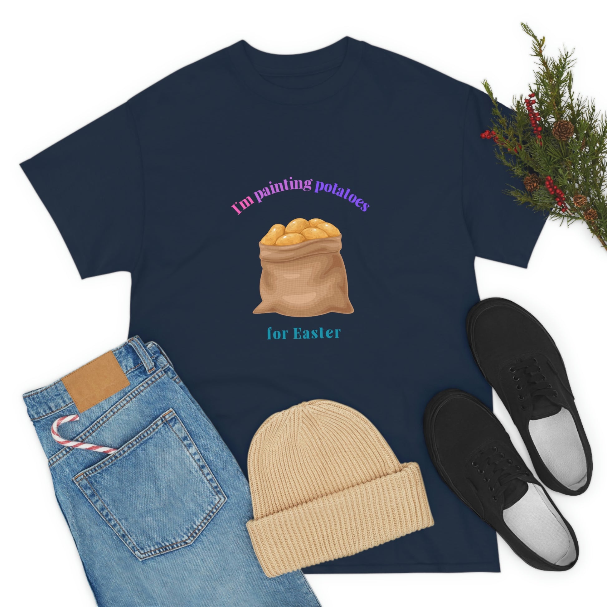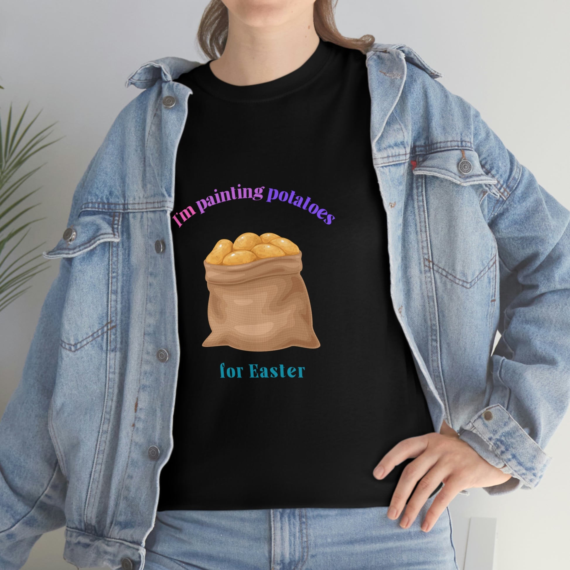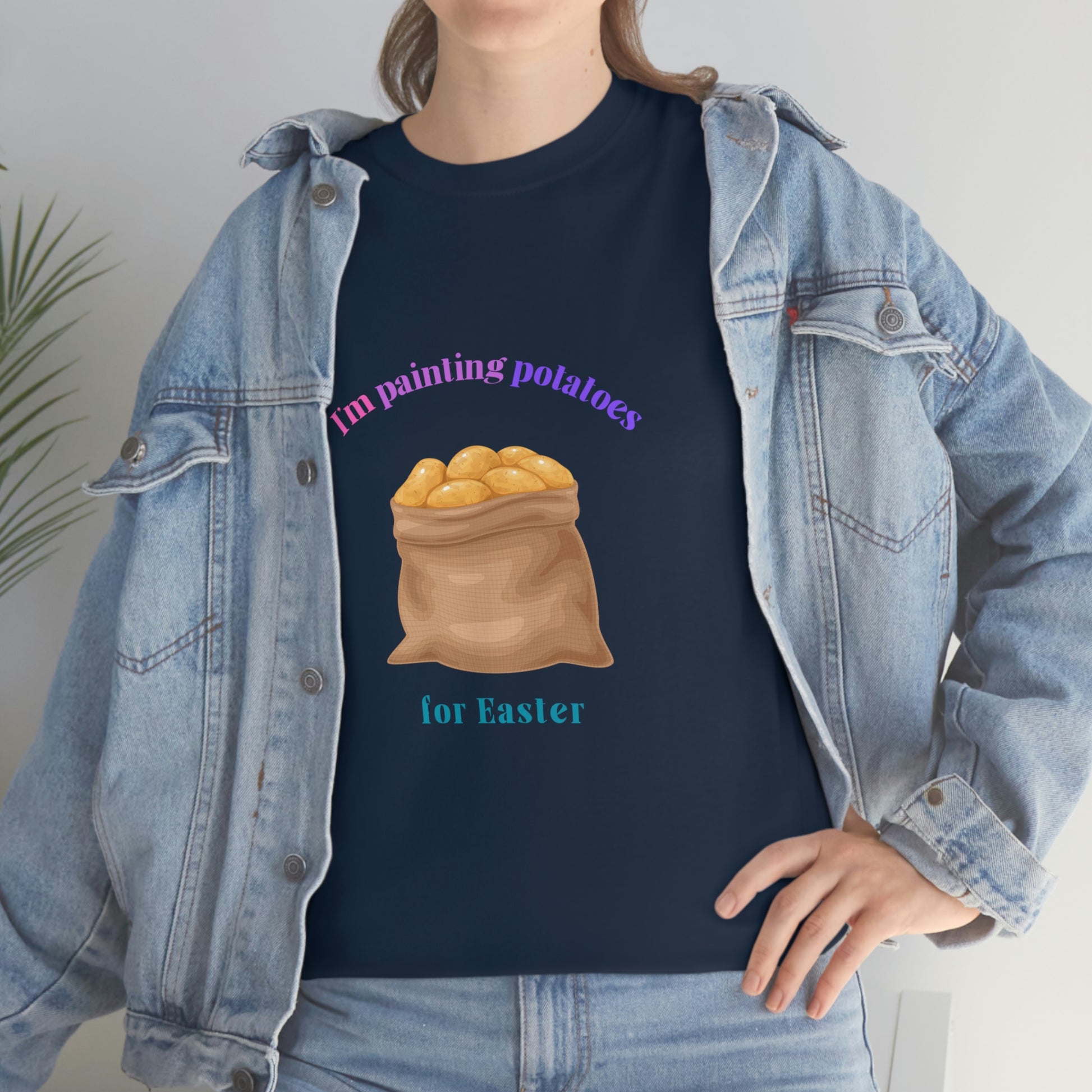 Get egg-cited with our Painting Potatoes Easter t-shirt! Whether you're planning on doing some potato painting this Easter or just want a chuckle, this t-shirt is the perfect addition to your holiday celebration. Made with quality cotton and featuring a hilarious saying and an adorable picture of a bag of potatoes, it's sure to put a smile on everyone's face. Get yours today and get ready to enjoy some Easter fun!