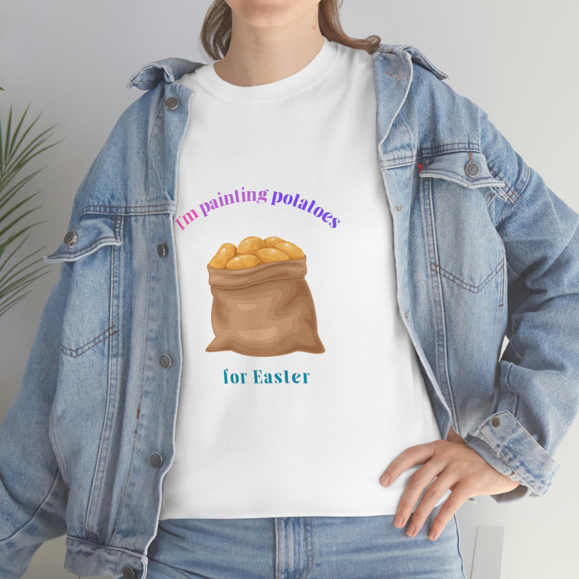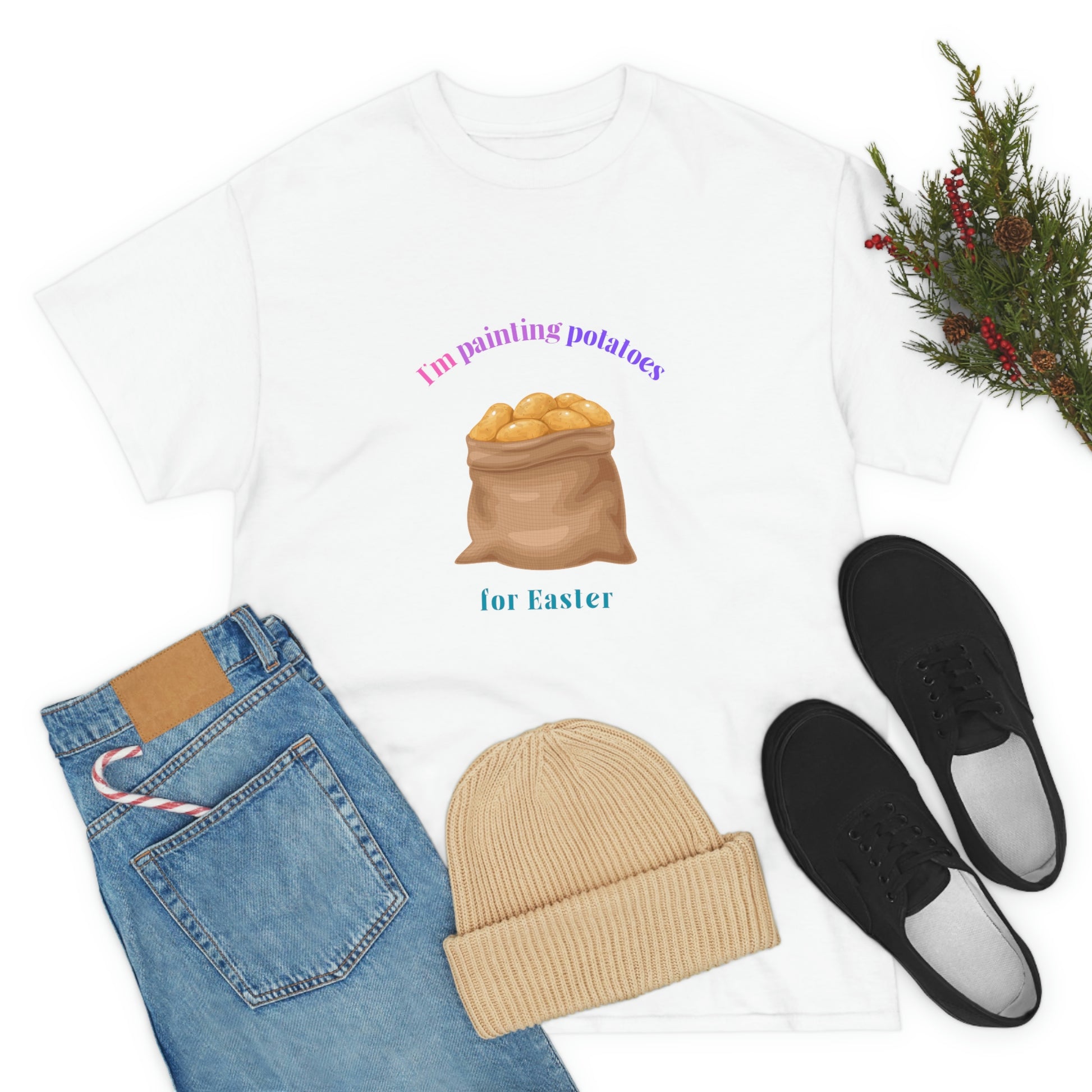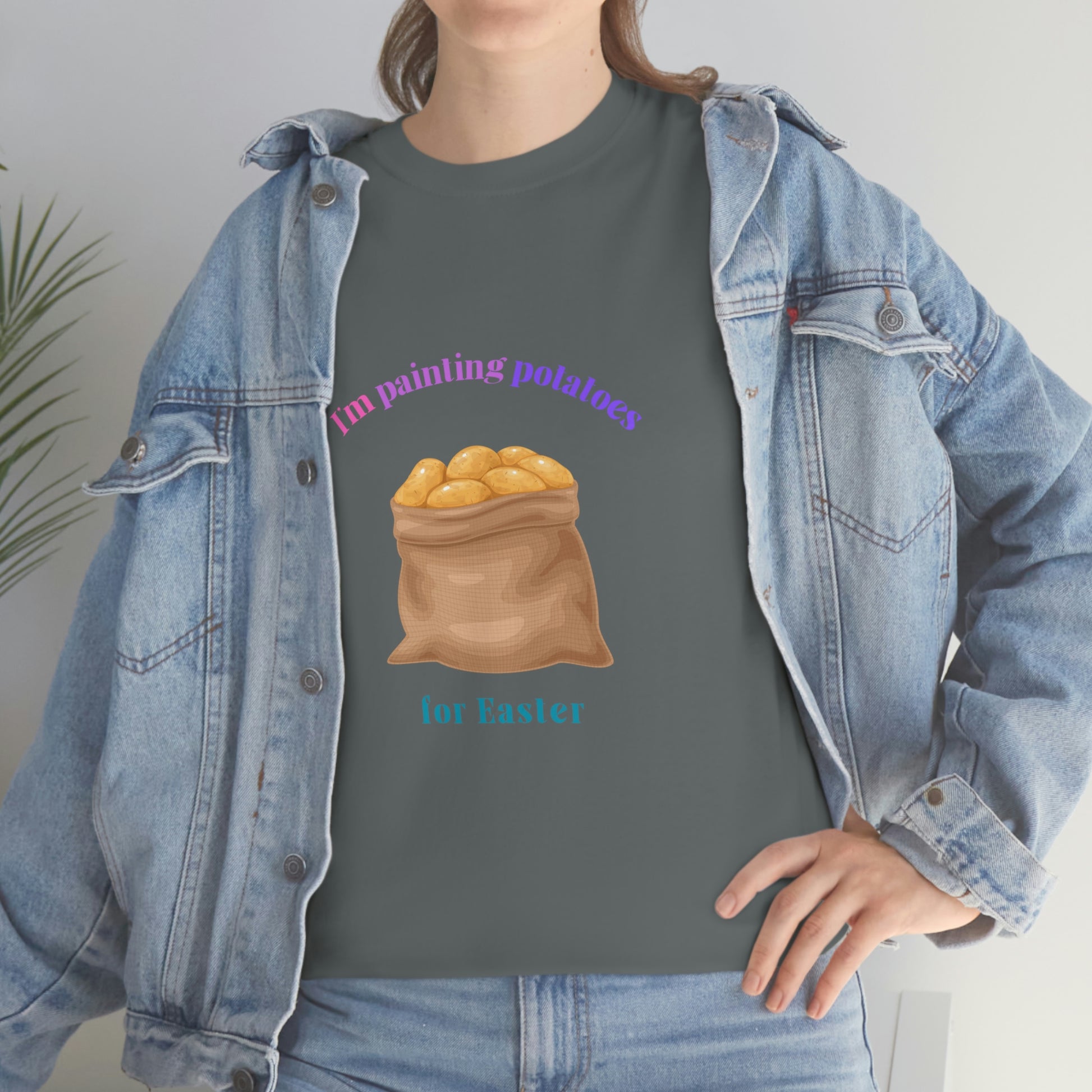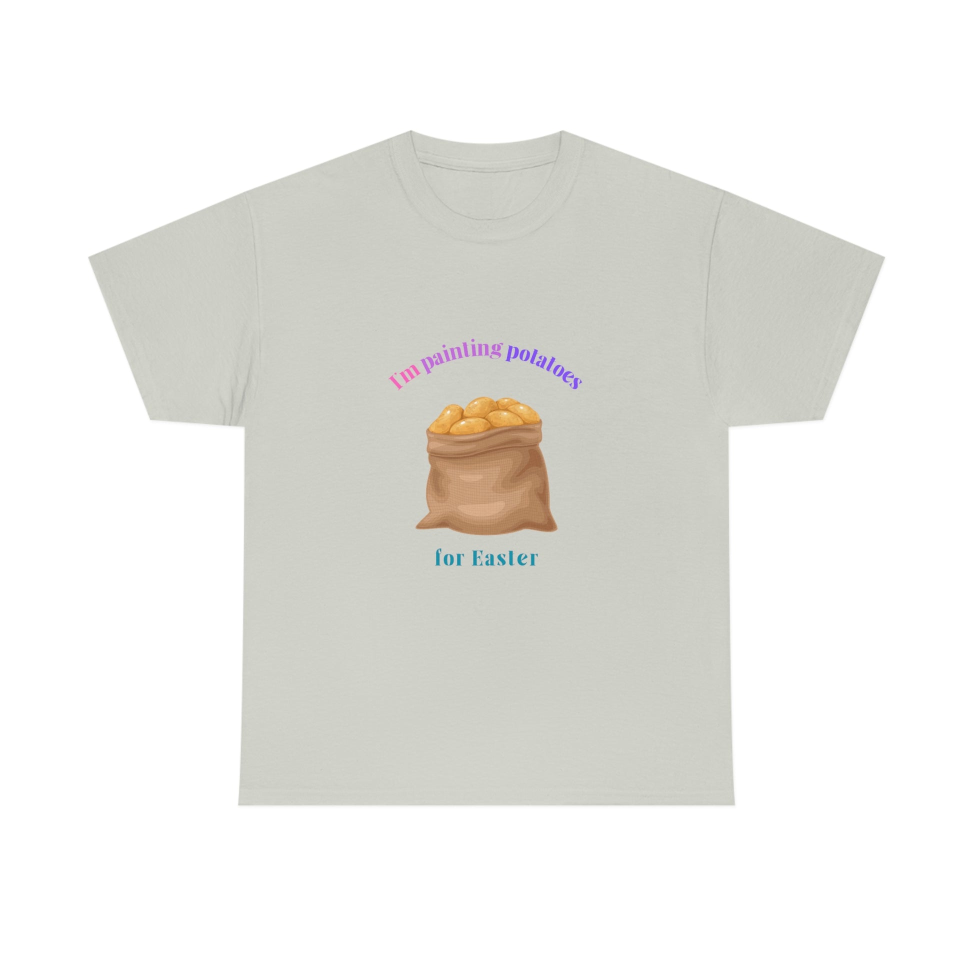 Get egg-cited with our Painting Potatoes Easter t-shirt! Whether you're planning on doing some potato painting this Easter or just want a chuckle, this t-shirt is the perfect addition to your holiday celebration. Made with quality cotton and featuring a hilarious saying and an adorable picture of a bag of potatoes, it's sure to put a smile on everyone's face. Get yours today and get ready to enjoy some Easter fun!