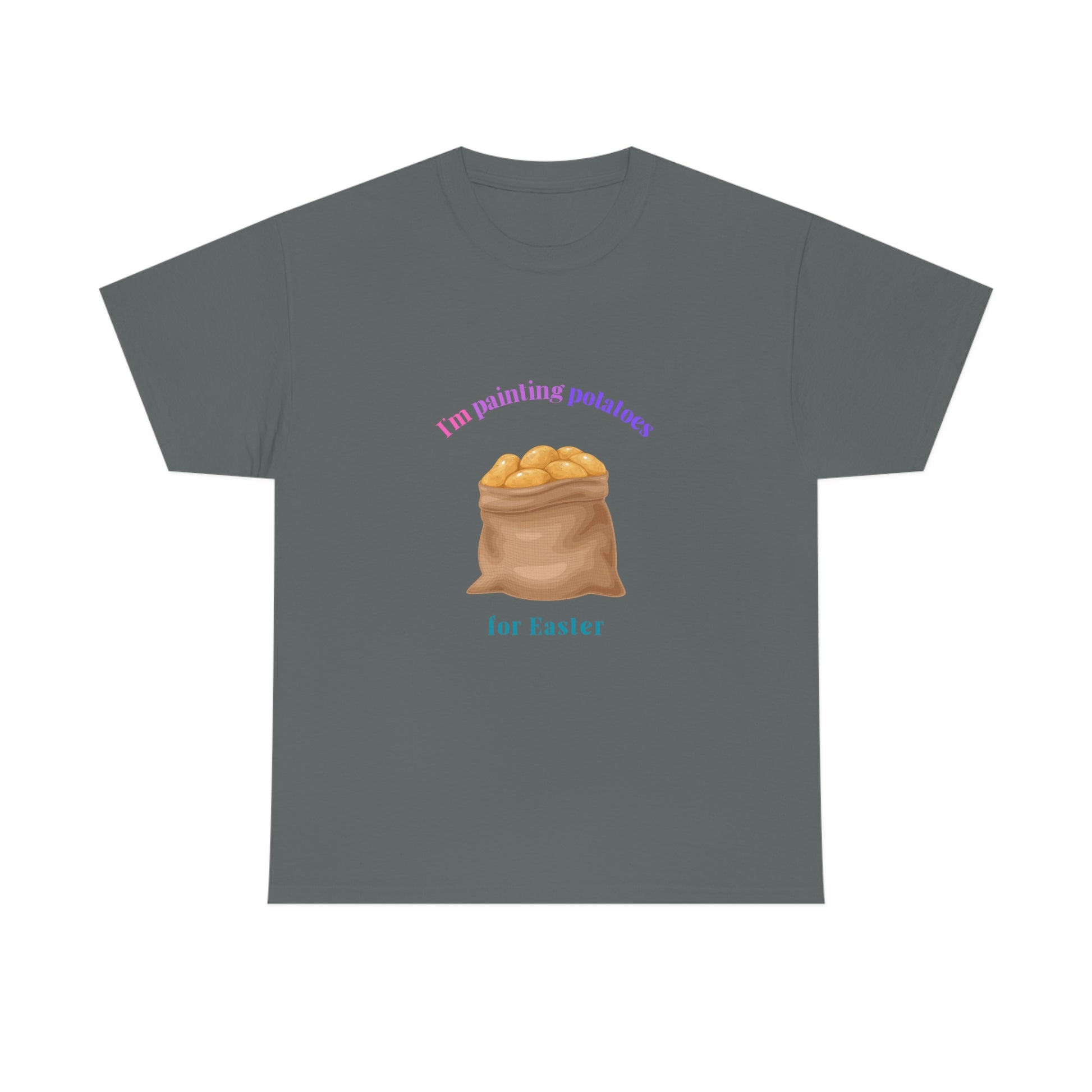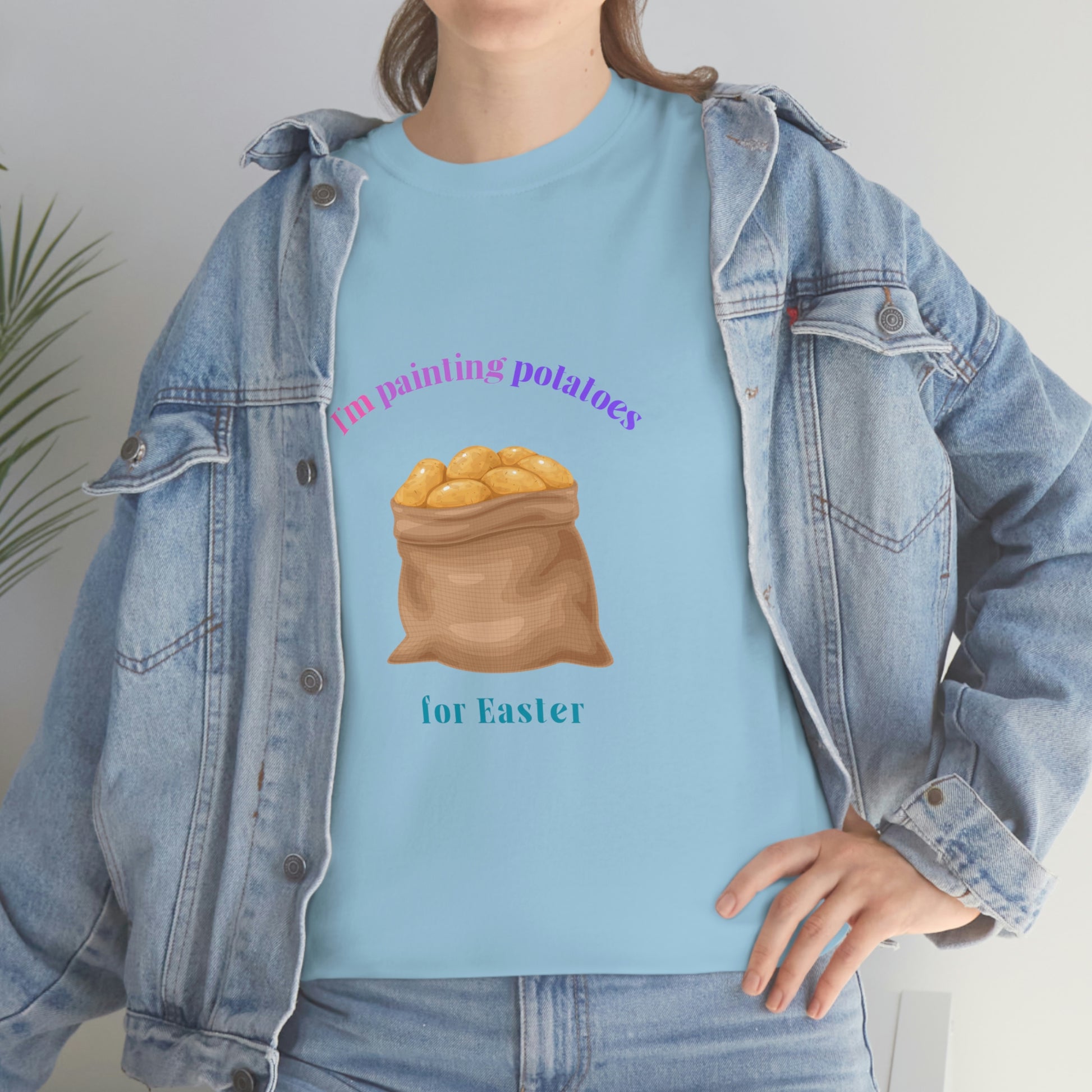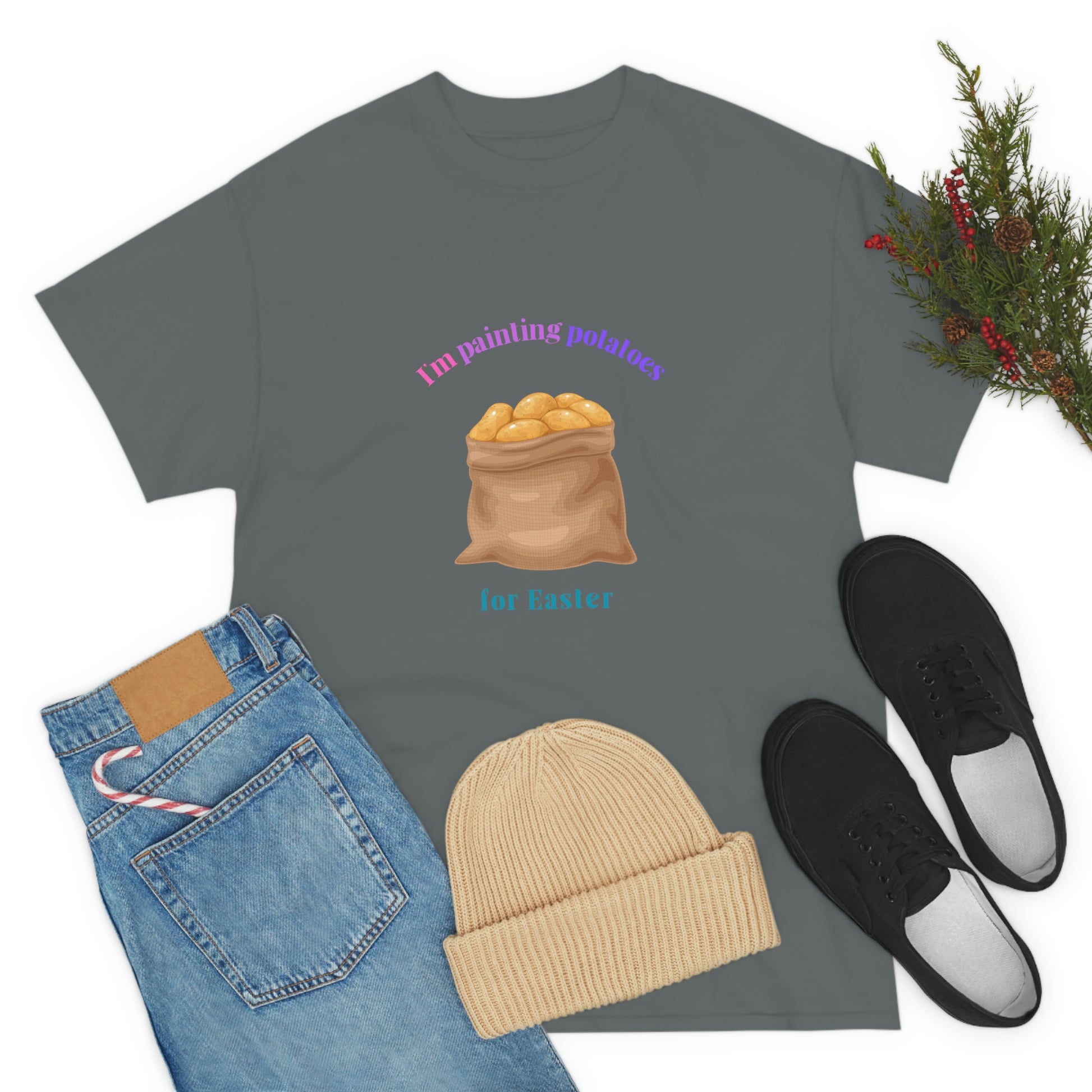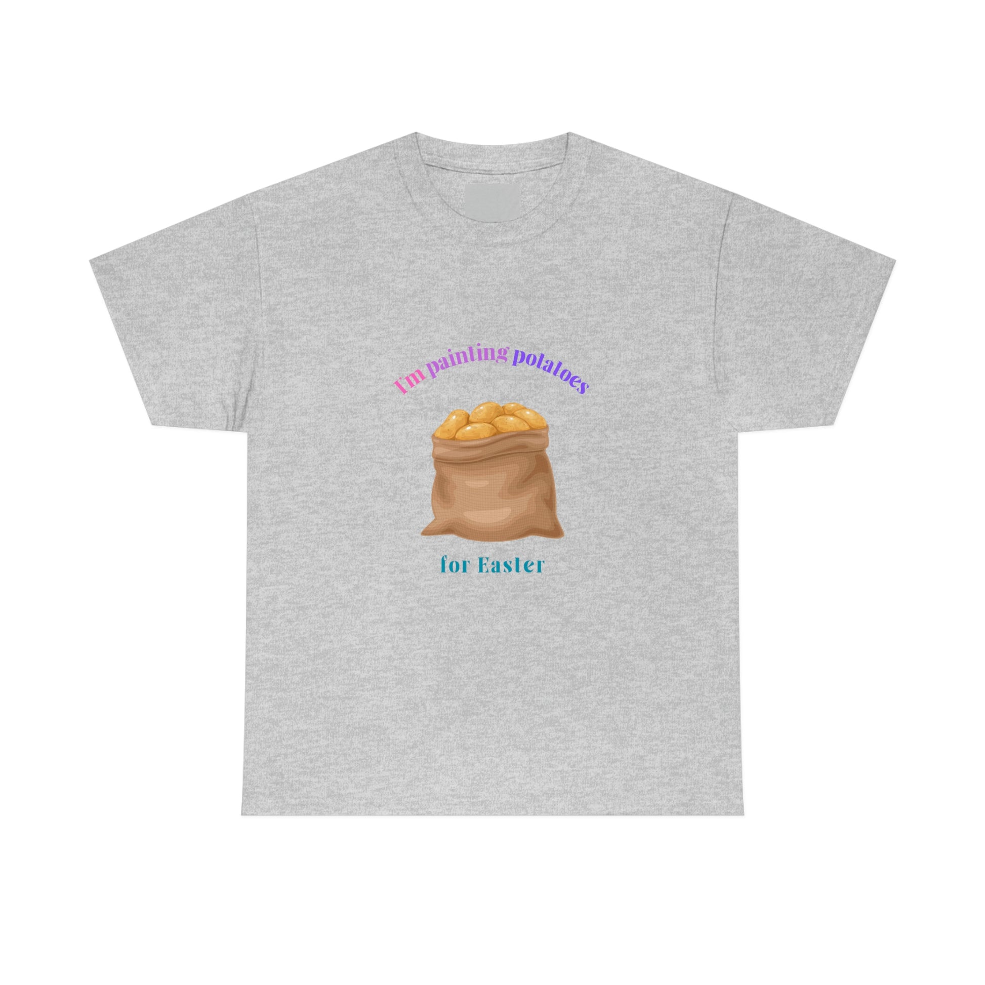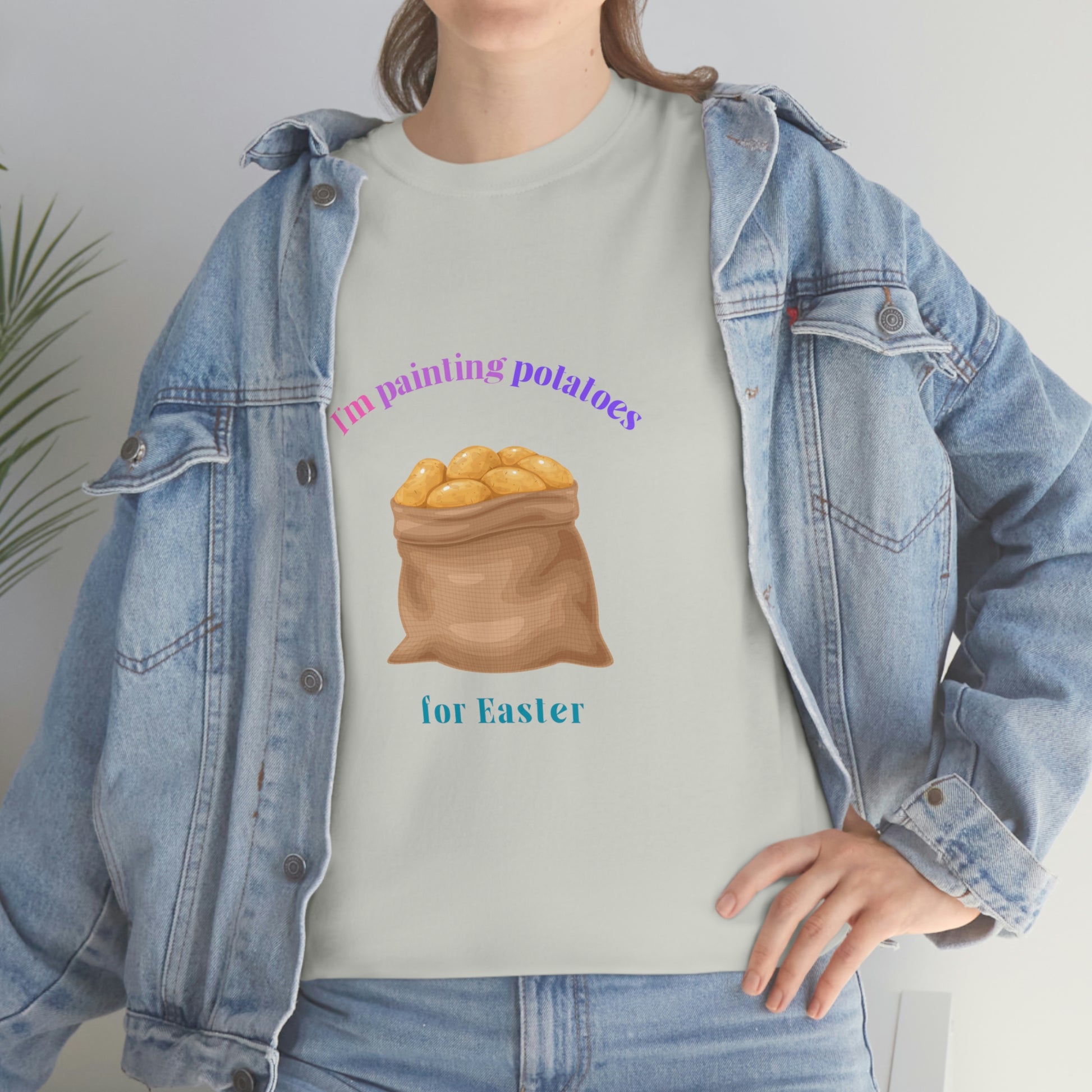 Get egg-cited with our Painting Potatoes Easter t-shirt! Whether you're planning on doing some potato painting this Easter or just want a chuckle, this t-shirt is the perfect addition to your holiday celebration. Made with quality cotton and featuring a hilarious saying and an adorable picture of a bag of potatoes, it's sure to put a smile on everyone's face. Get yours today and get ready to enjoy some Easter fun!