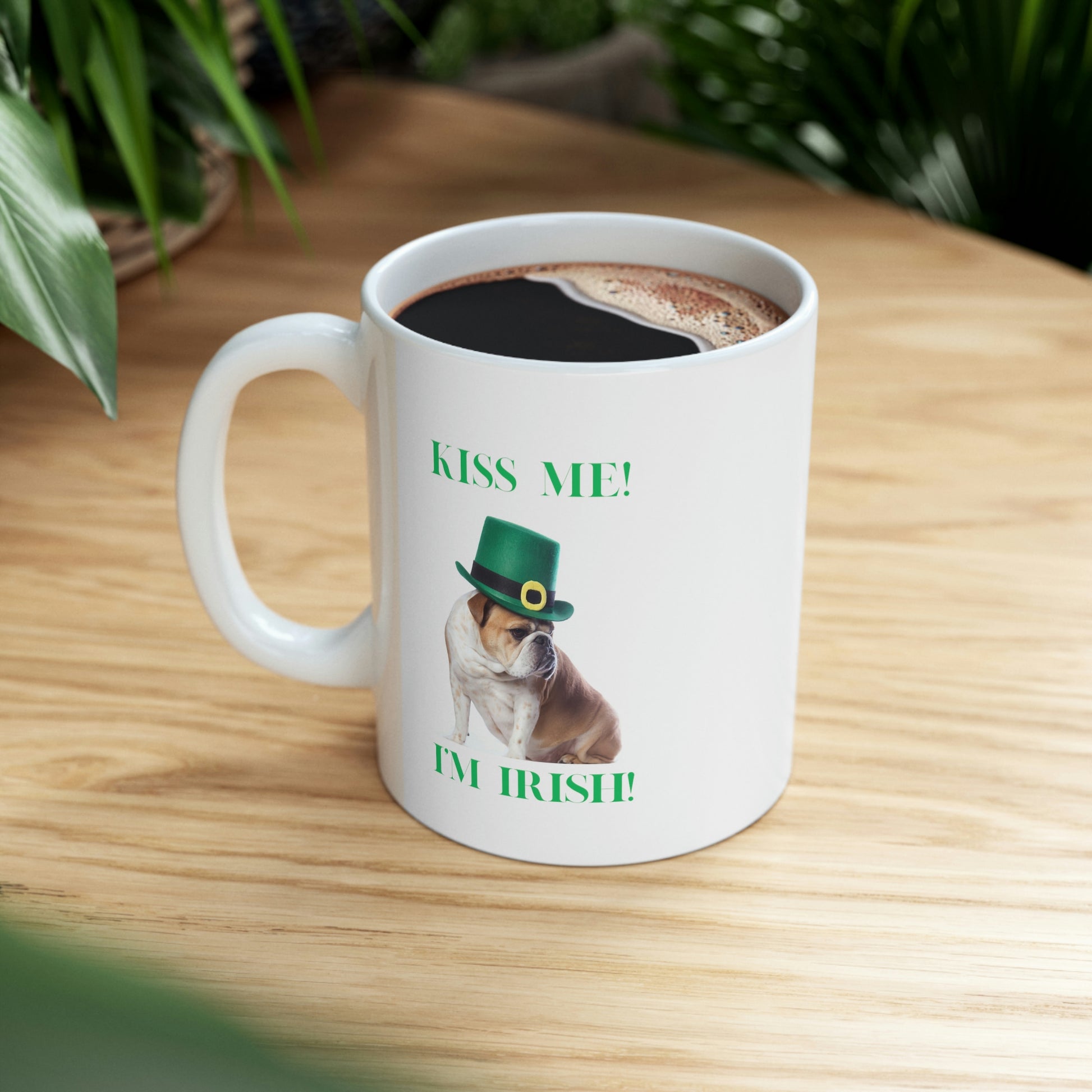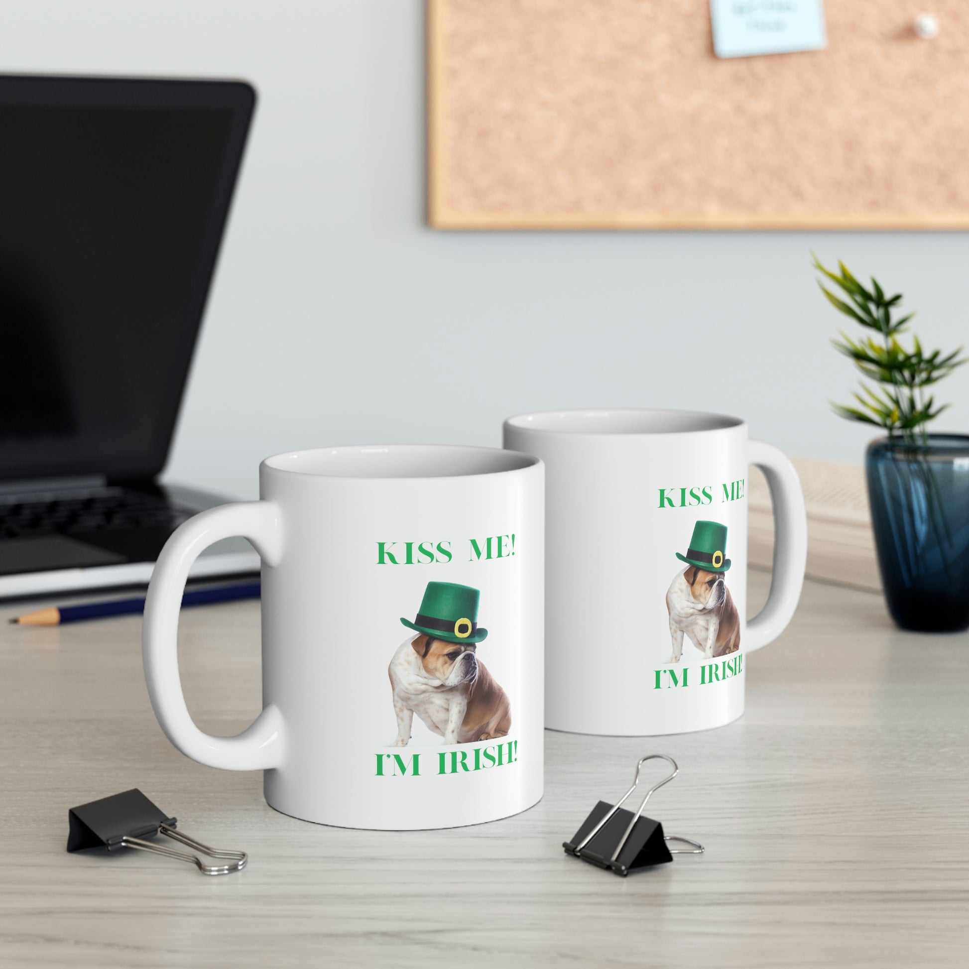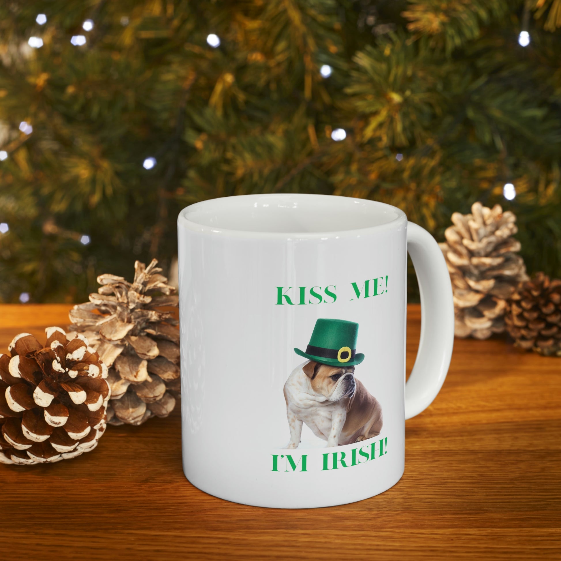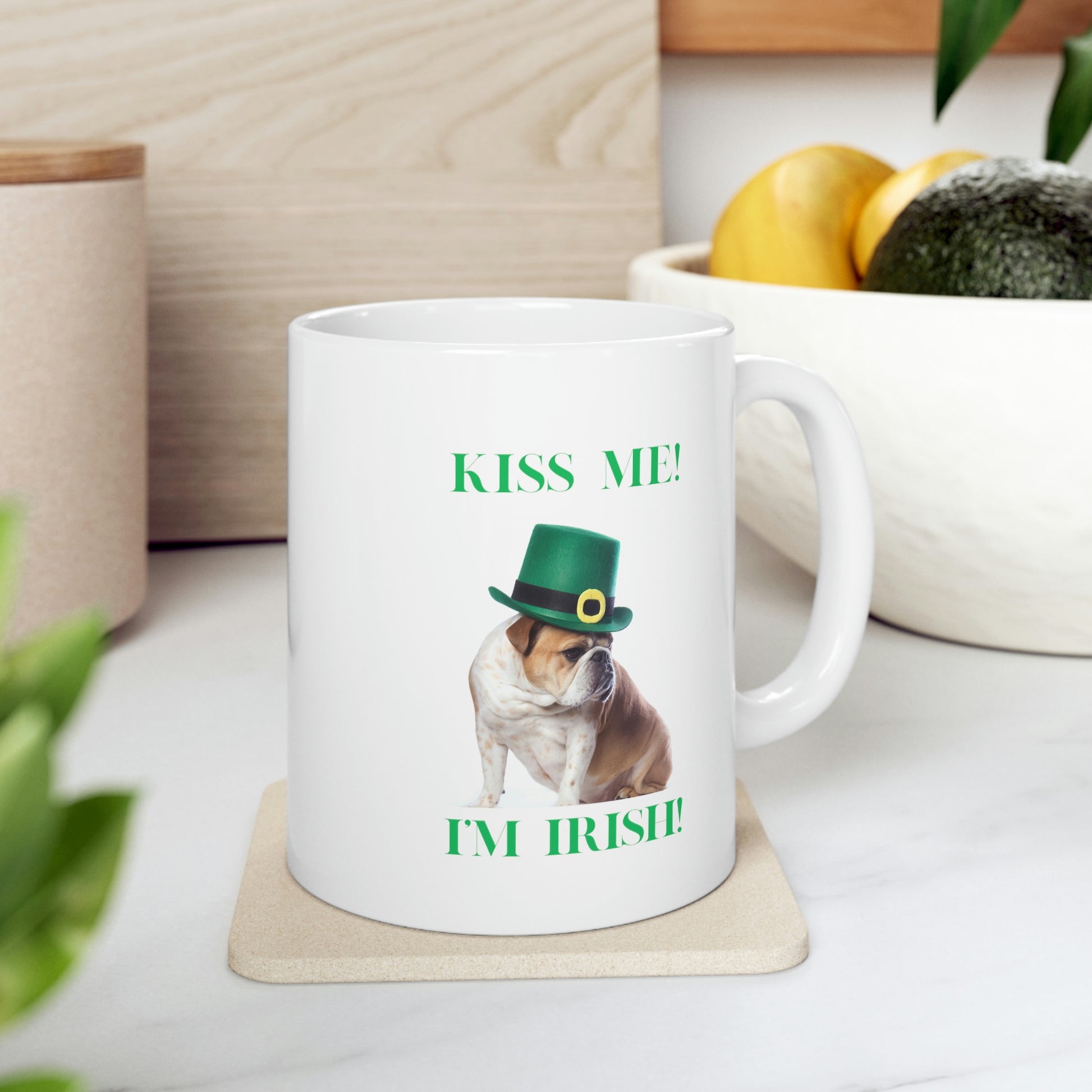 Make your Irish spirit shine strong and proud with the "Kiss Me! I'm Irish!" Bulldog mug! This one-of-a-kind mug features a lovable bulldog in a leprechaun costume and reads 'Kiss me I'm Irish'. Perfect for anyone with an affinity for Irish heritage or English Bulldogs, this mug is sure to make your morning coffee (or tea) even more enjoyable. It's a great gift idea too! Get yours now and show off your 'luck o' the Irish'!