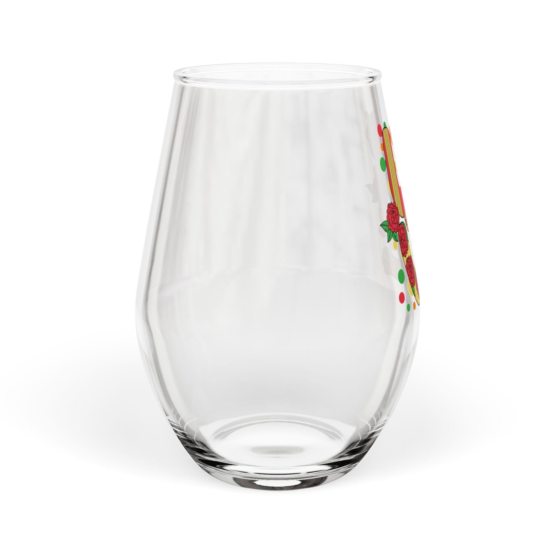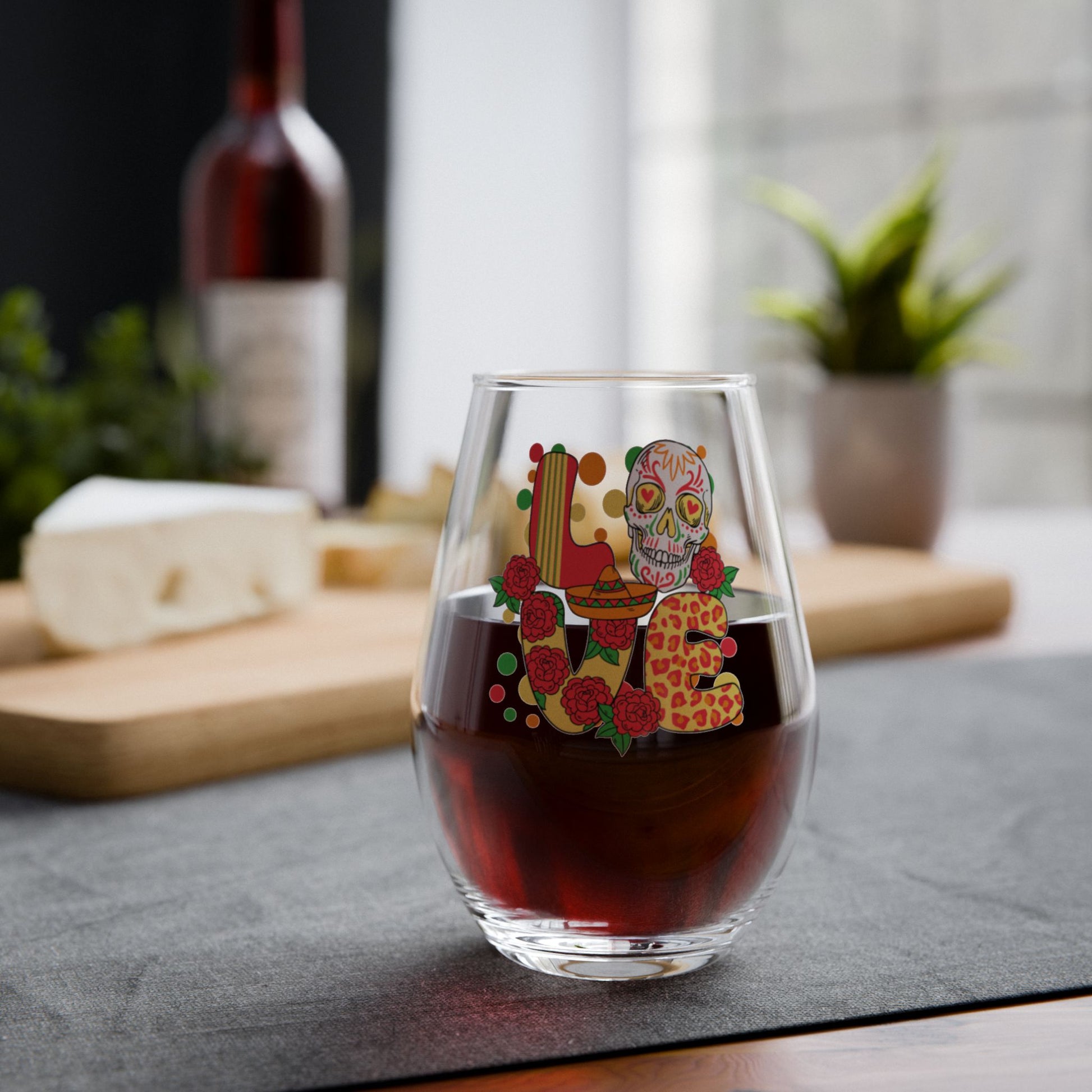 Celebrate love with a bold, romantic twist! Our Love Sugar Skull Stemless Wine Glass features a vibrant heart-shaped “LOVE” design filled with roses, a festive sombrero, and a colorful sugar-skull motif. This playful yet stylish glass is perfect for Valentine’s Day, anniversaries, weddings, or Día de los Muertos celebrations.