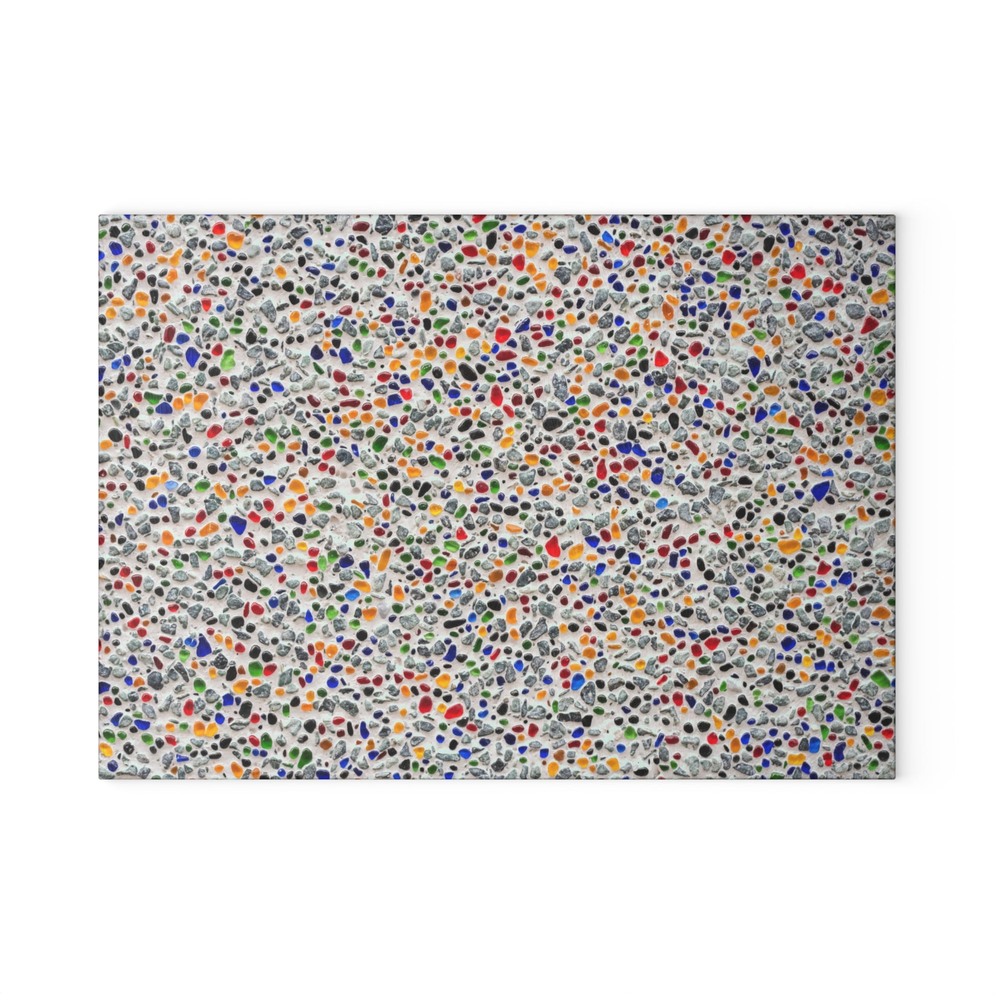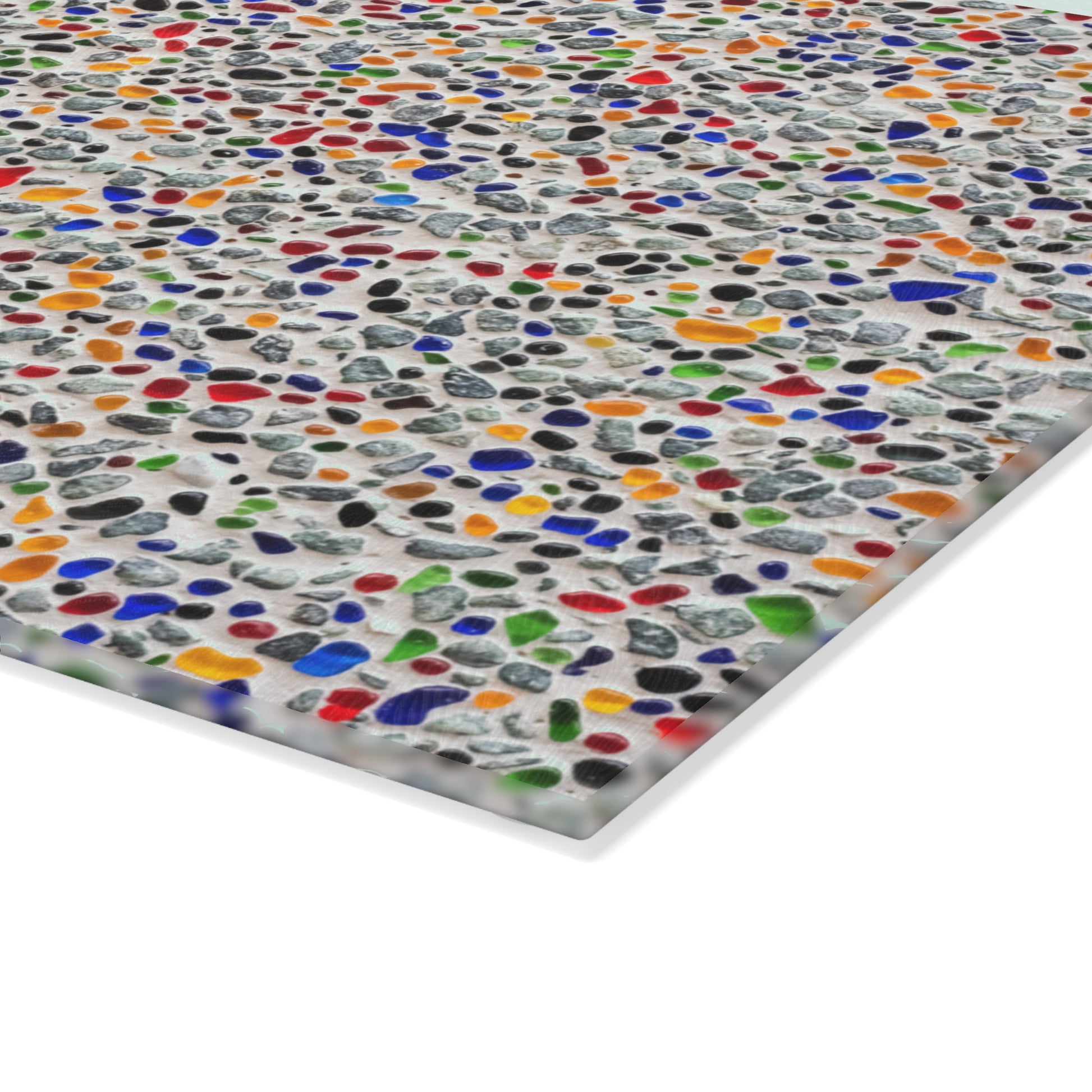 Bright, playful dots scatter across a tempered glass surface, turning a simple kitchen task into a small, joyful moment. This glass cutting board feels cool and solid under your hands, with a subtly textured finish that helps keep produce and prep steady. The durable printing process locks in vibrant, multicolor hues so the pattern stays crisp even with daily use. Four rubber feet lift the board slightly to protect countertops and keep everything stable while you work. Lightweight and easy to move, it slips into a drawer or stands at the back of the counter when not in use — a cheerful touch that makes meal prep feel a little less routine.