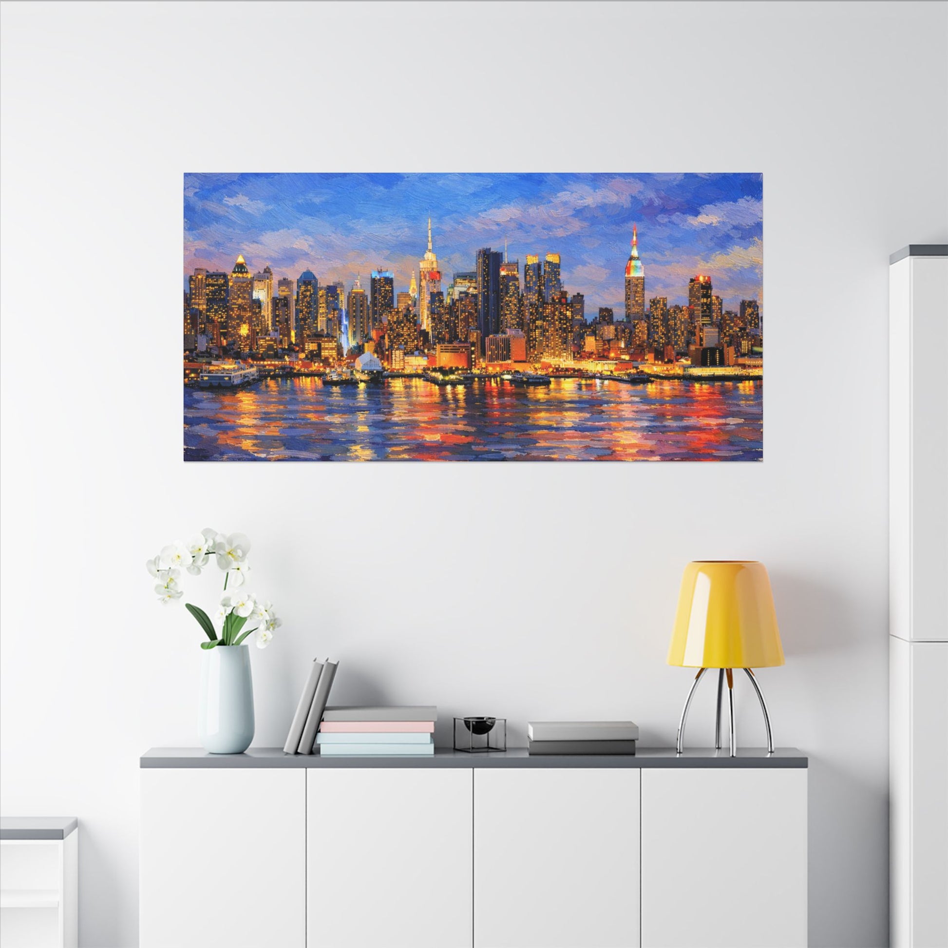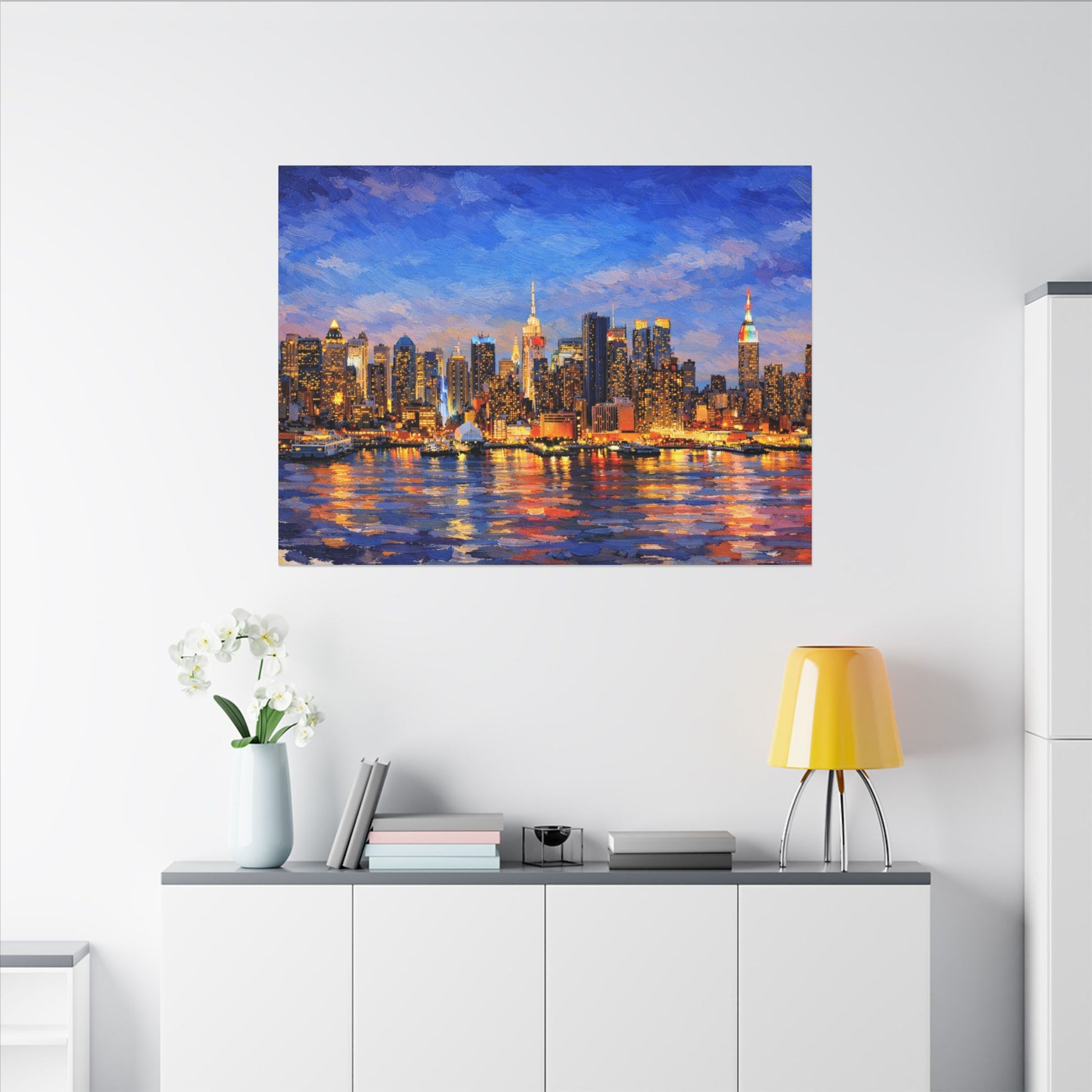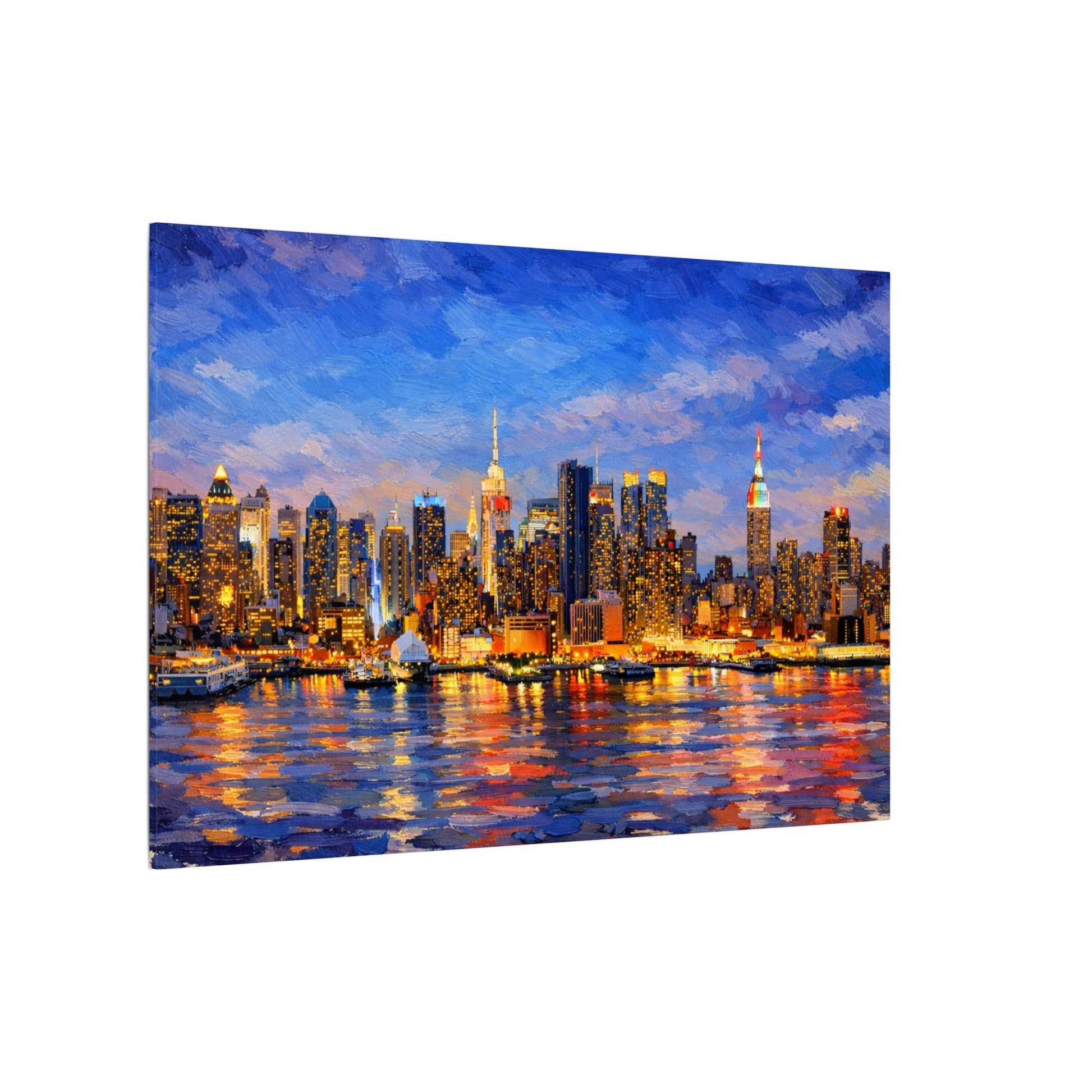 Perfect for modern, urban, or contemporary interiors, this artwork adds a dramatic focal point to living rooms, bedrooms, offices, lofts, and city-inspired spaces. Thick, textured brushwork and luminous color bring the waterfront reflections to life, turning a familiar urban view into a warm, atmospheric statement piece.