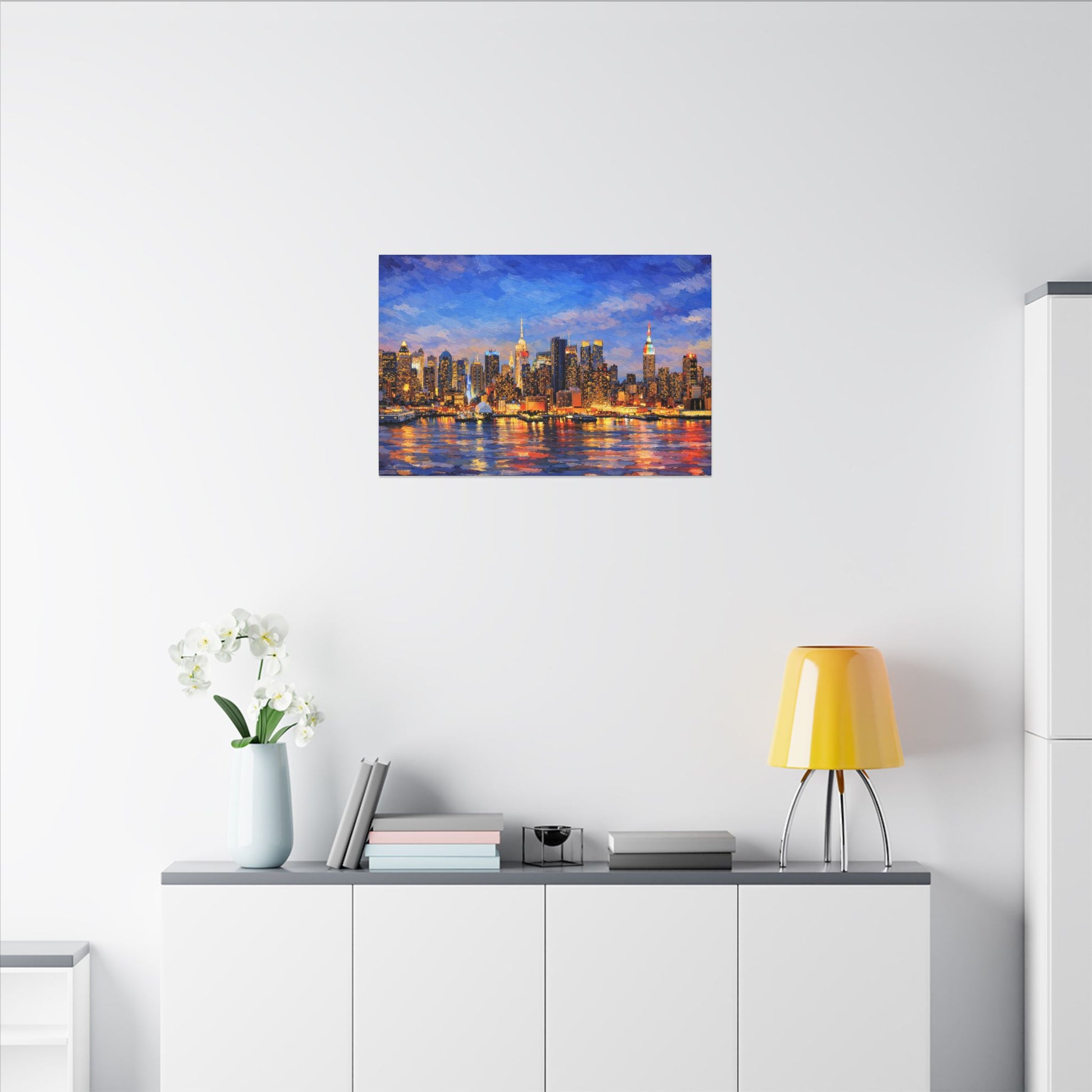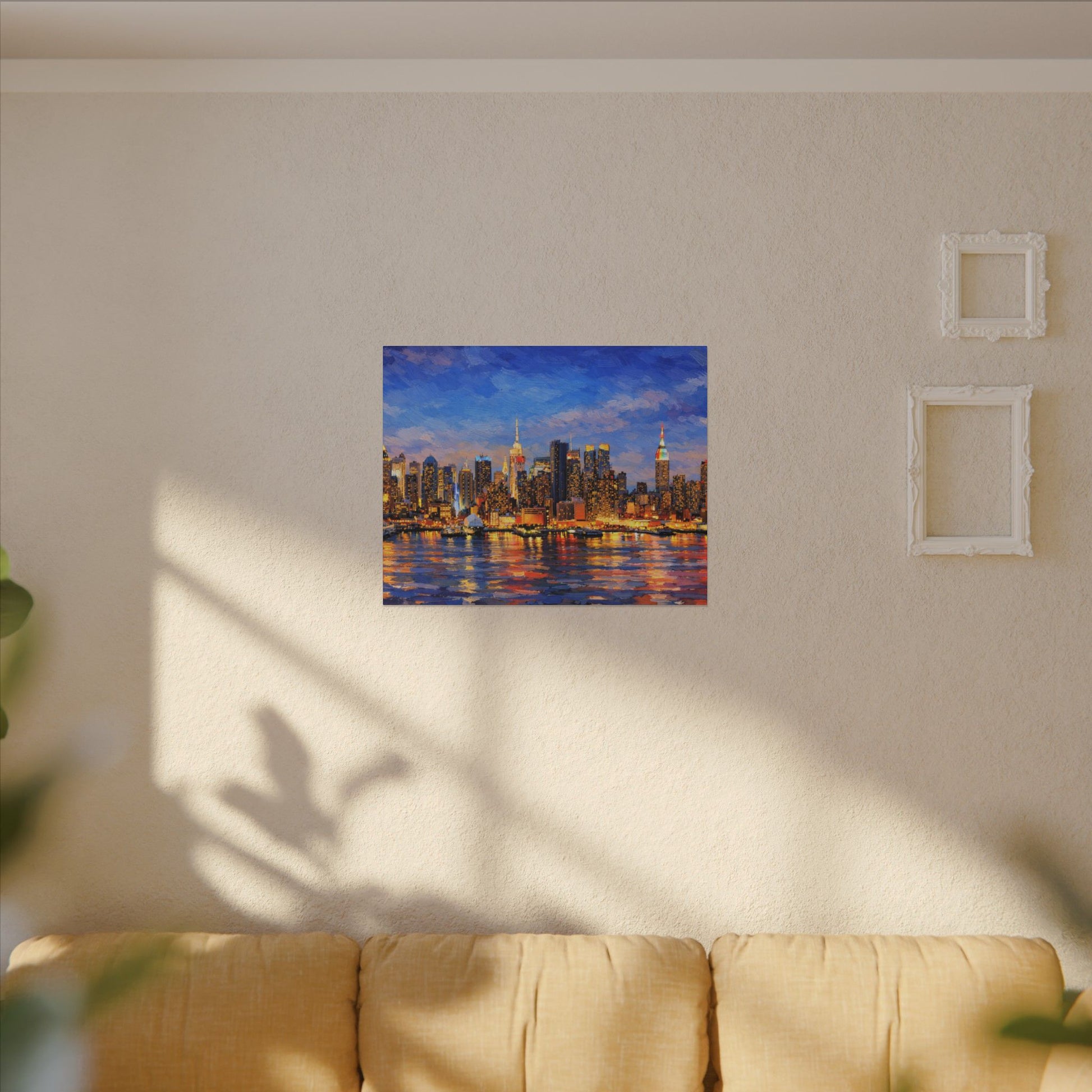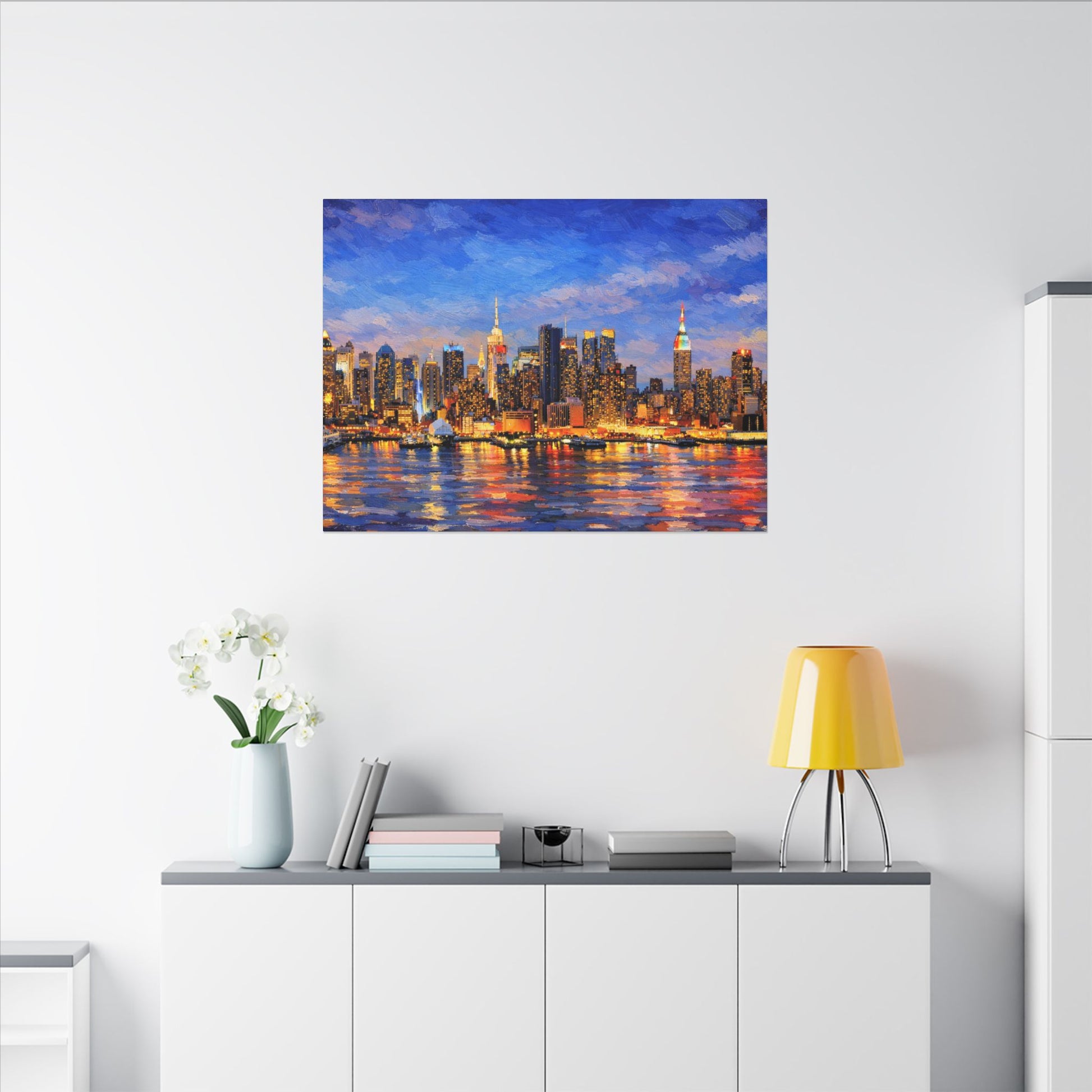 Perfect for modern, urban, or contemporary interiors, this artwork adds a dramatic focal point to living rooms, bedrooms, offices, lofts, and city-inspired spaces. Thick, textured brushwork and luminous color bring the waterfront reflections to life, turning a familiar urban view into a warm, atmospheric statement piece.
