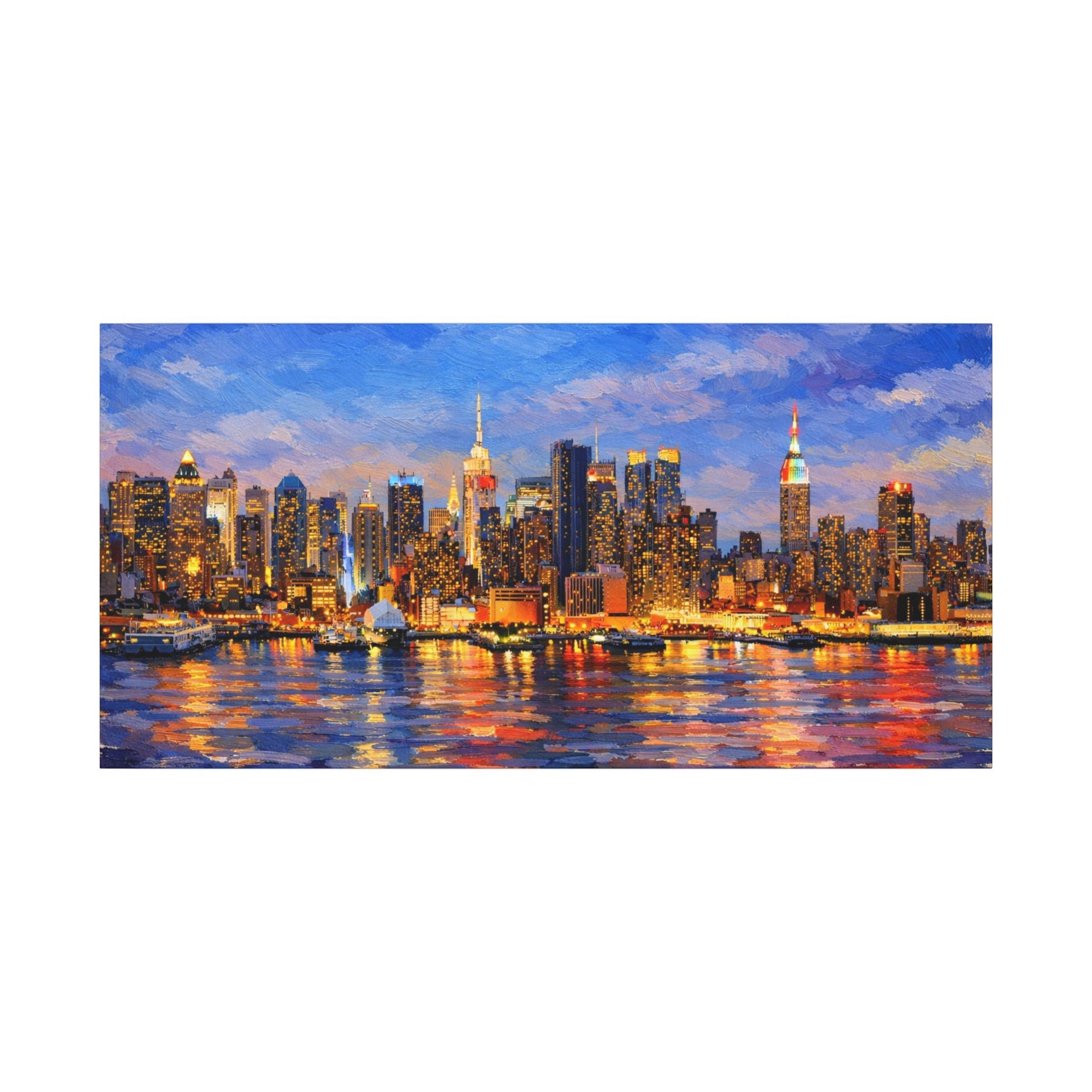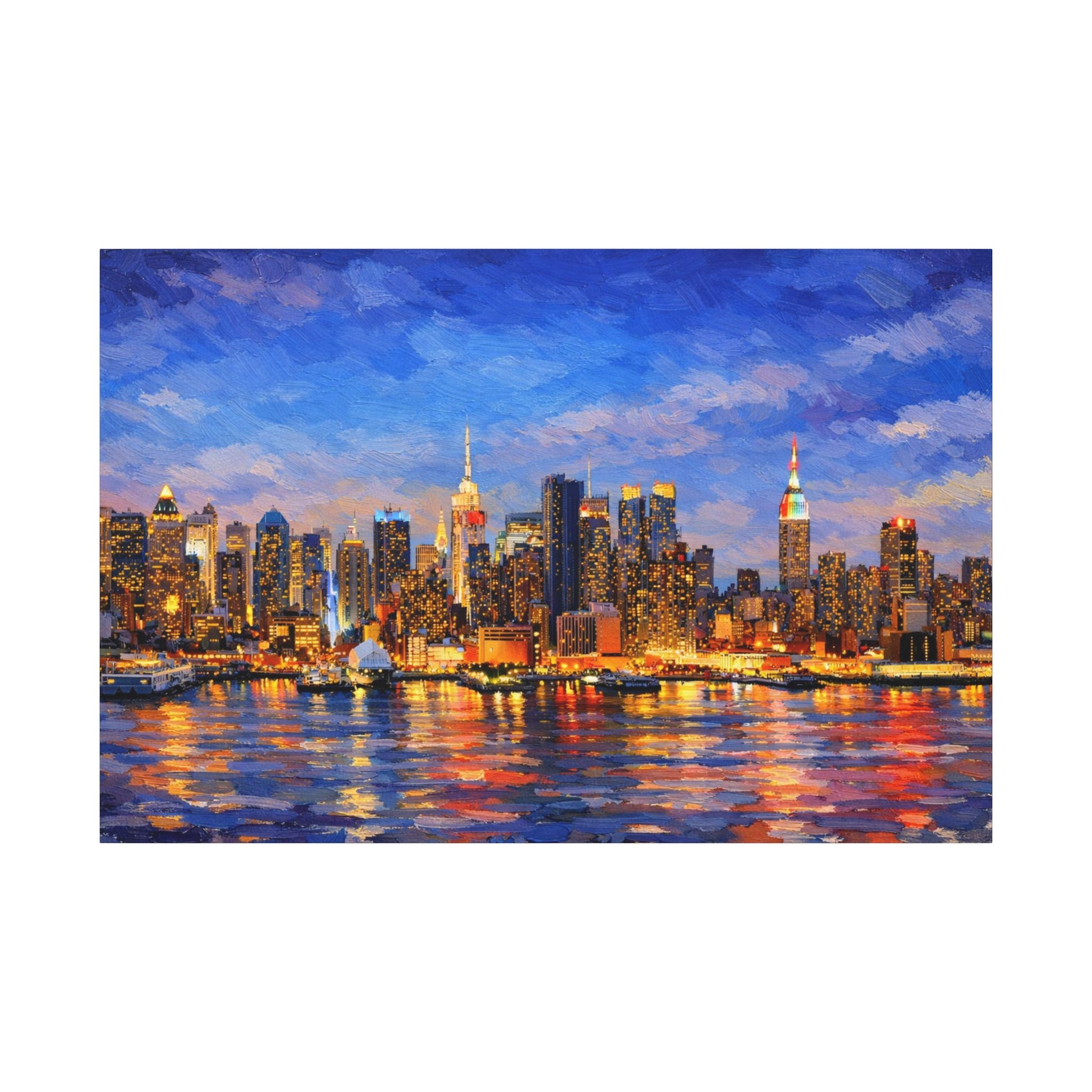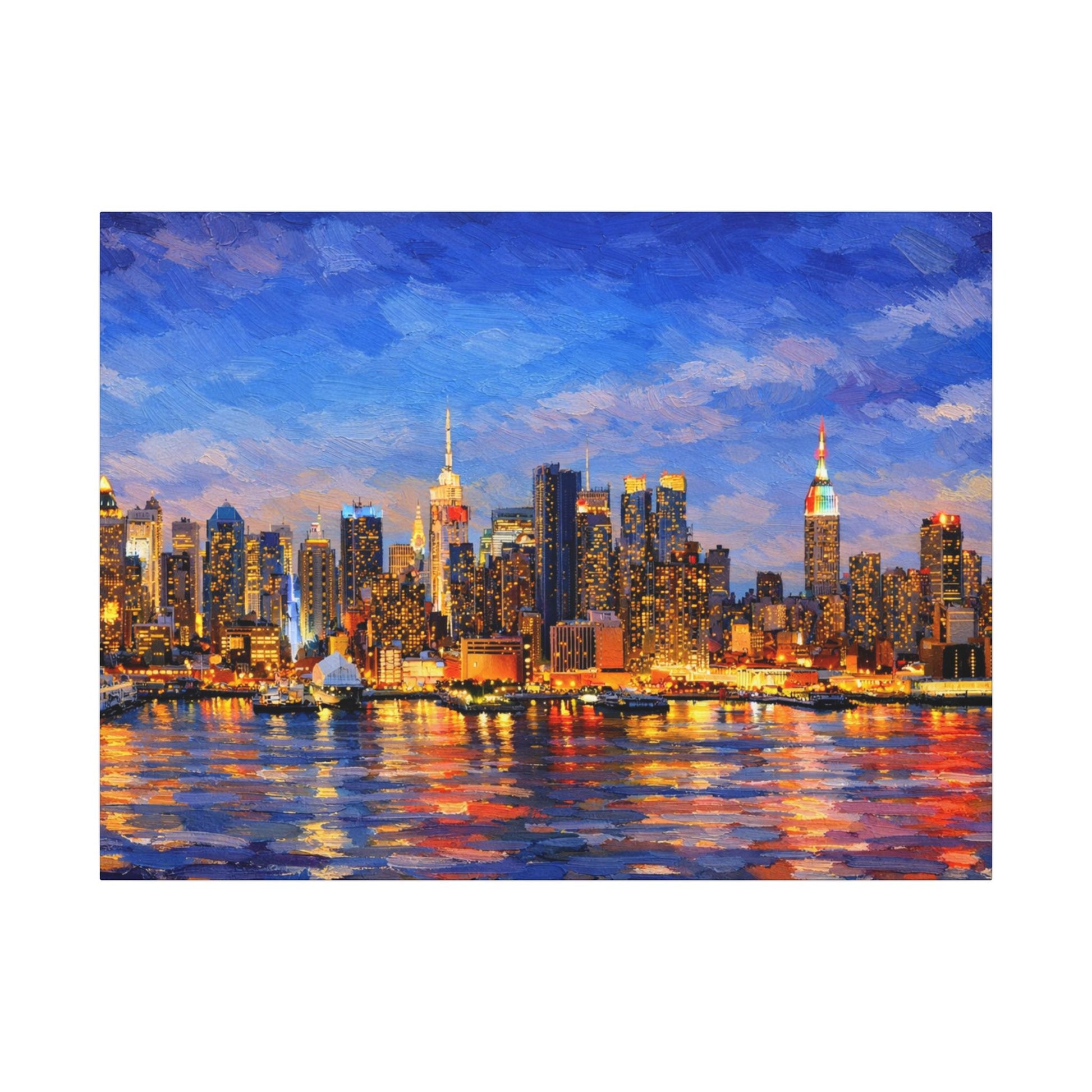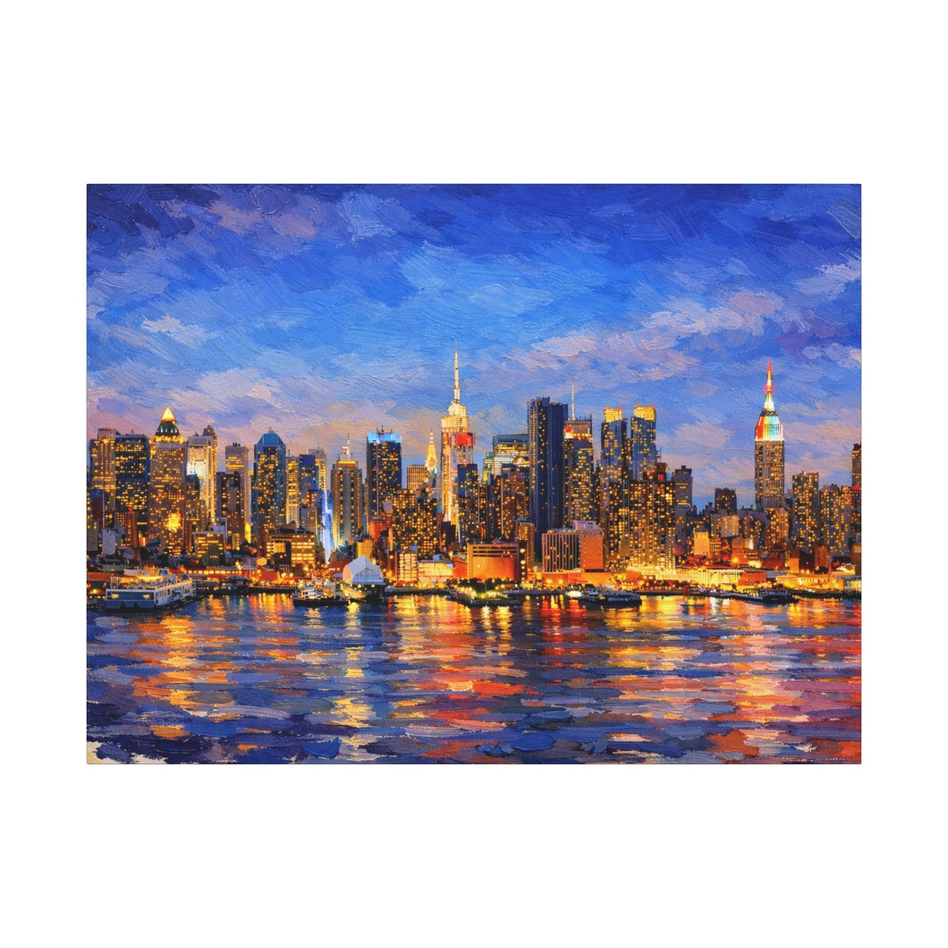 Bring the energy of New York City into your space with this landscape oil-painted skyline artwork, featuring bold, heavy brush strokes and rich, glowing city lights reflected across the water. Inspired by classic impasto oil painting techniques, this piece captures the iconic NYC skyline at twilight with texture, movement, and depth.