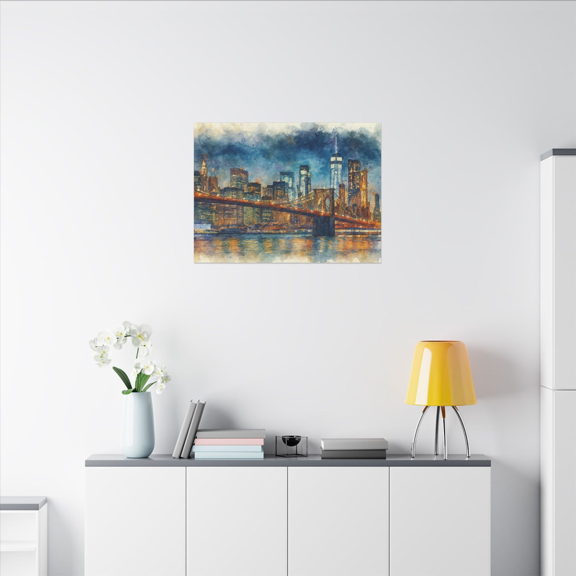 Bring the magic of New York City into your home with this stunning watercolor painting of the Brooklyn Bridge and NYC skyline at night. Featuring rich blues, glowing city lights, and the iconic Manhattan skyline reflected over the water, this artwork adds a vibrant urban touch to any room. Perfect for: Living rooms and modern loft spaces Office decor and conference rooms Gifts for New Yorkers, travelers, and city lovers Housewarming, Christmas, birthdays, and anniversaries This piece blends artistic watercolor texture with nighttime city ambiance, making it a standout focal point for your wall. Available as a poster or canvas print.
