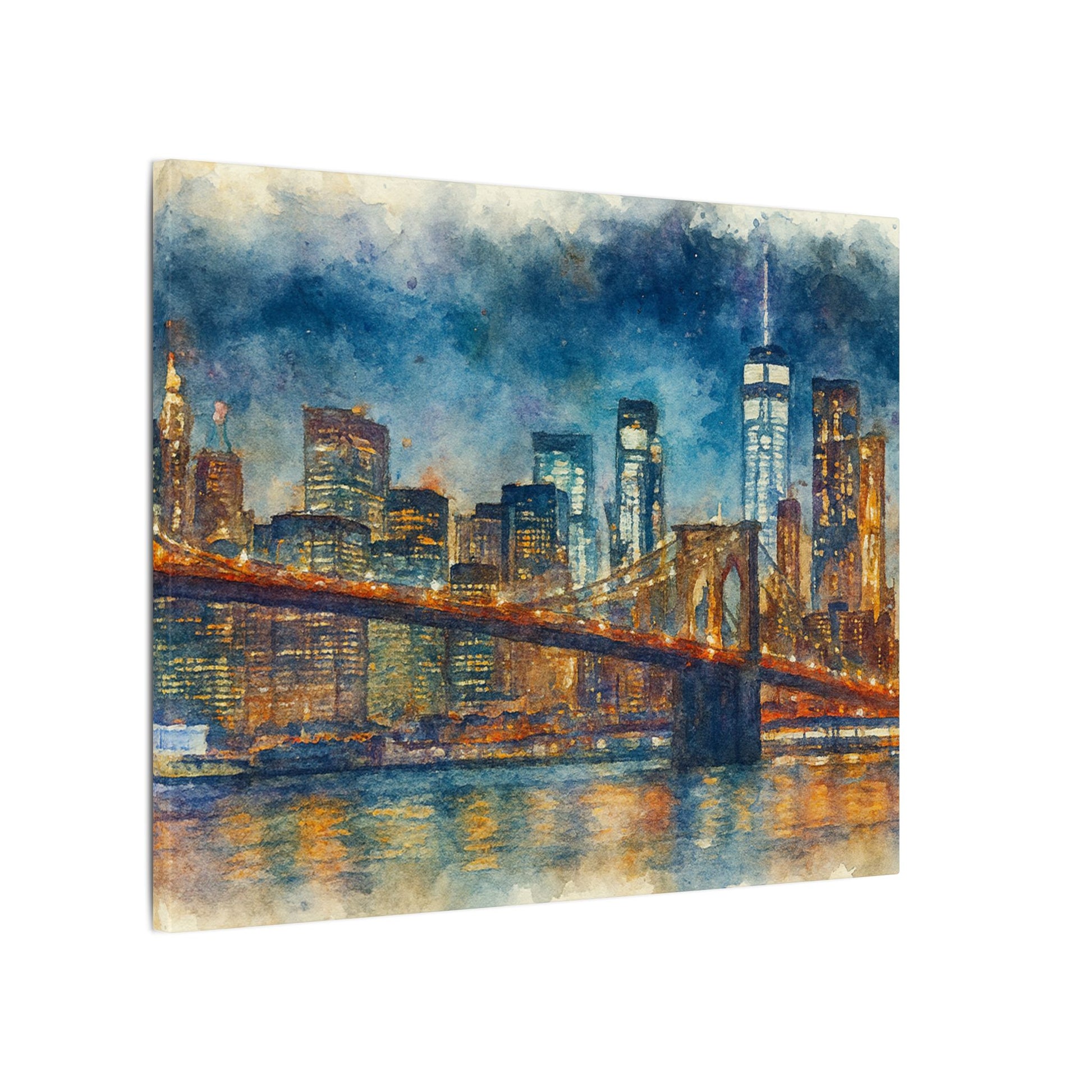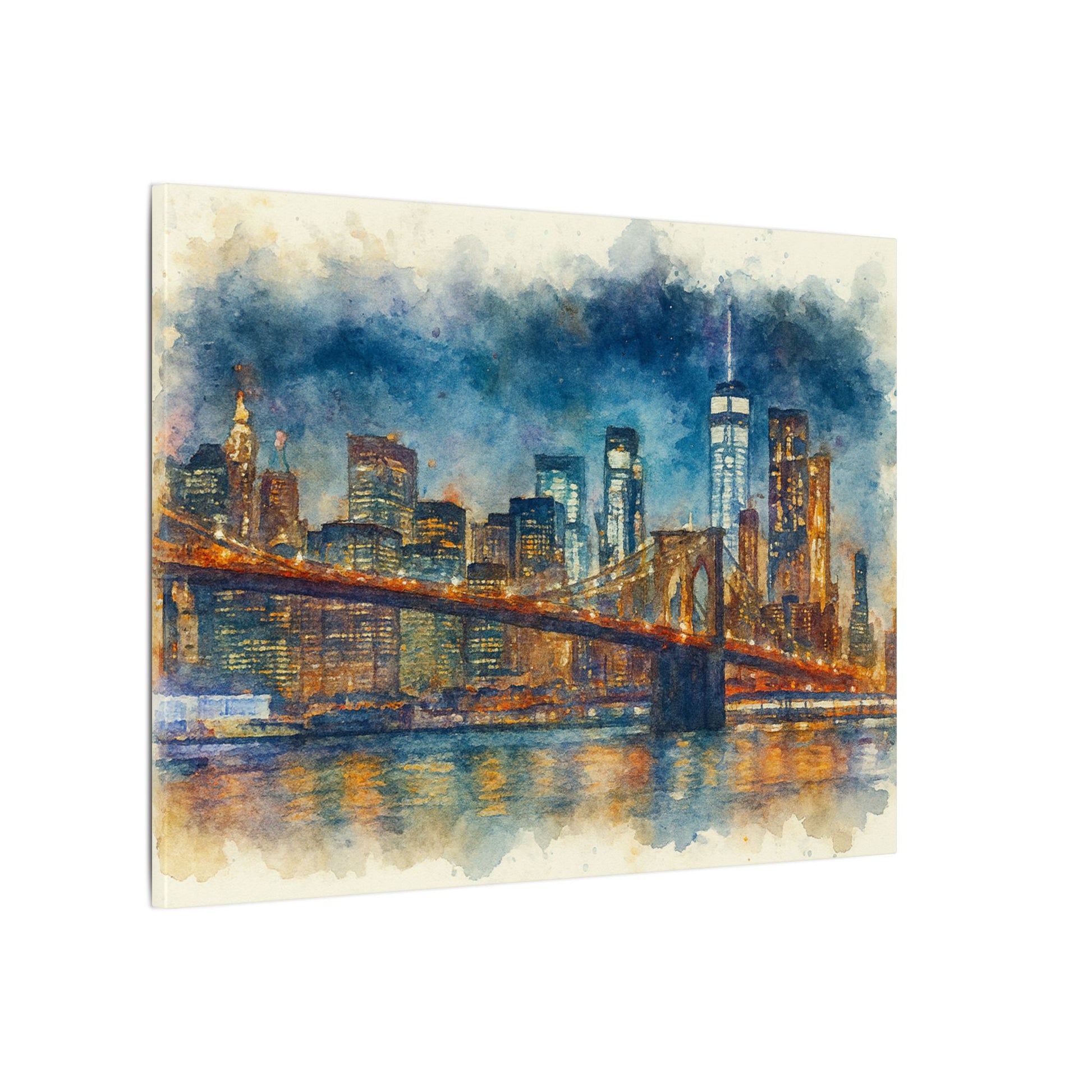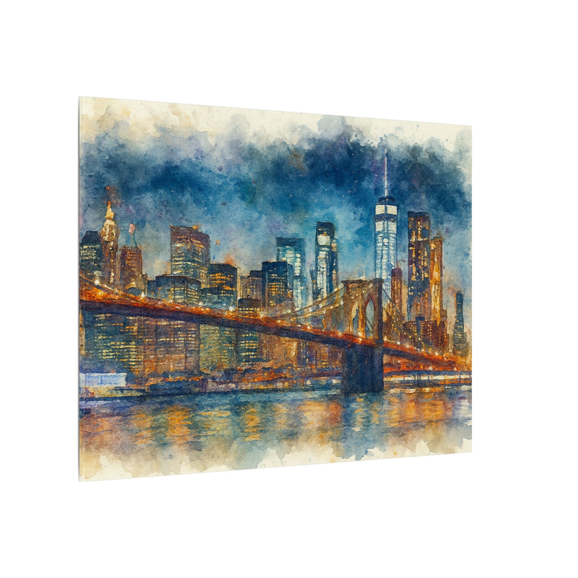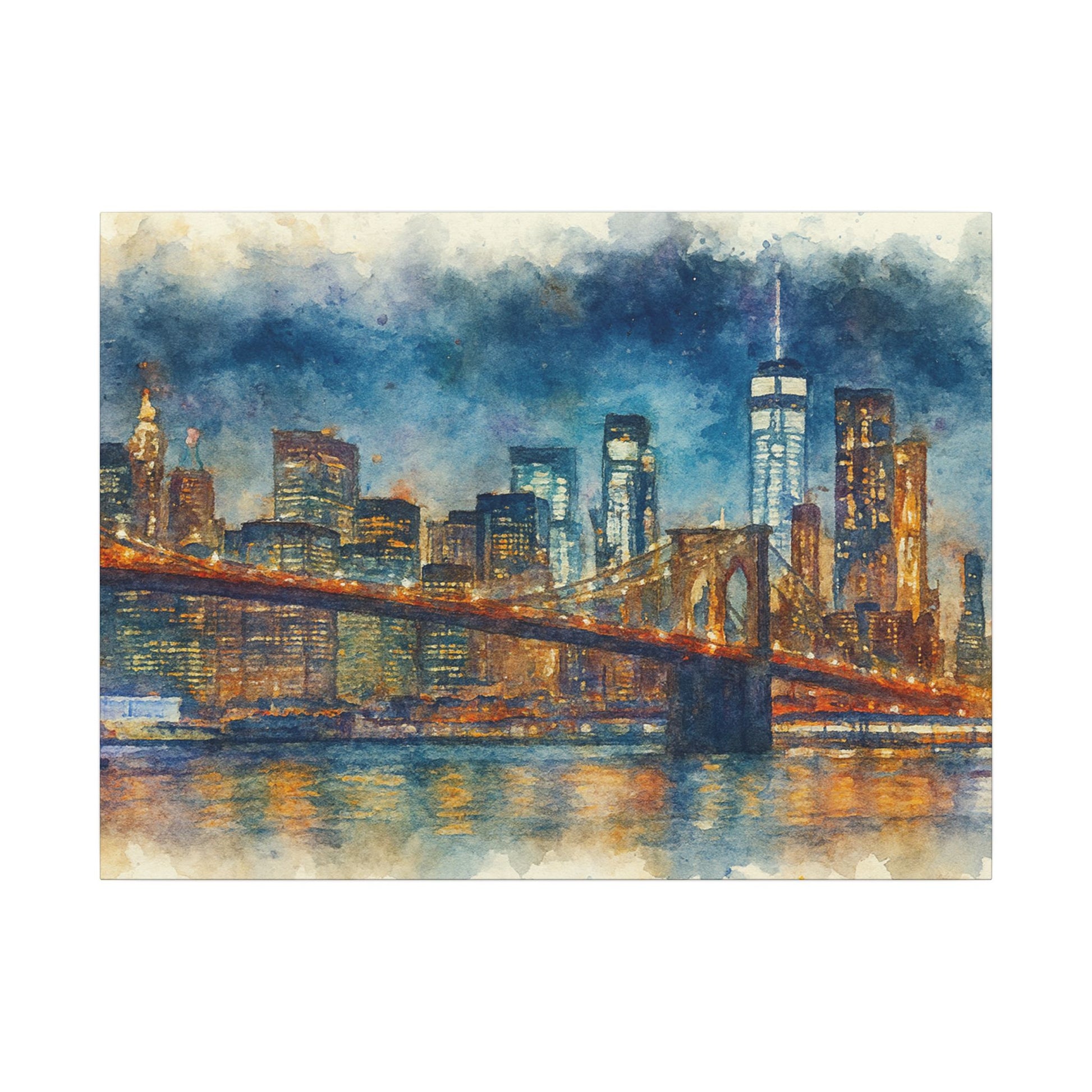 - Transform any space with this glowing New York City skyline watercolor; a timeless tribute to the Brooklyn Bridge and the energy of Manhattan with washes of indigo and gold across the surface, while capturing bridge lights reflected on slow water.