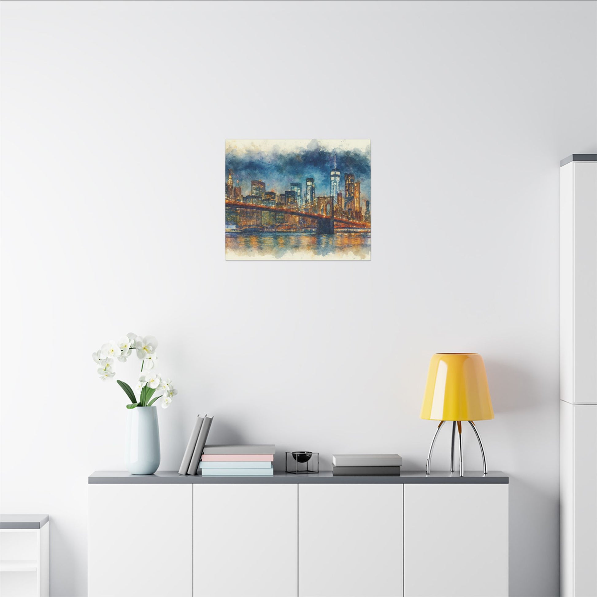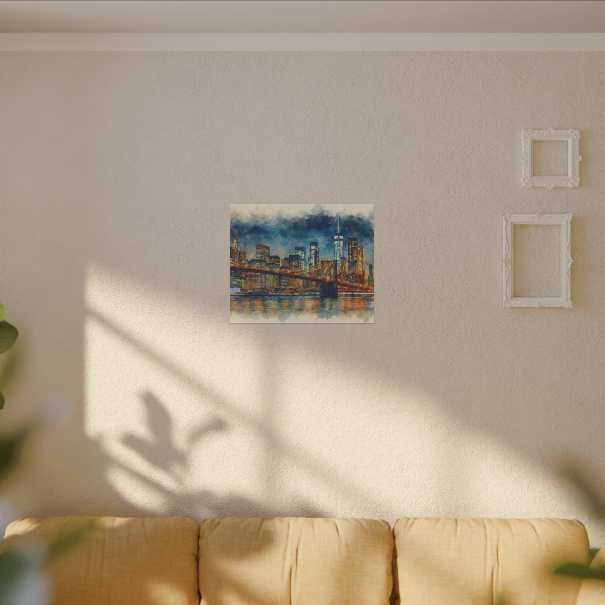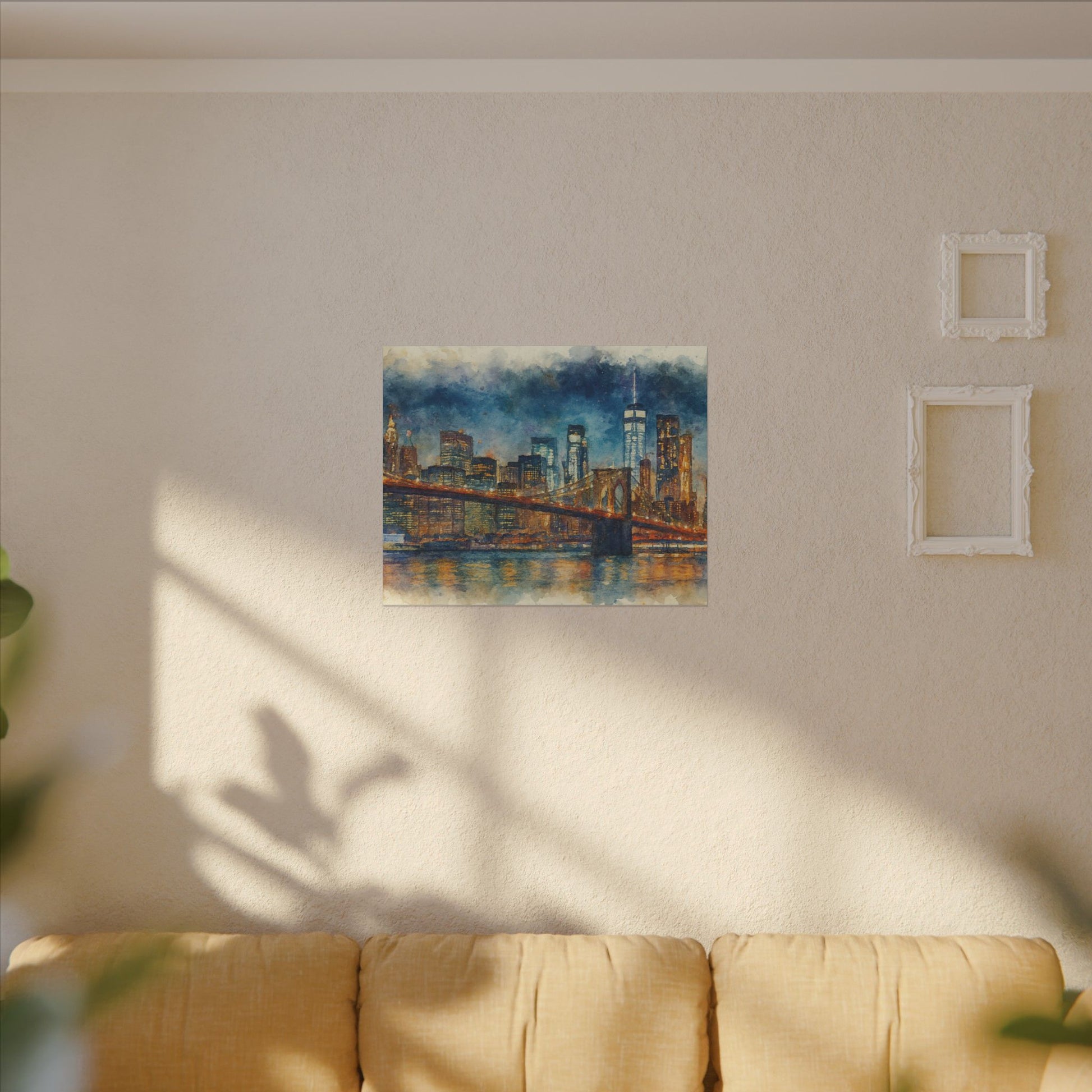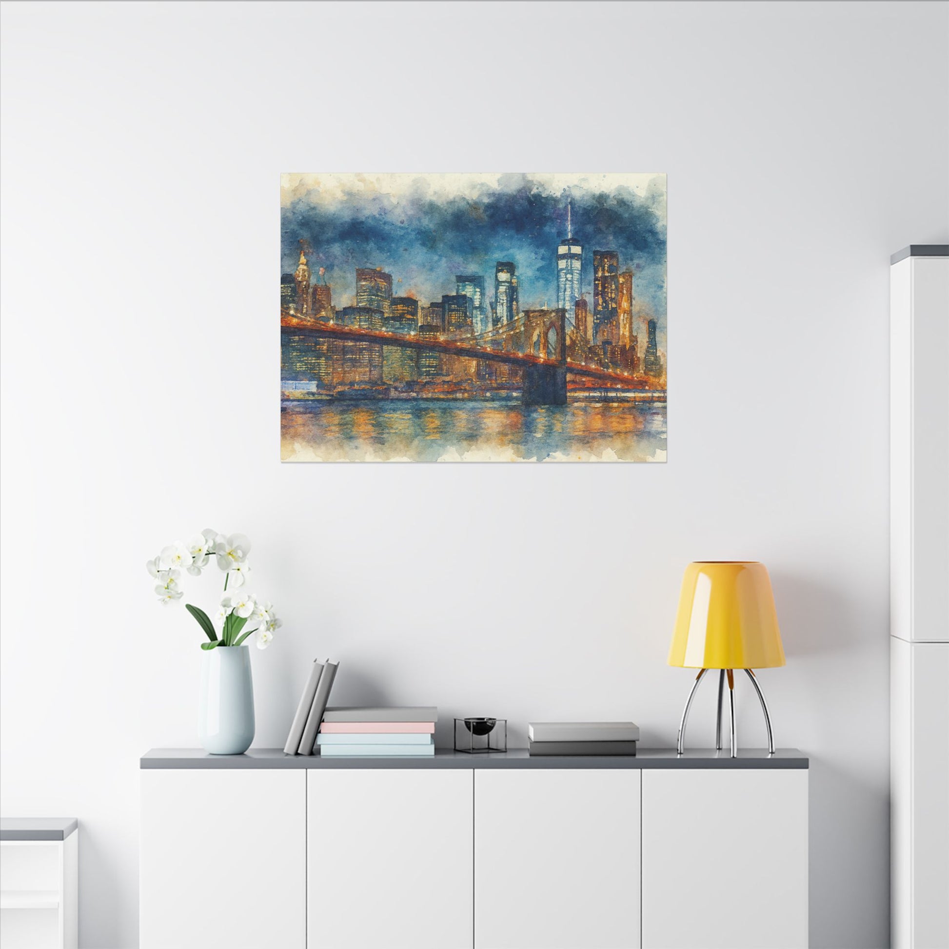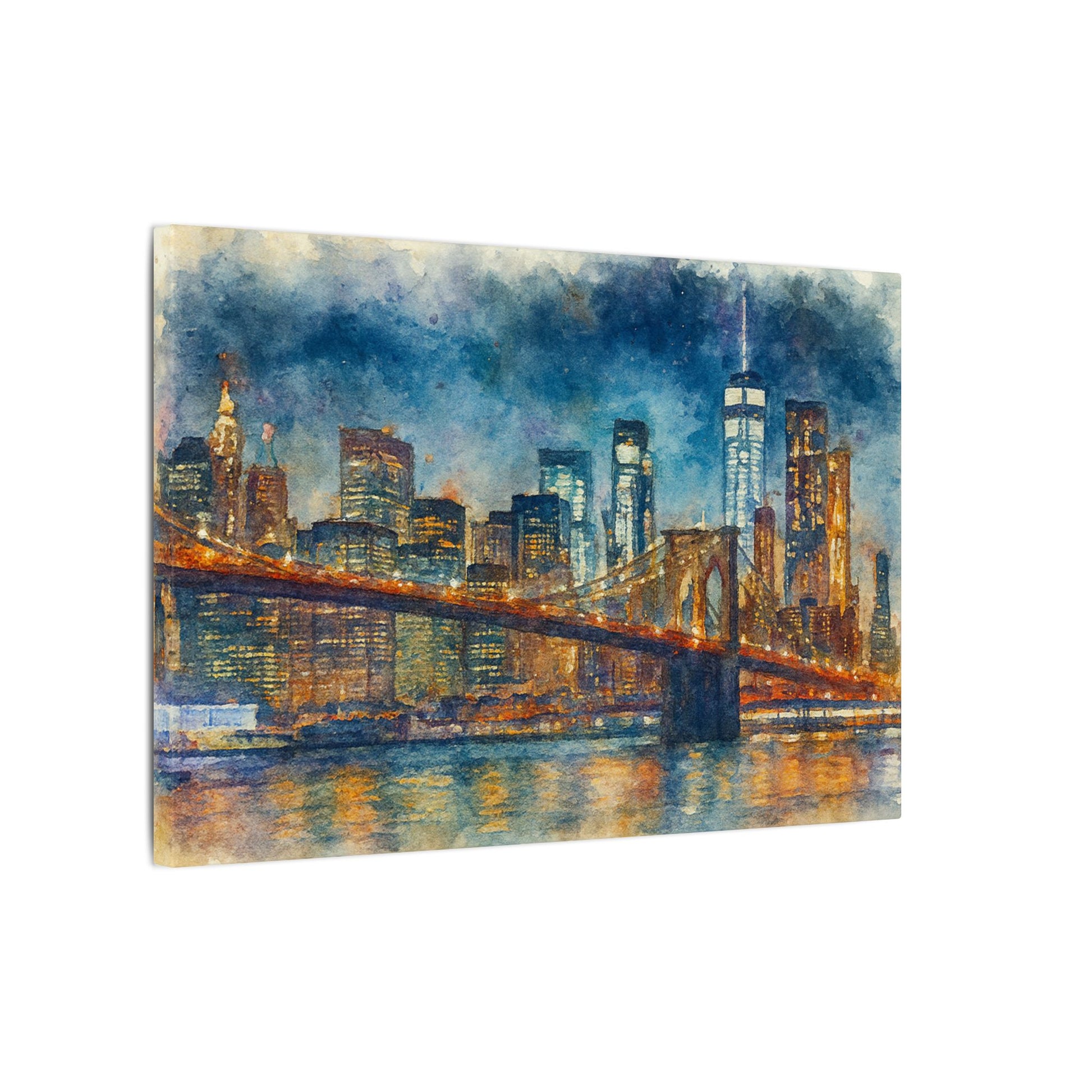 - Transform any space with this glowing New York City skyline watercolor; a timeless tribute to the Brooklyn Bridge and the energy of Manhattan with washes of indigo and gold across the surface, while capturing bridge lights reflected on slow water.