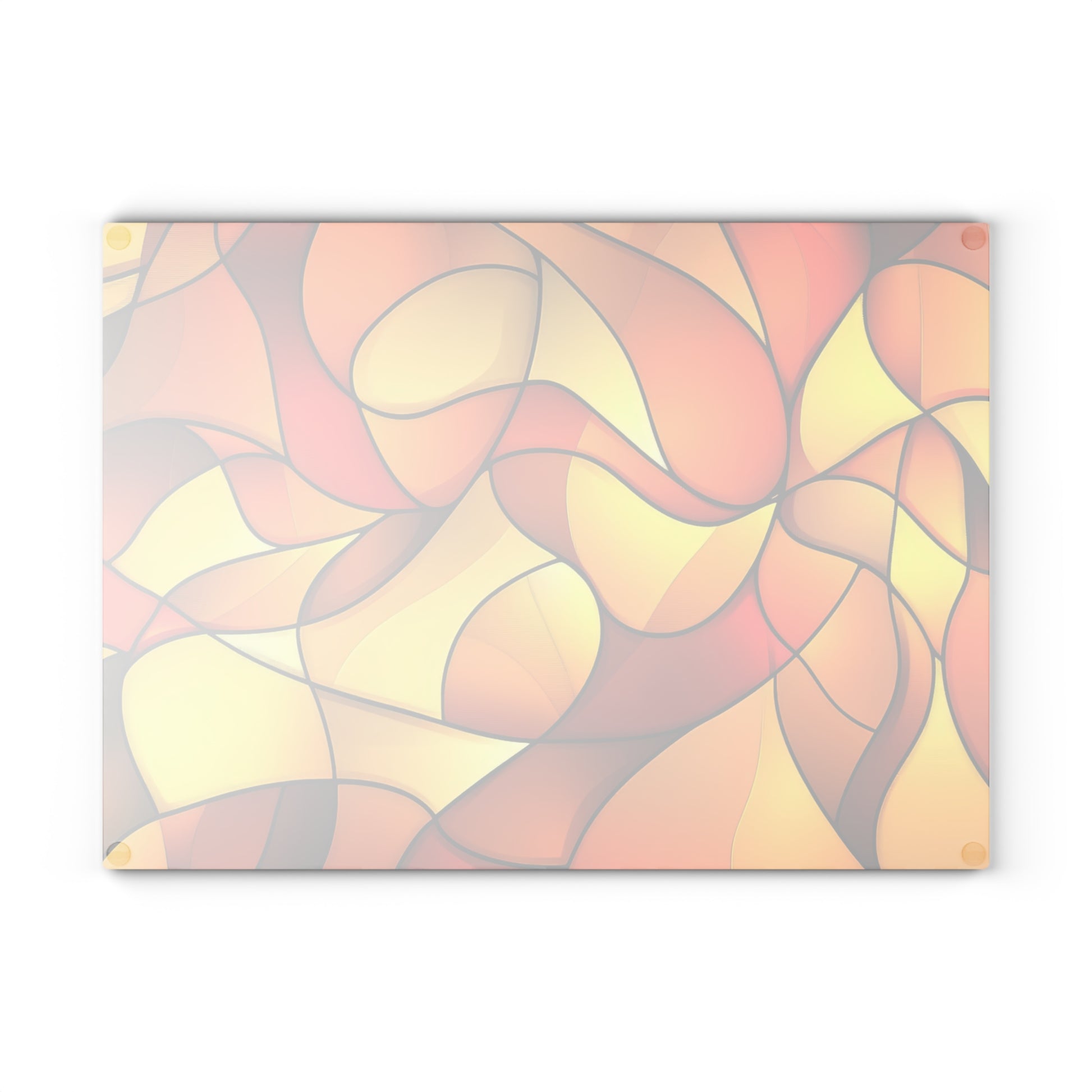 Bright, artful tempered glass board that brings warm, stained-glass energy to your kitchen. The abstract swirl of oranges, golds and reds reads like sunlight through colored panes — lively enough to display on the counter, resilient enough to use for prep. Its textured tempered surface resists nicks and stays hygienic, while a durable printing process locks in color so the design won’t fade or scratch during everyday use. Four non-slip rubber feet keep the board steady on tile or wood.