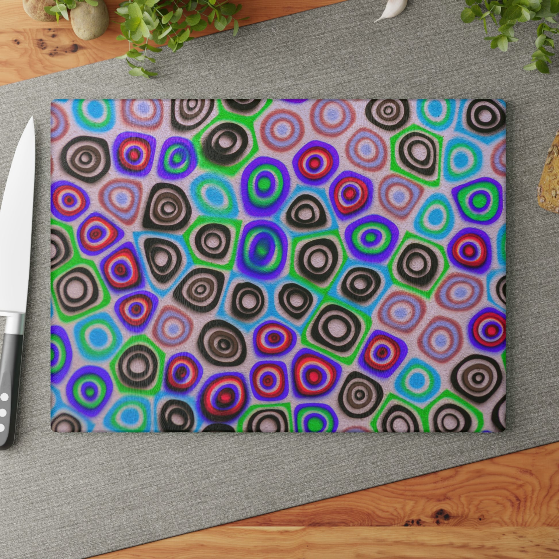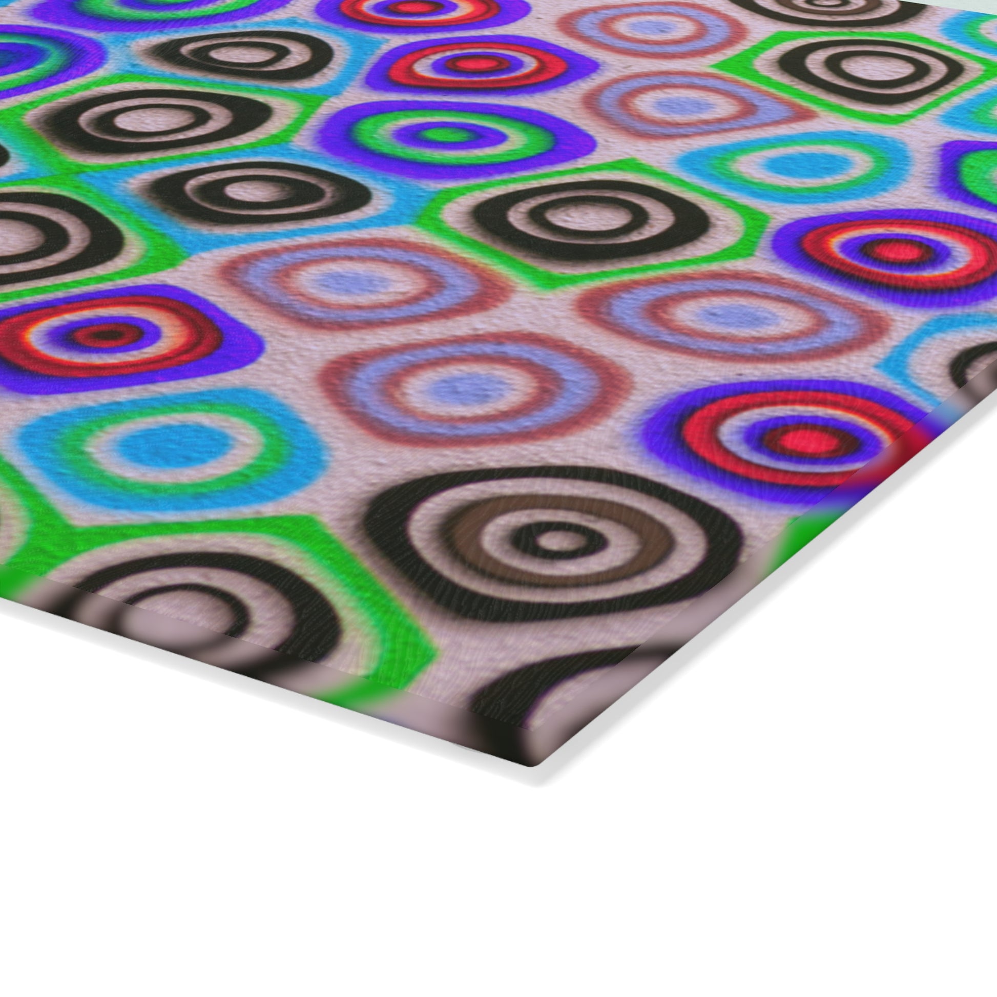 Bright, tactile, and joyful — this tempered glass cutting board brings playful color to everyday kitchen moments. Smooth, textured glass feels clean under the knife and showcases a lively mosaic of concentric rings in jewel tones. Four rubber feet hold it steady on countertops while the durable printing stays vivid through regular food prep.