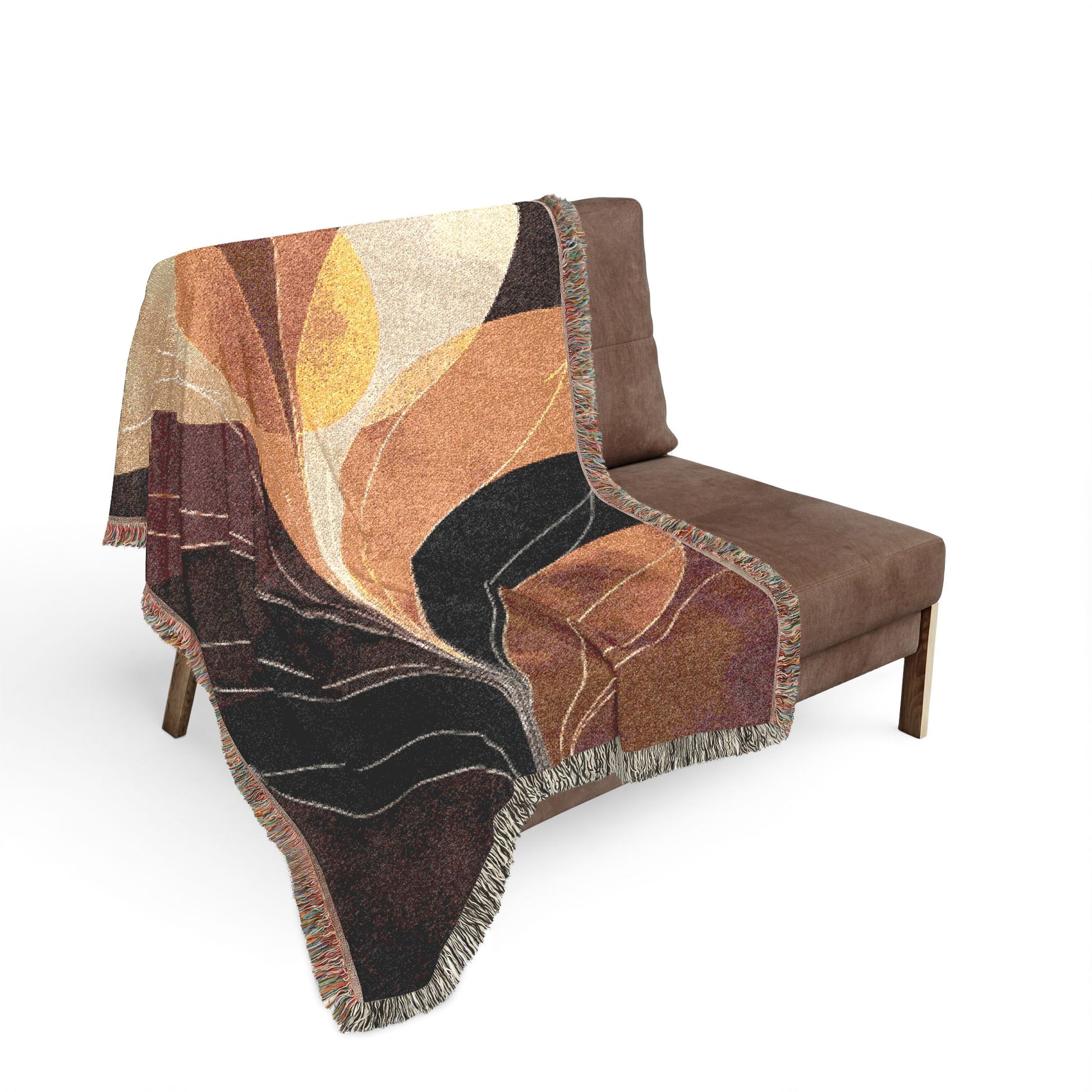 Bring bold retro style and cozy texture into your home with this sunburst-inspired woven throw blanket. Featuring an abstract geometric design in rich warm tones of brown, copper, tan, and gold on a deep black background, this piece perfectly captures mid-century modern elegance with a contemporary twist.