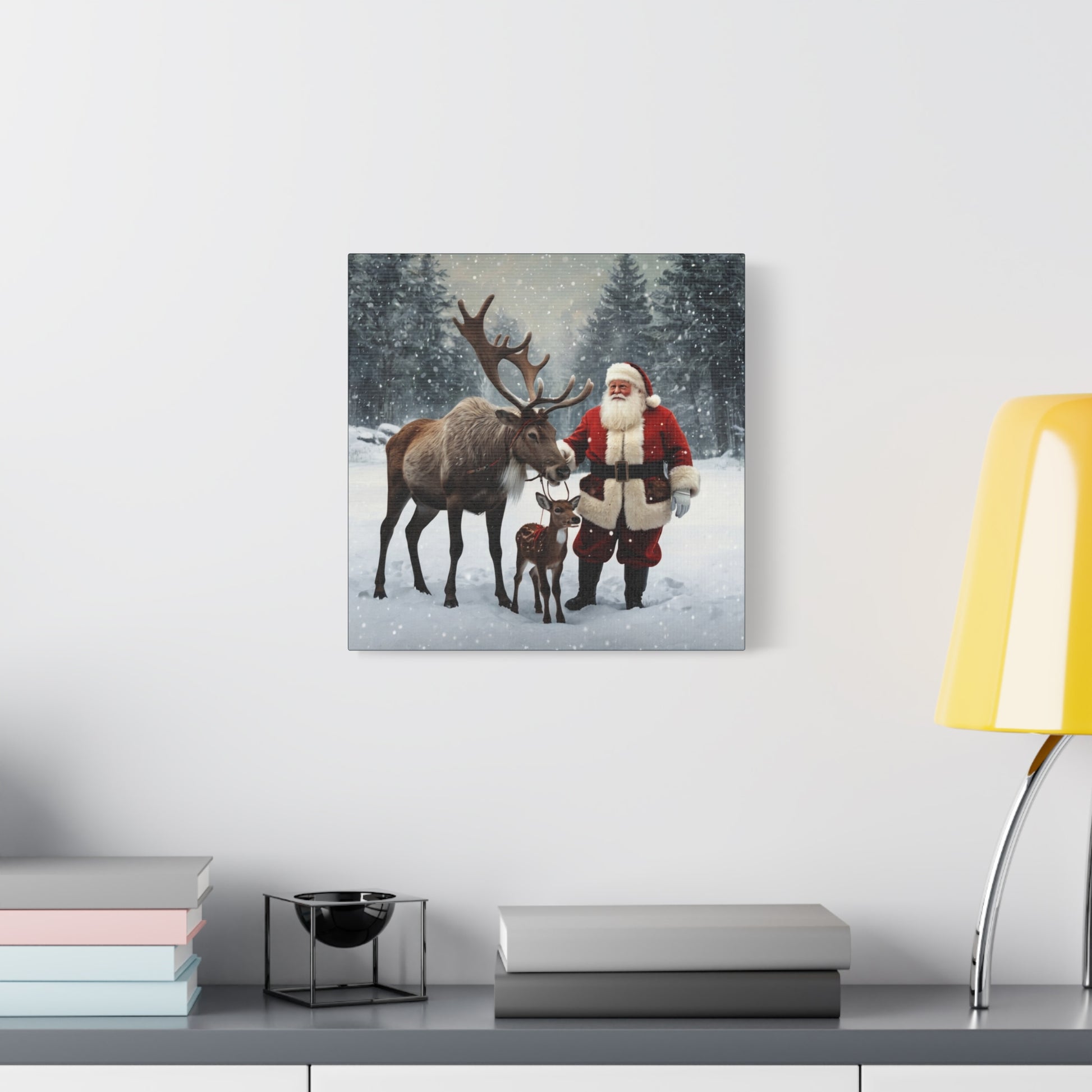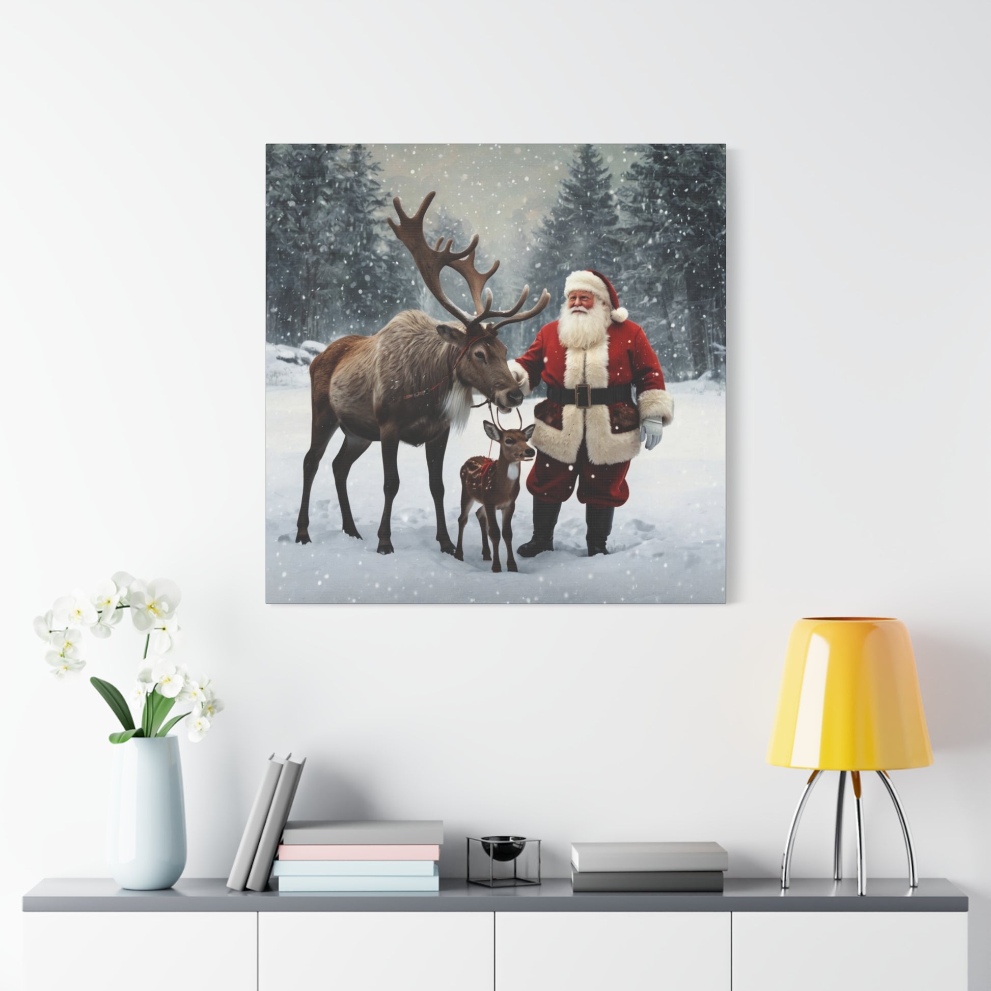 - High-quality canvas print with vivid holiday colors Santa and reindeer festive design