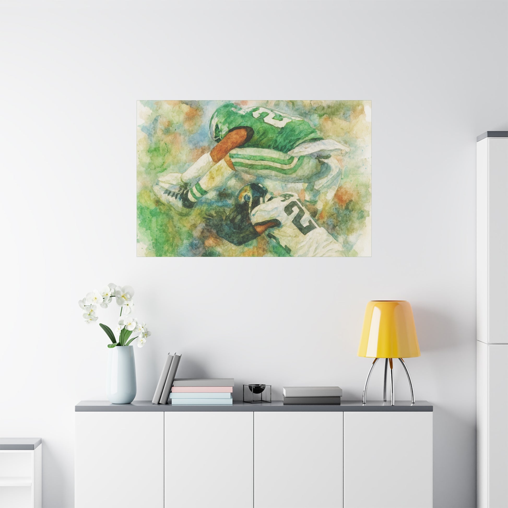 Celebrate one of the most unforgettable moments in football with this watercolor canvas print of Saquon Barkley’s iconic backward hurdle. Perfect for Philadelphia Eagles fans and sports enthusiasts, this piece captures the explosive power, balance, and artistry of the game in vivid watercolor tones — ideal for any fan cave, man cave, office, or living room. Professionally printed on premium 1.25" stretched canvas, this art piece combines rich color detail with a hand-painted watercolor aesthetic. A perfect sports gift for birthdays, holidays, Father’s Day, or game-day celebrations.