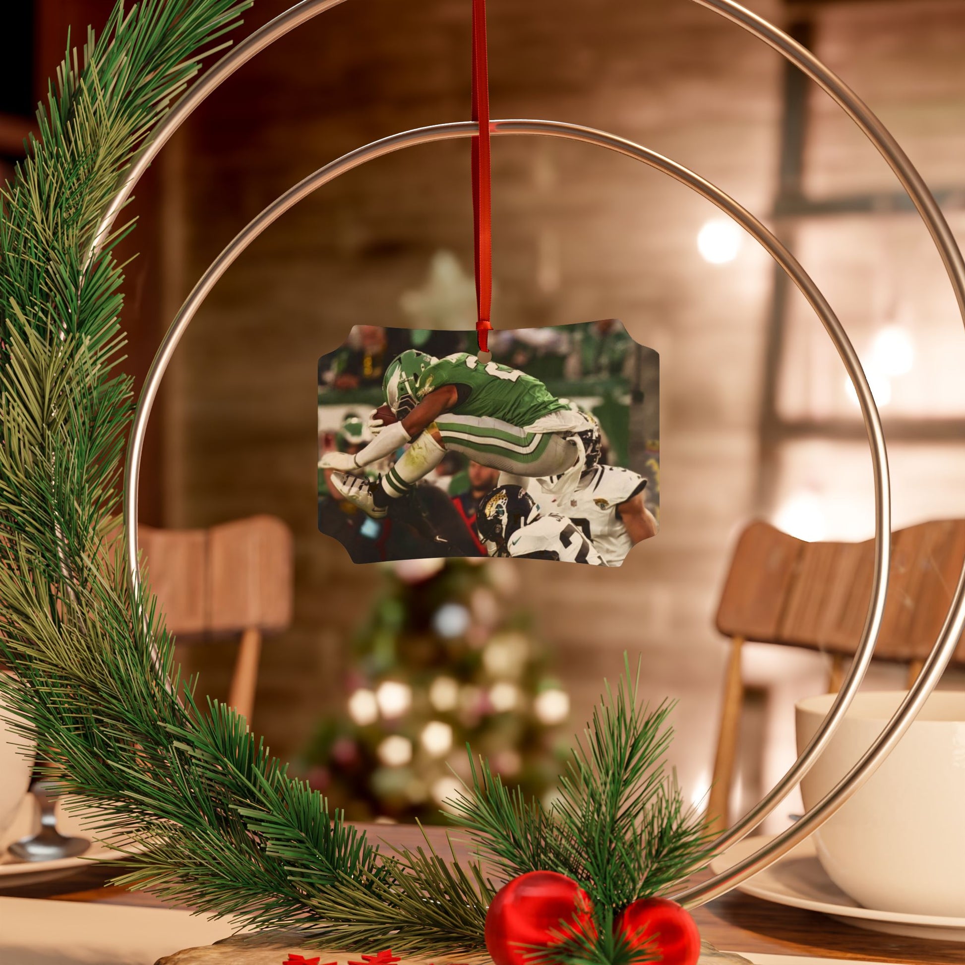 Bring the excitement of the game to your Christmas tree with this one-of-a-kind ornament, celebrating Saquon Barkley’s epic style! Capture the thrill of Barkley’s incredible airborne moves over the defense in your holiday decor—a perfect gift for fans of football and athletic feats alike. Hang it on your tree, hang it in your car. It's the perfect gift to add to your memorabilia. Made from aluminum with the image on one side. All ornaments come with a satin ribbon for hanging and a matte finish. Size: height 2.79 x 3.79 wide.