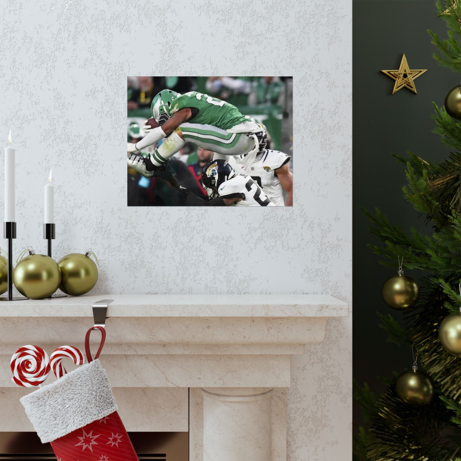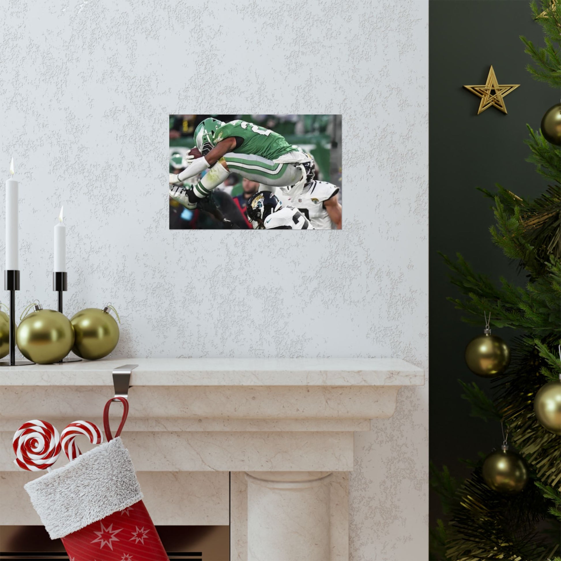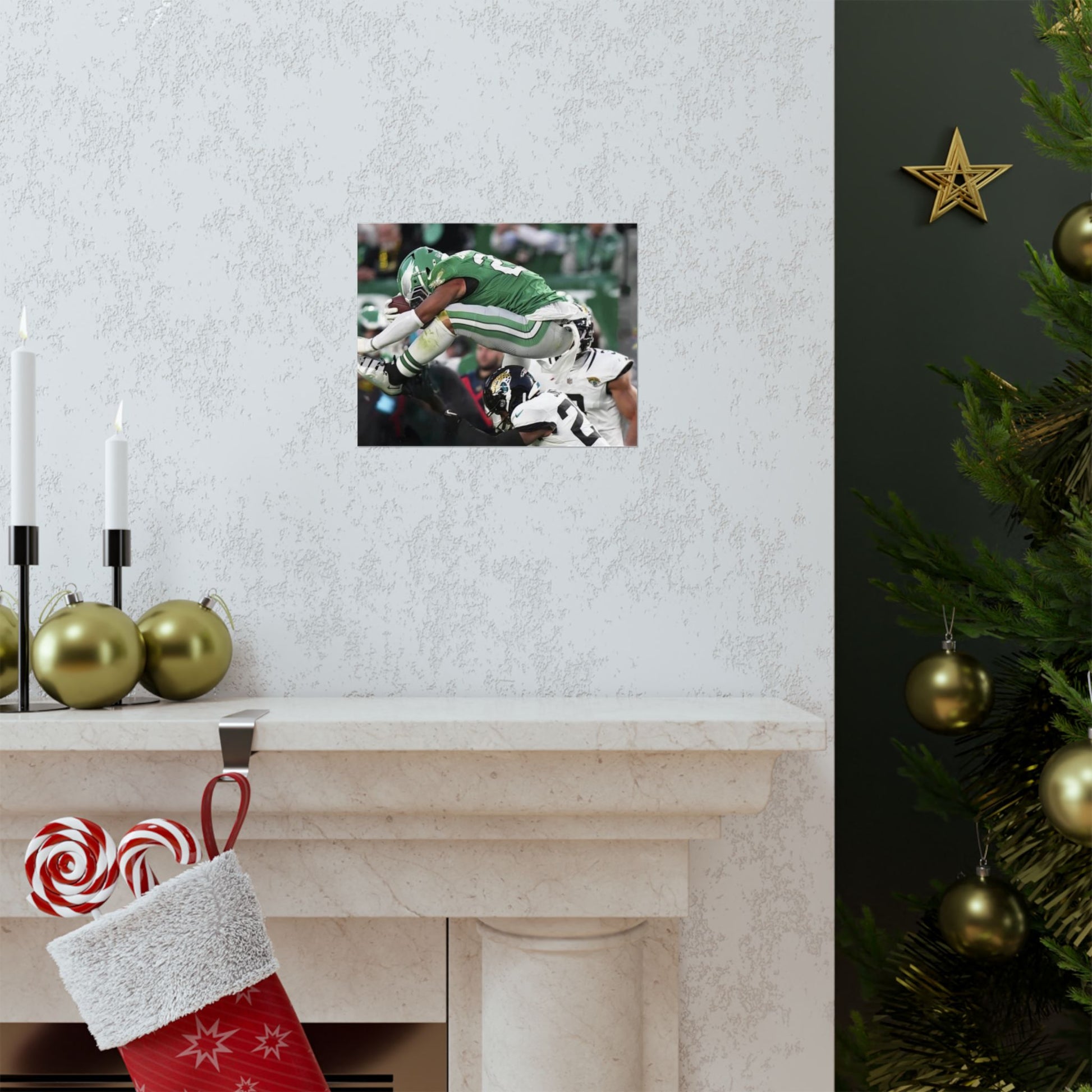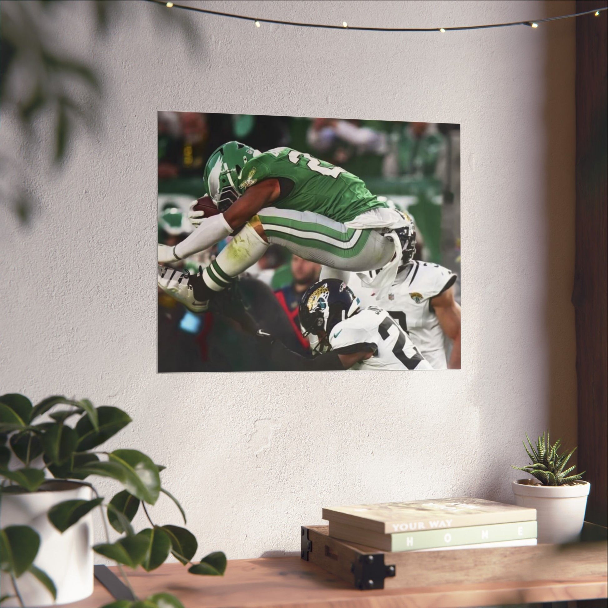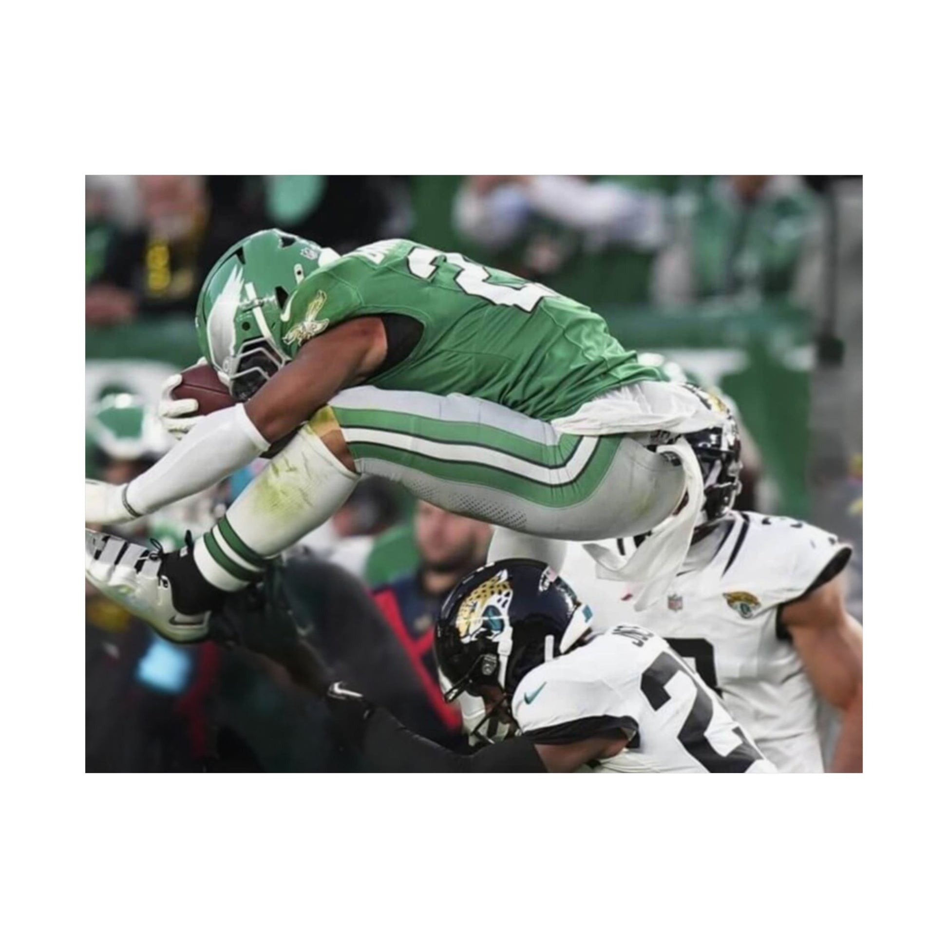 Saquon Barkley Reverse Hurdle Poster for Eagles' fan cave. This poster showcases the amazing reverse hurdle by Saquon Barkley. Perfect for your fan cave or sports-themed room. Ideal for Philadelphia Eagles fans or football lovers. Decorate your fan cave, man cave, sports-themed room, or give as a gift for a football fan during birthdays, holidays, or game days. Poster comes rolled so can be hung as is, or framed.