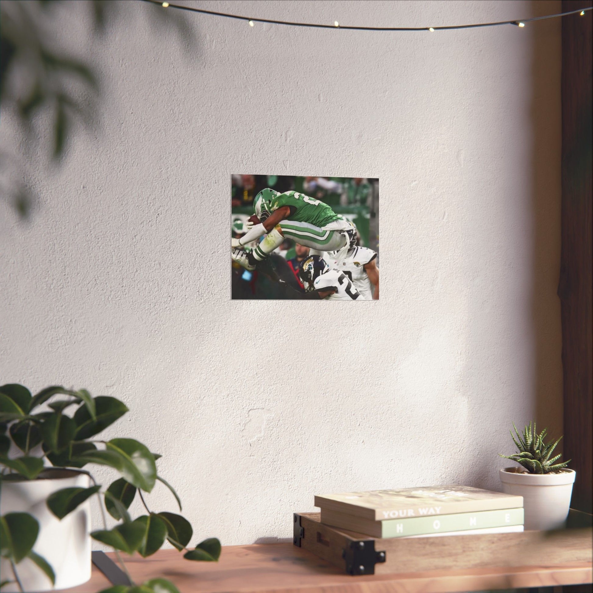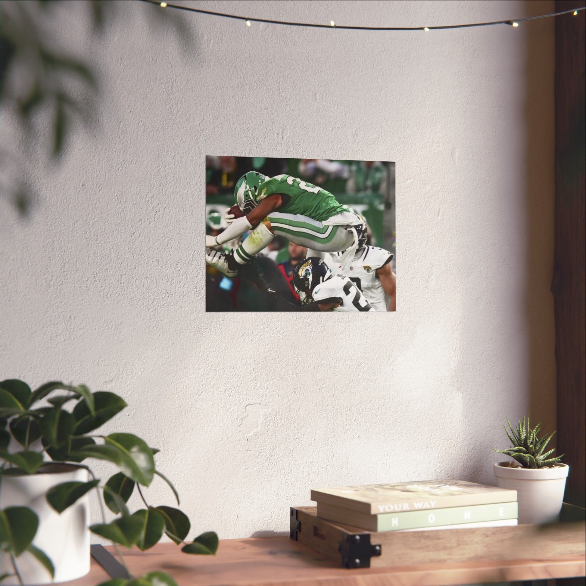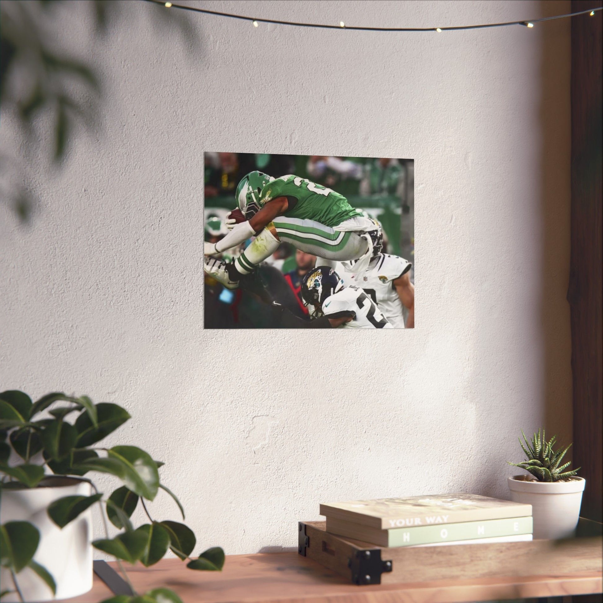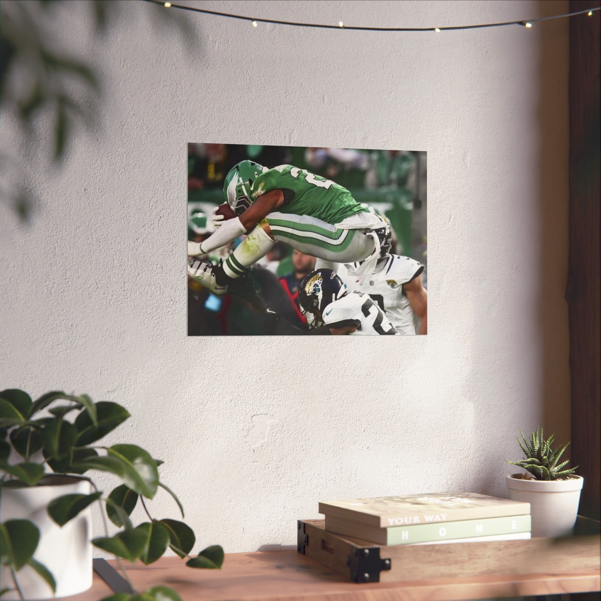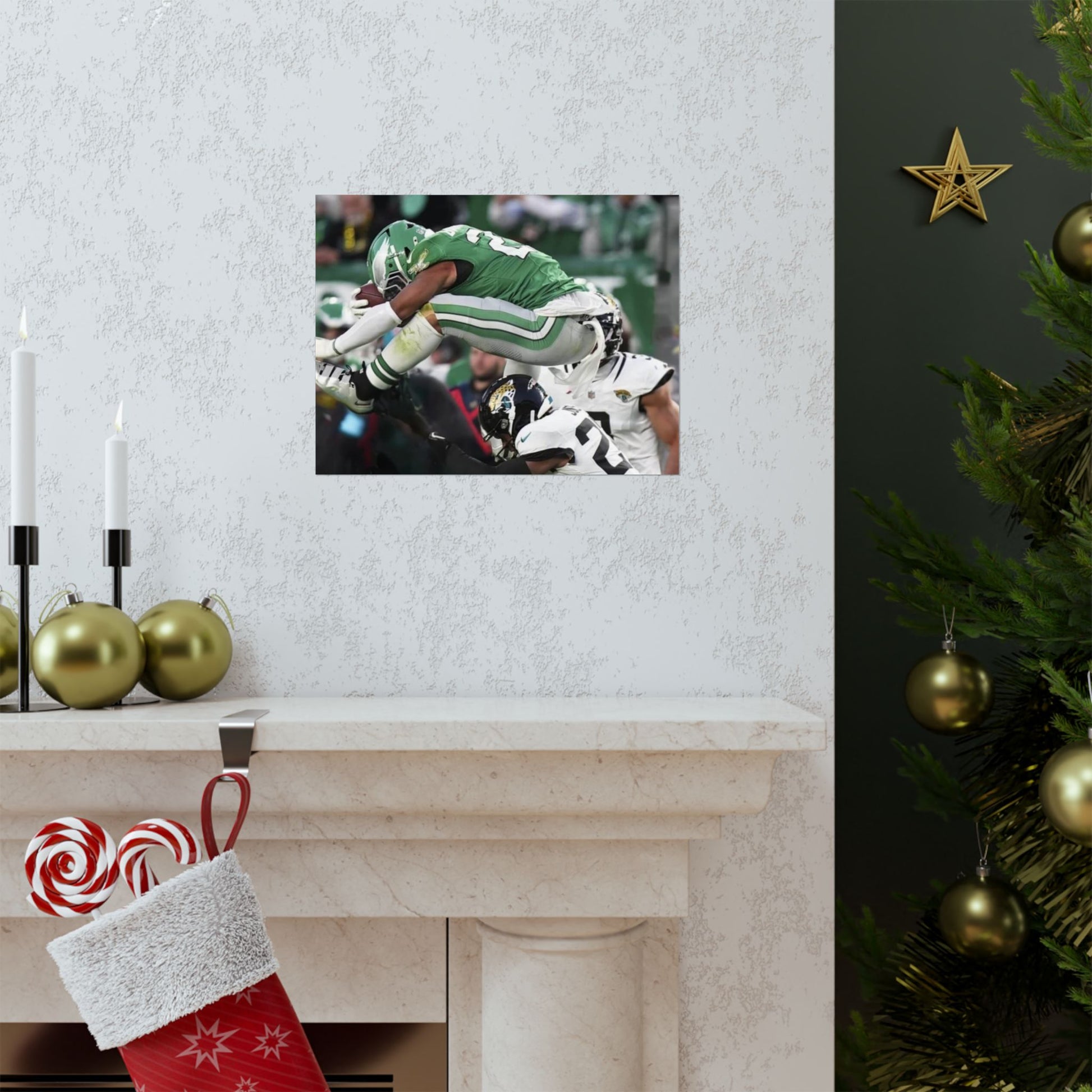 Saquon Barkley Reverse Hurdle Poster for Eagles' fan cave. This poster showcases the amazing reverse hurdle by Saquon Barkley. Perfect for your fan cave or sports-themed room. Ideal for Philadelphia Eagles fans or football lovers. Decorate your fan cave, man cave, sports-themed room, or give as a gift for a football fan during birthdays, holidays, or game days. Poster comes rolled so can be hung as is, or framed.