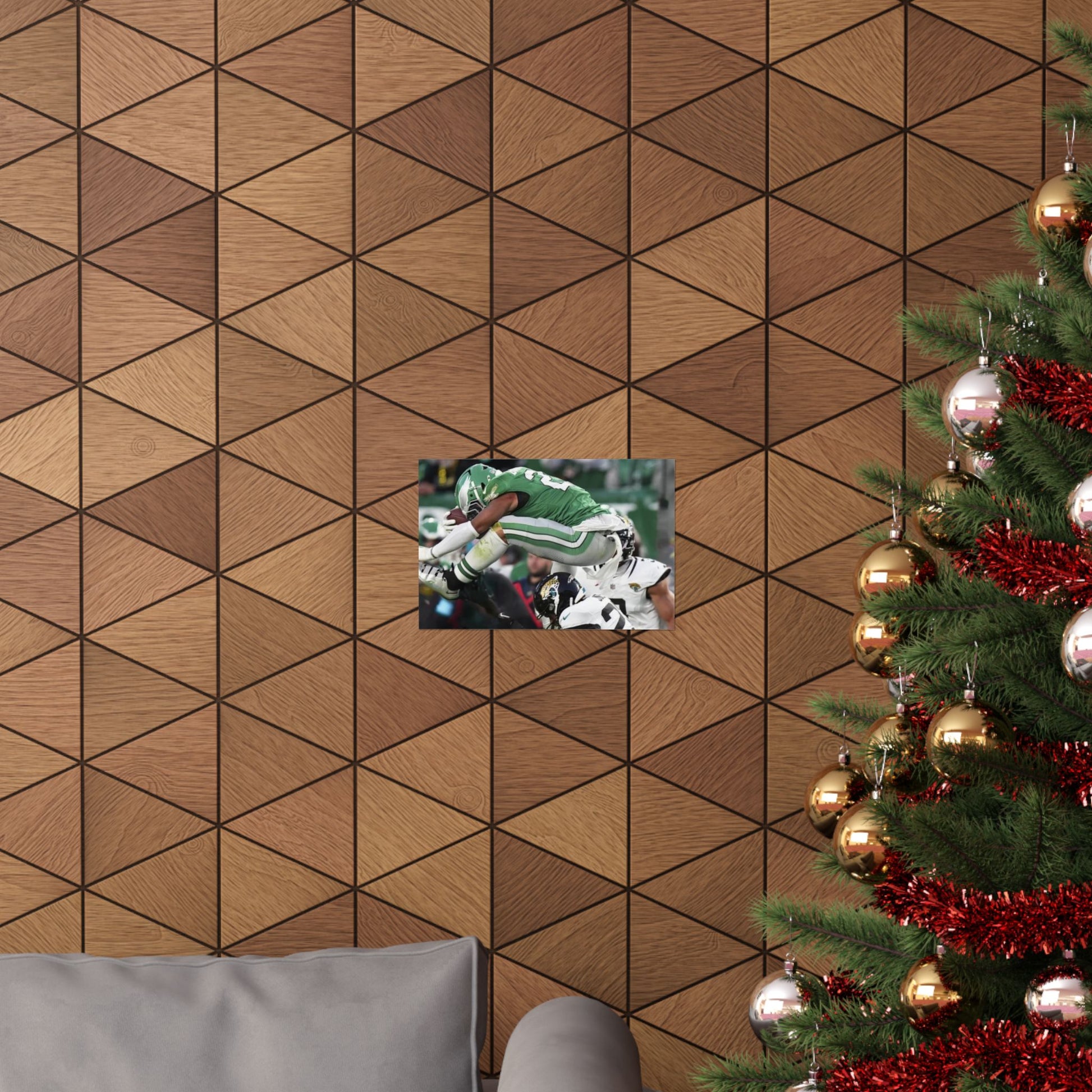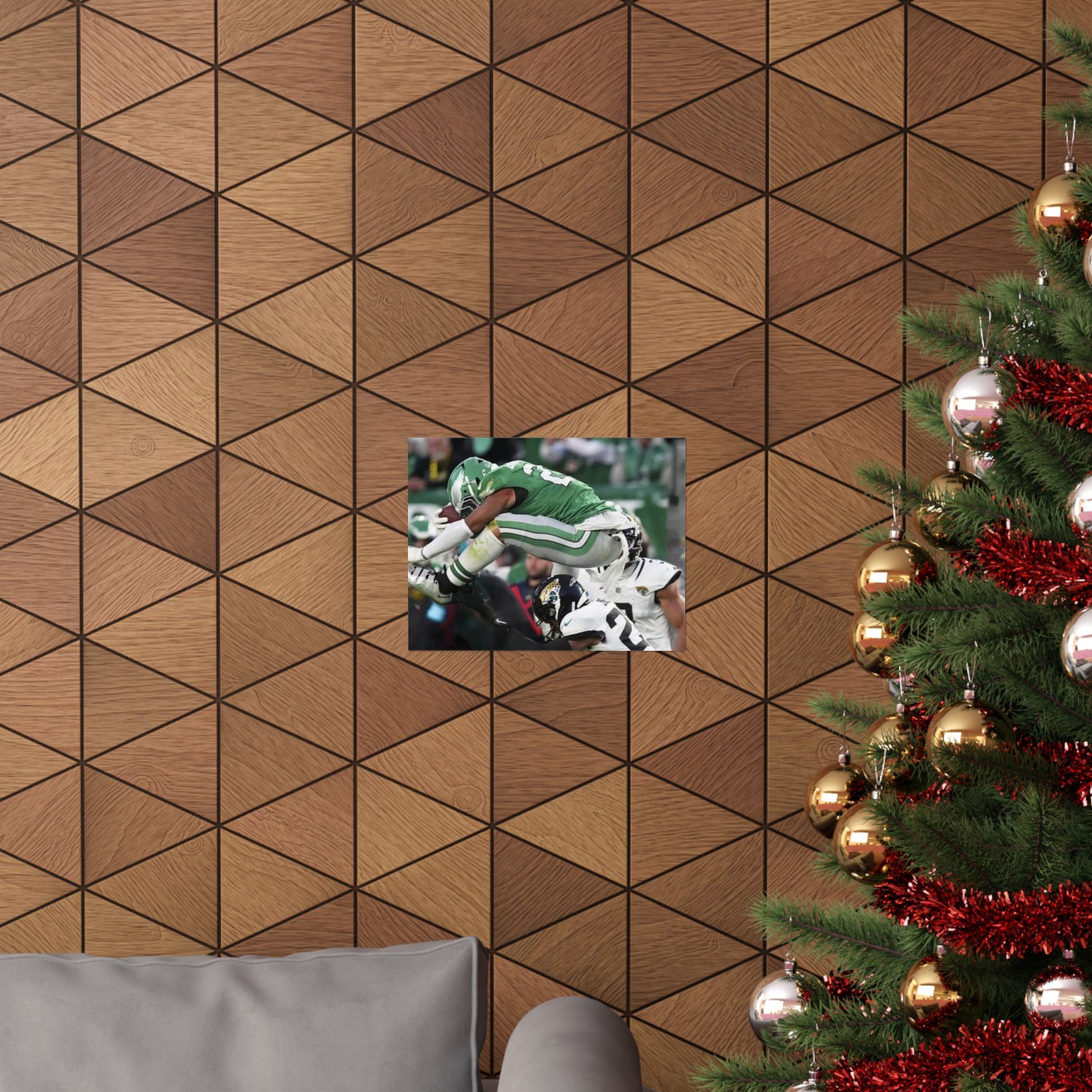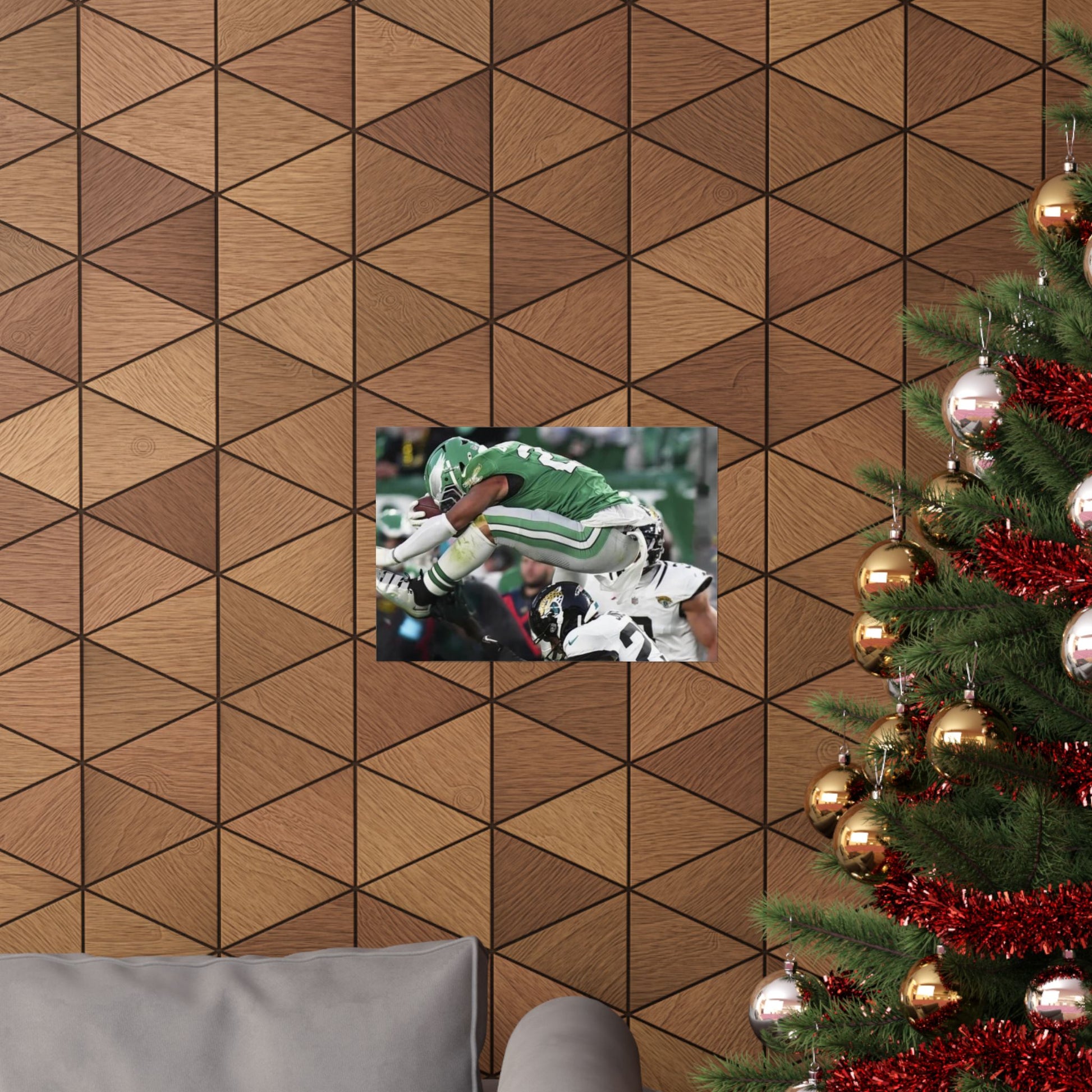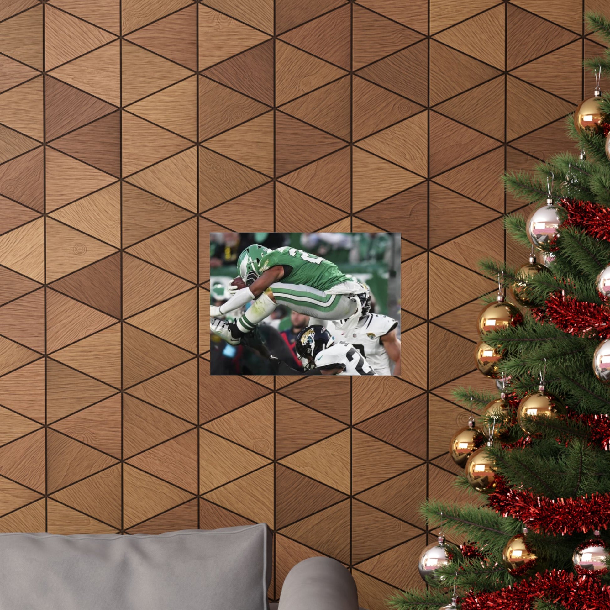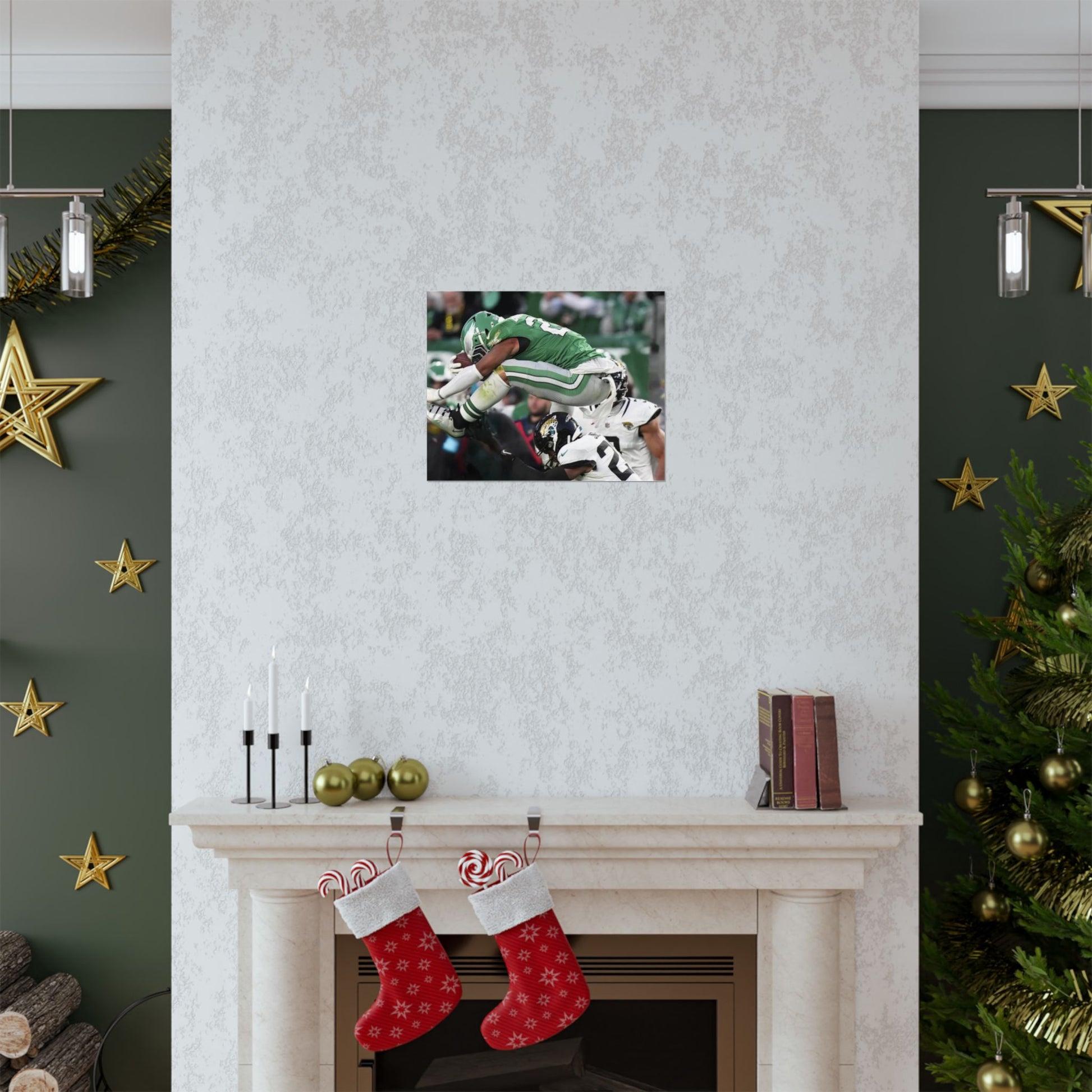 Saquon Barkley Reverse Hurdle Poster for Eagles' fan cave. This poster showcases the amazing reverse hurdle by Saquon Barkley. Perfect for your fan cave or sports-themed room. Ideal for Philadelphia Eagles fans or football lovers. Decorate your fan cave, man cave, sports-themed room, or give as a gift for a football fan during birthdays, holidays, or game days. Poster comes rolled so can be hung as is, or framed.