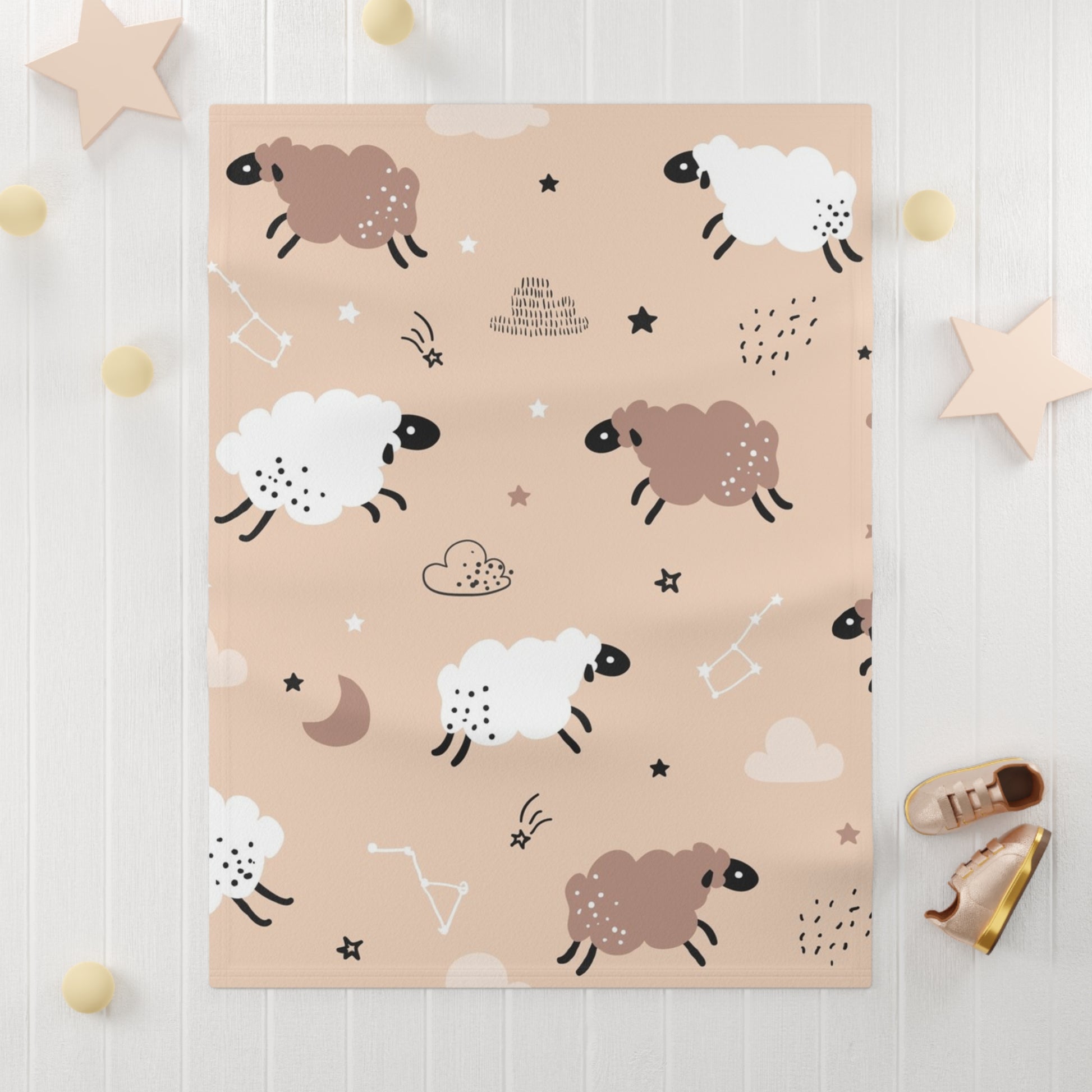 Soft fleece baby blanket featuring a cute cartoon sheep design. Perfect for keeping infants warm and cozy, this blanket is ideal for nursery décor and makes a great gift for baby showers or birthdays. Relevant for baby showers, birthdays, and holidays like Christmas.