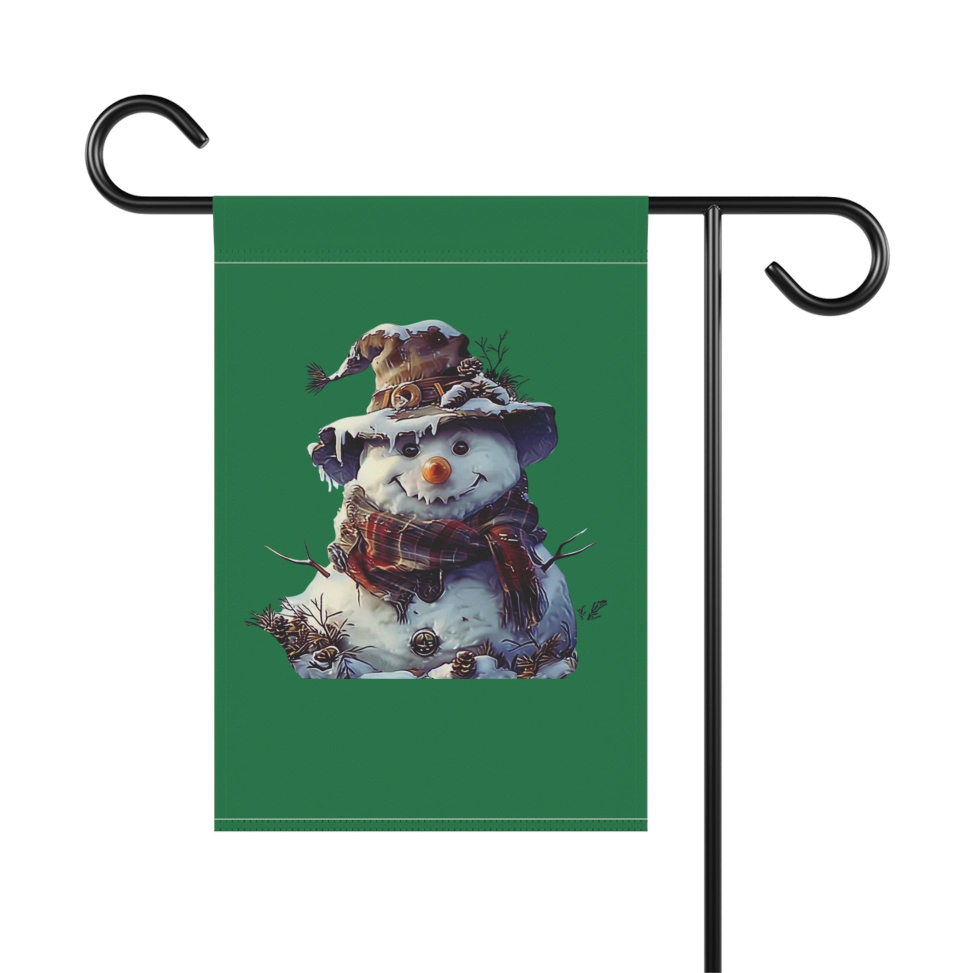 A cheerful garden banner that brings winter whimsy to your doorstep. A friendly snowman in a floppy hat and cozy scarf stands against a rich green background, waving in the breeze. The double-sided print keeps the image readable from either side, and the soft-but-durable poly poplin-canvas shows off bright, crisp colors that stay true through the season. Slip it onto a standard garden flag pole or stand via the top sleeve and let it add a warm, handmade feel to porch steps, entryways, or garden beds during snowy afternoons, holiday strolls, or quiet winter evenings.