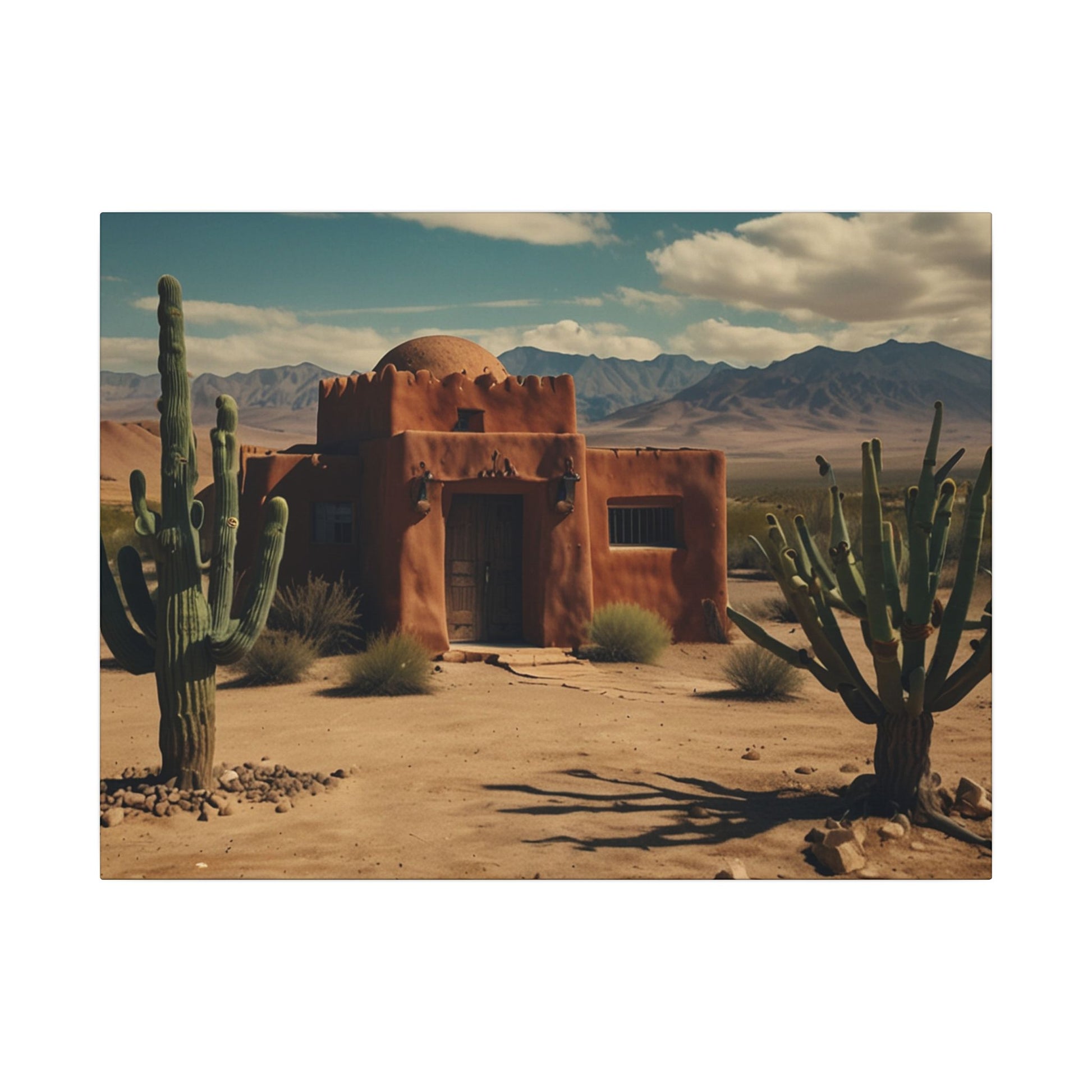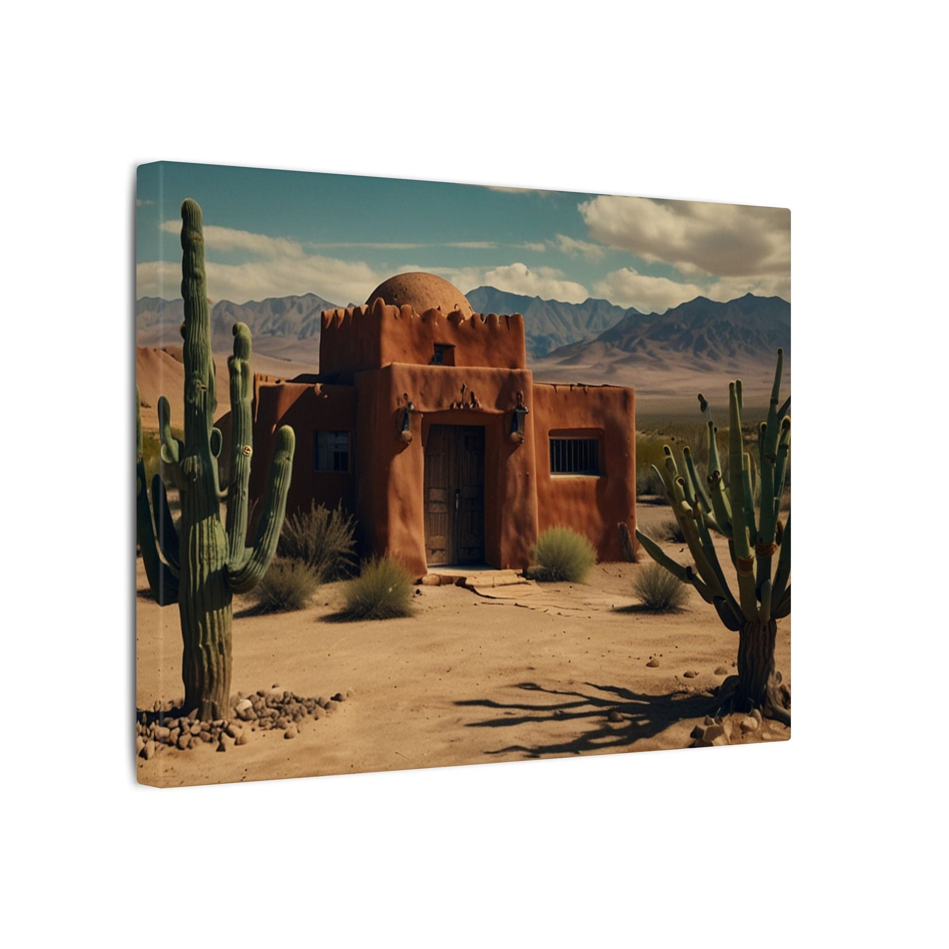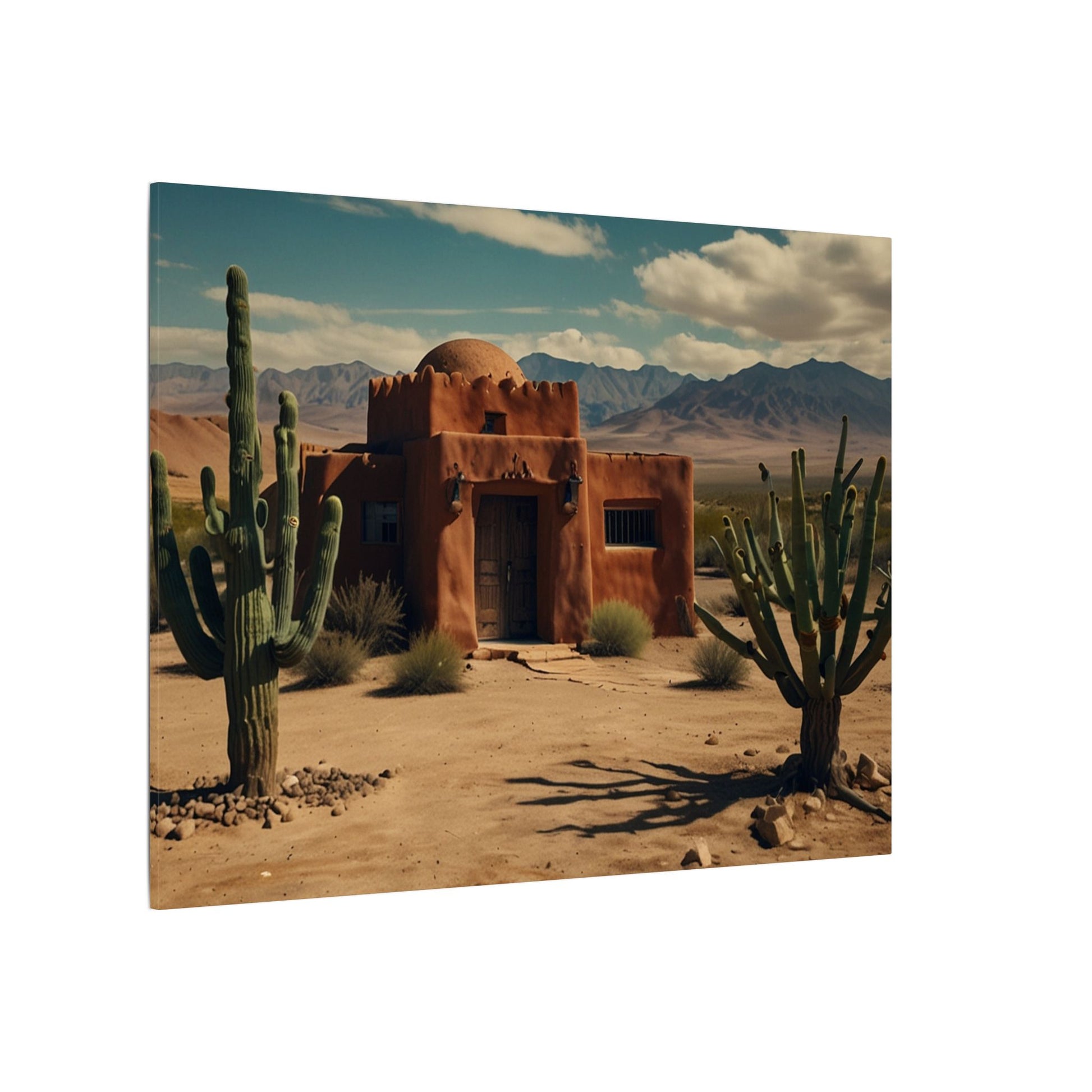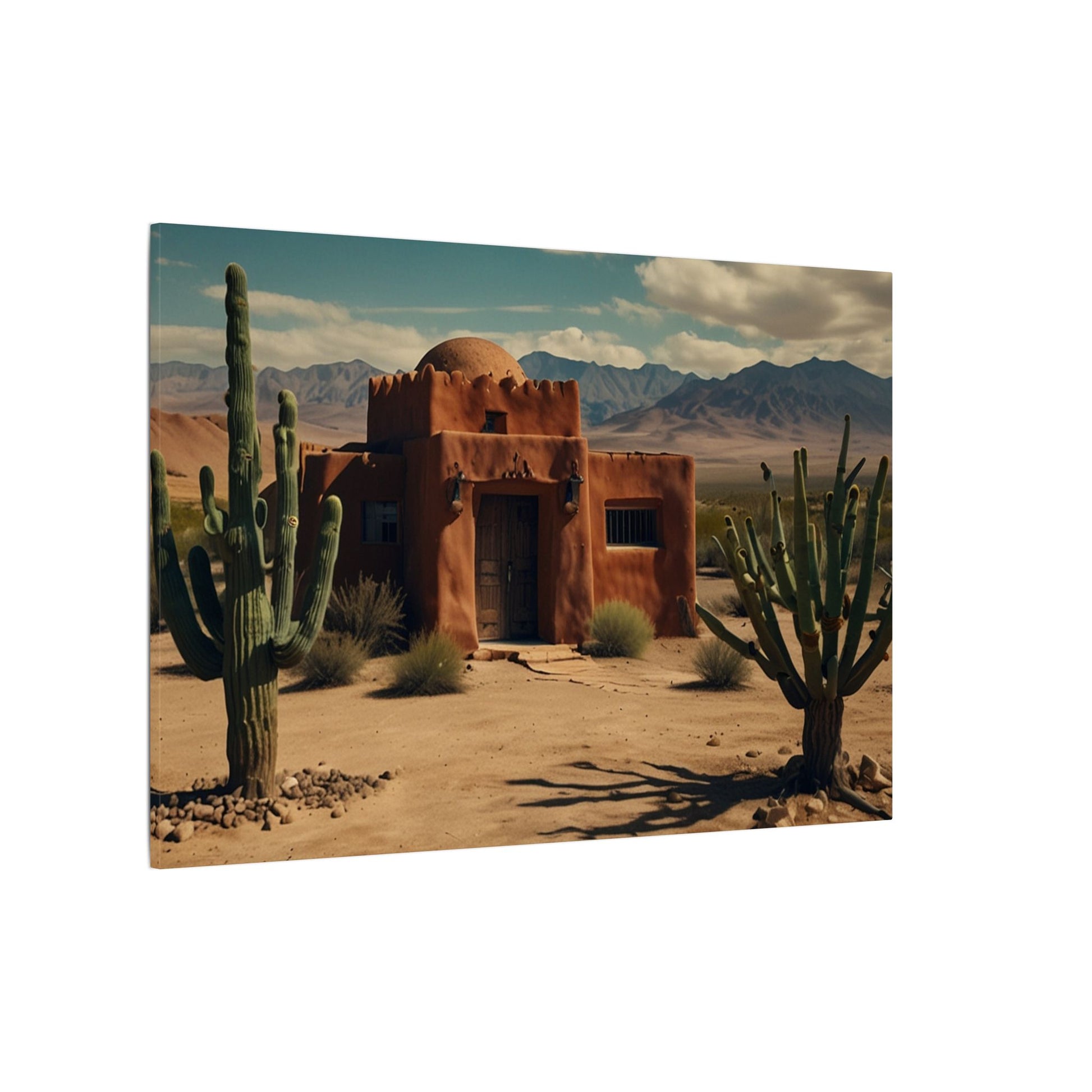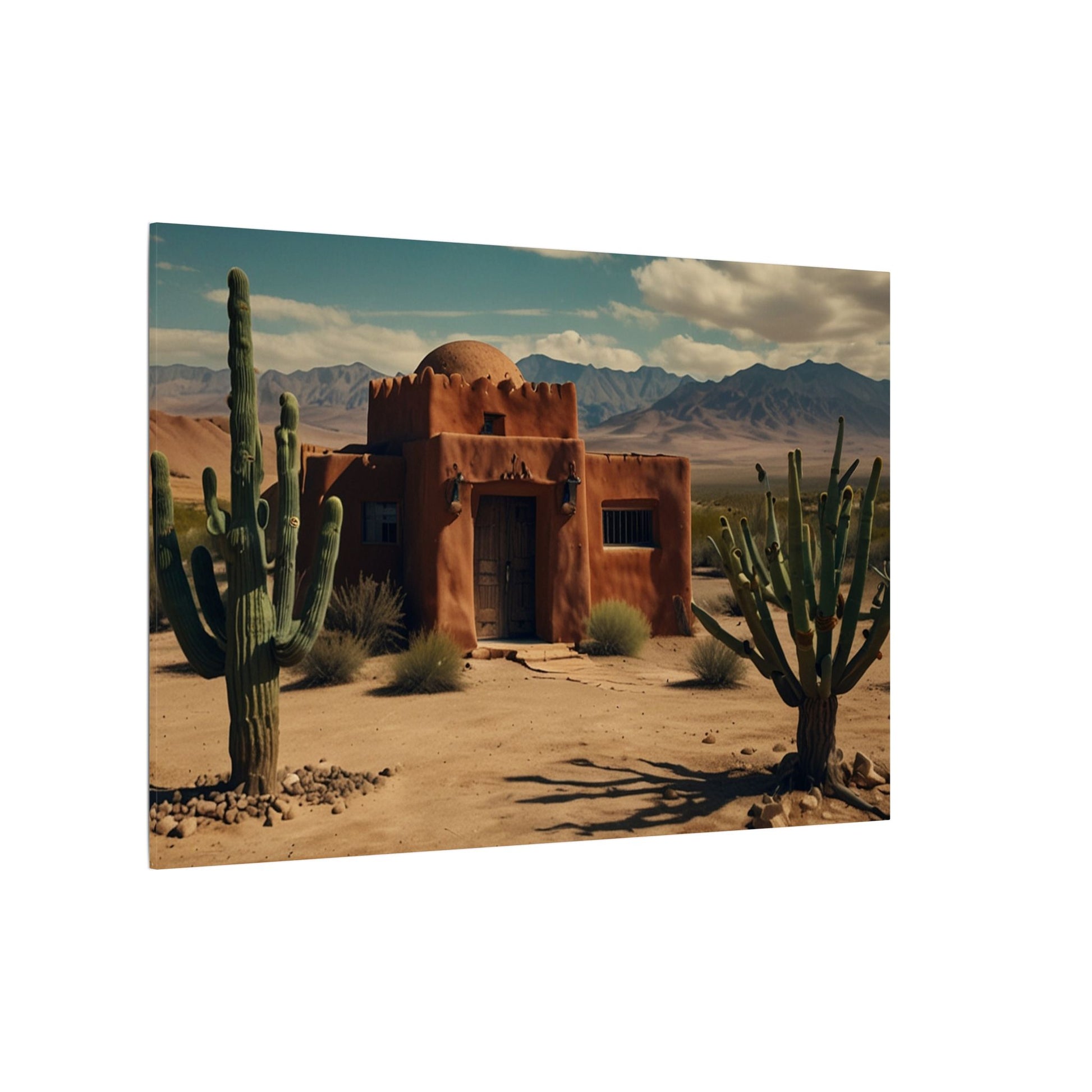Transform your space with this stunning wall art featuring a rustic desert scene with a pueblo home and cactus with mountains in the background. Perfect for those who love southwestern-inspired decor or want to add a touch of nature to their living space. Ideal for home decor, office spaces, or as a thoughtful gift for nature lovers. Suitable for occasions like housewarmings, birthdays, or as a holiday gift.