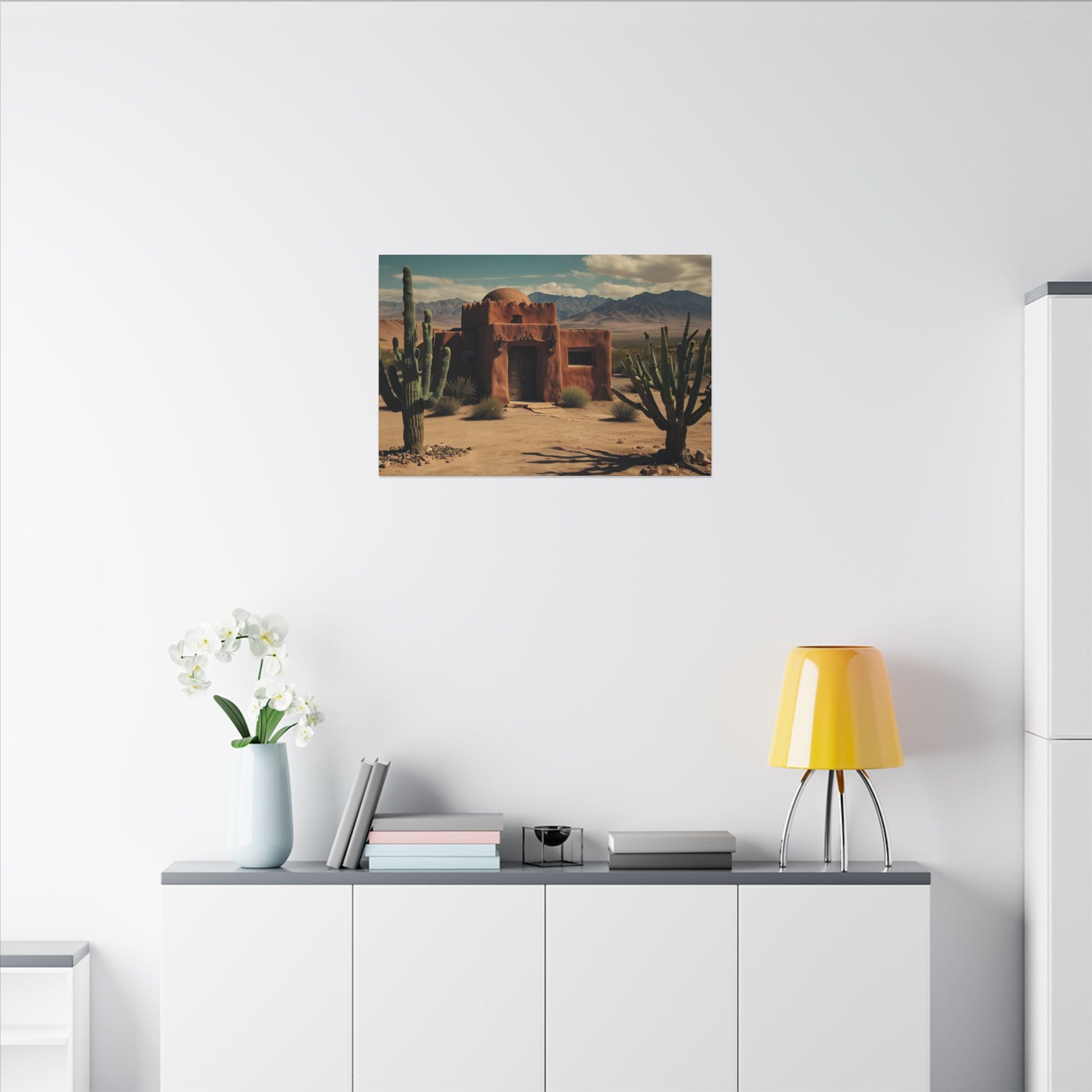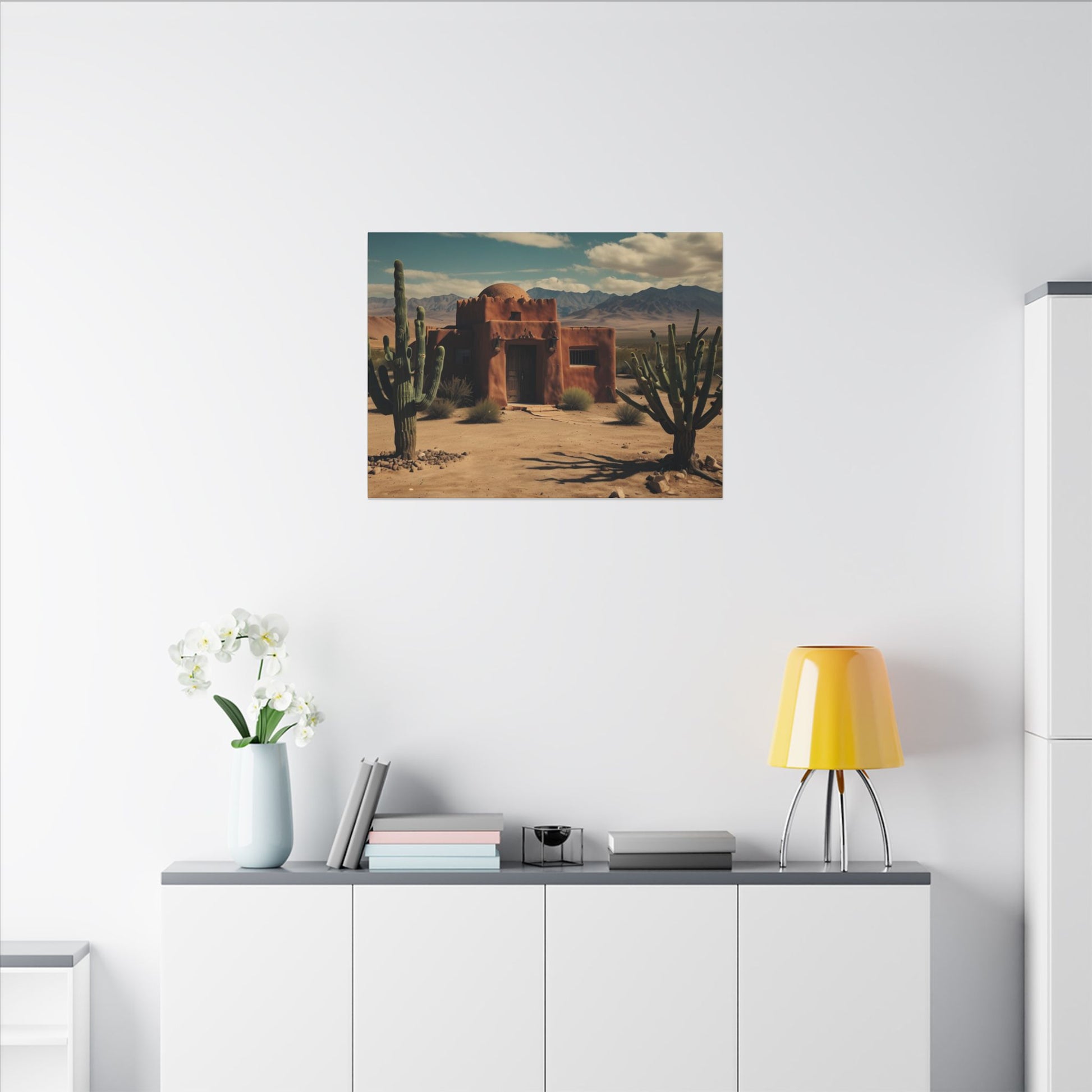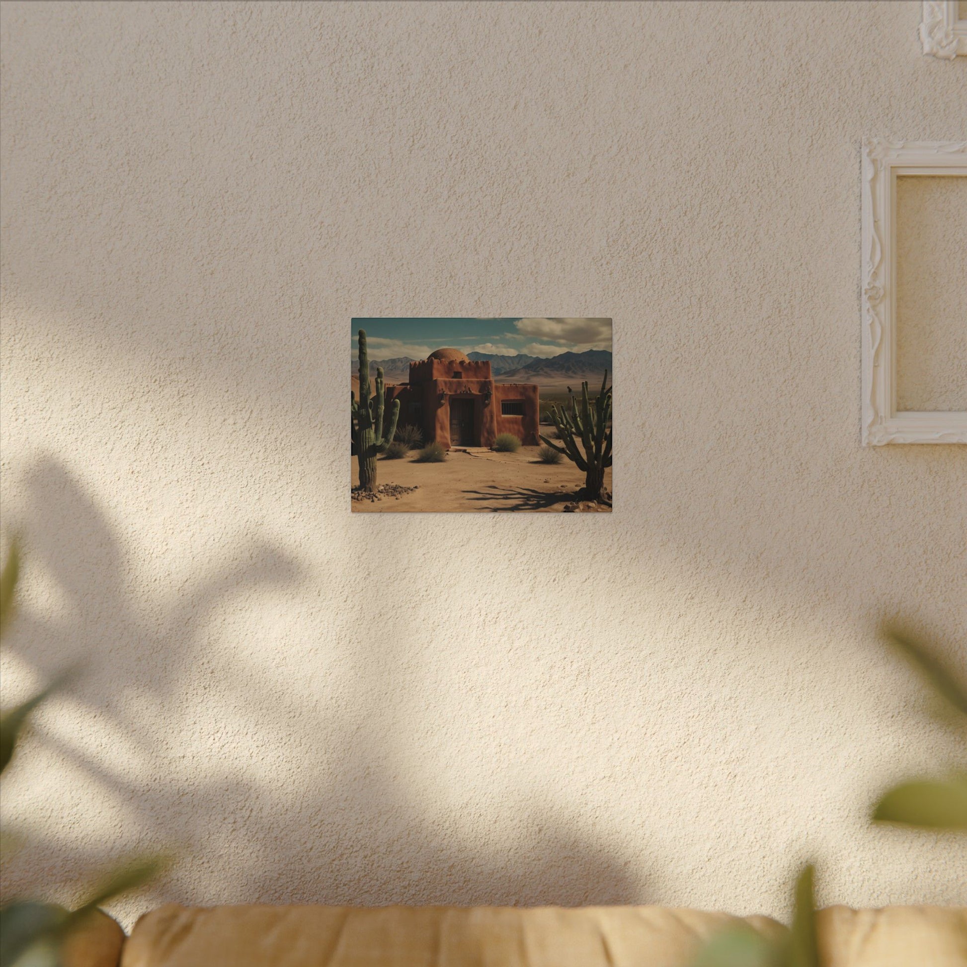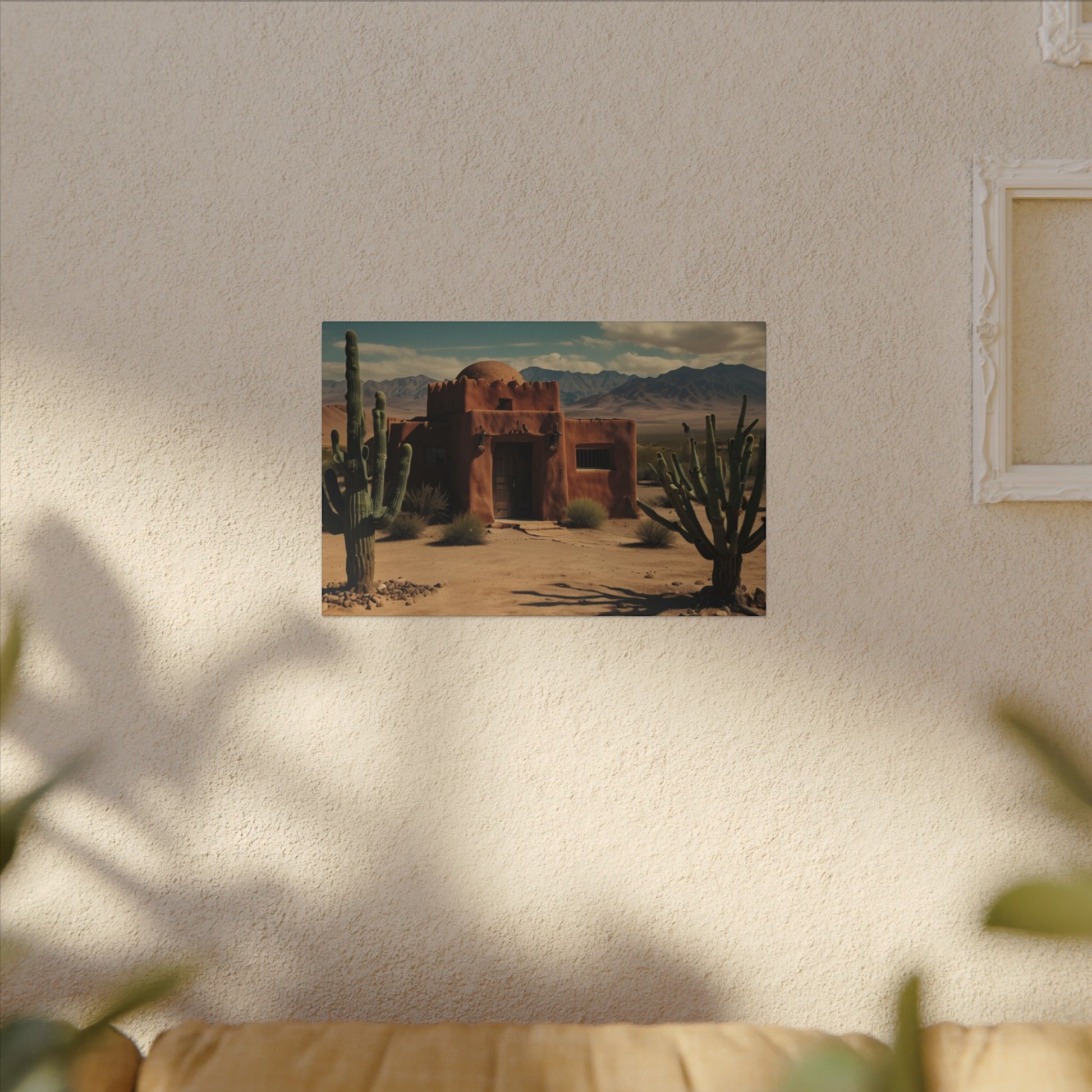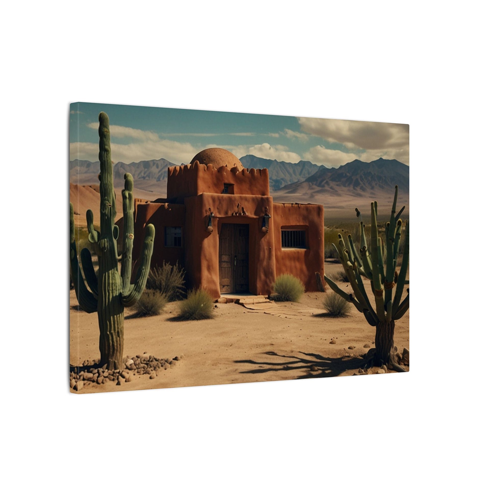 Transform your space with this stunning wall art featuring a rustic desert scene with a pueblo home and cactus with mountains in the background. Perfect for those who love southwestern-inspired decor or want to add a touch of nature to their living space. Ideal for home decor, office spaces, or as a thoughtful gift for nature lovers. Suitable for occasions like housewarmings, birthdays, or as a holiday gift.