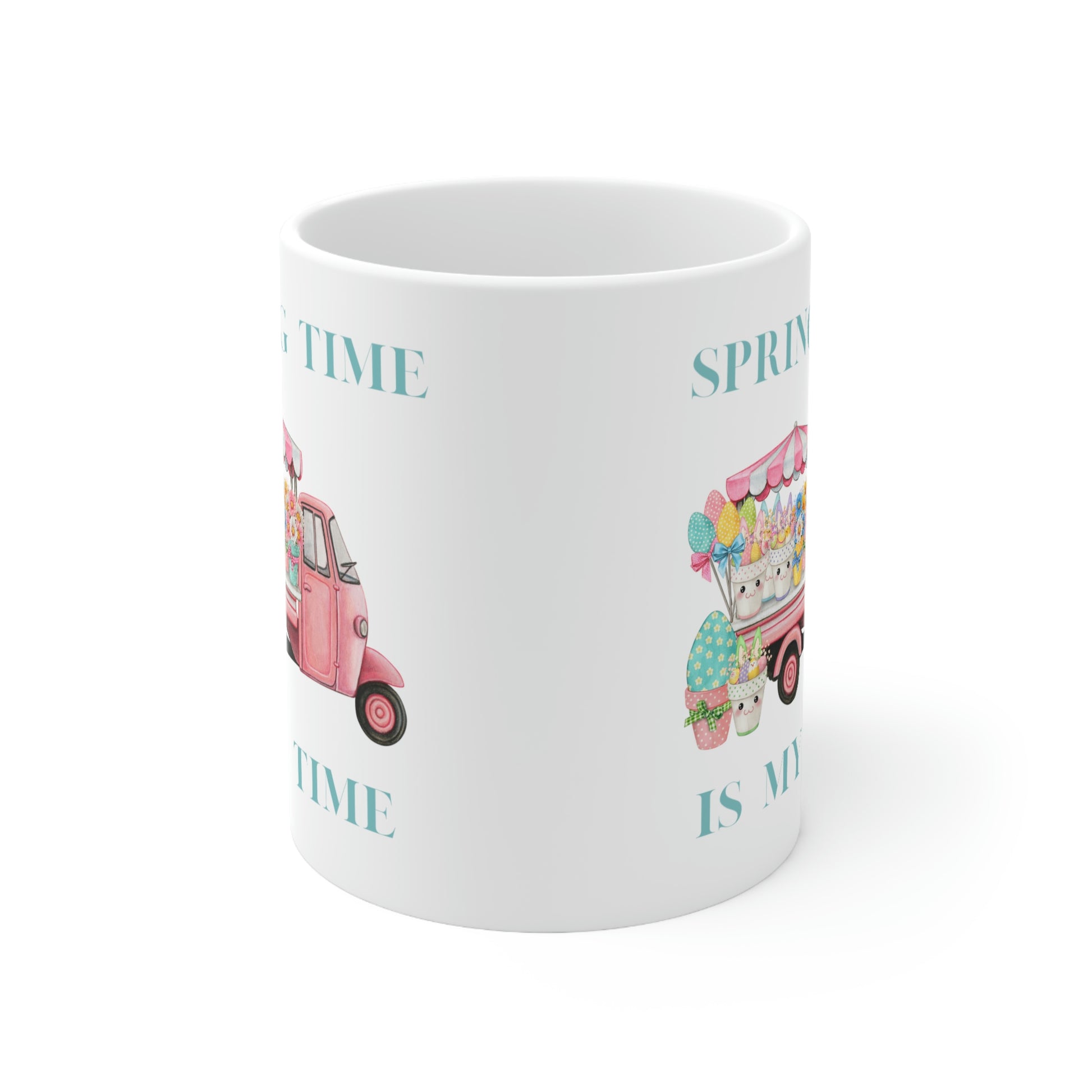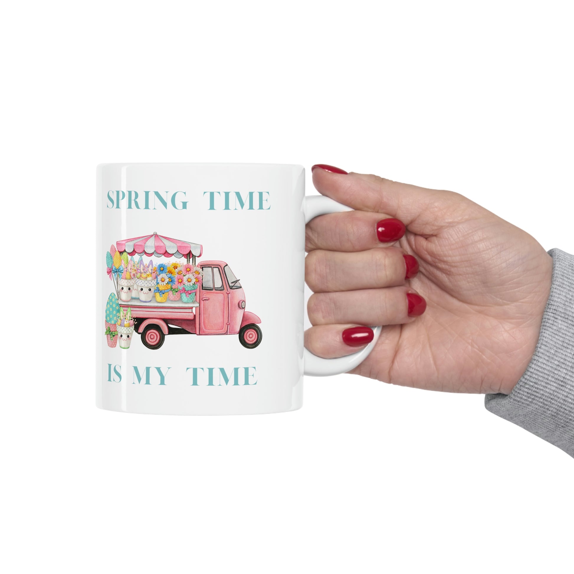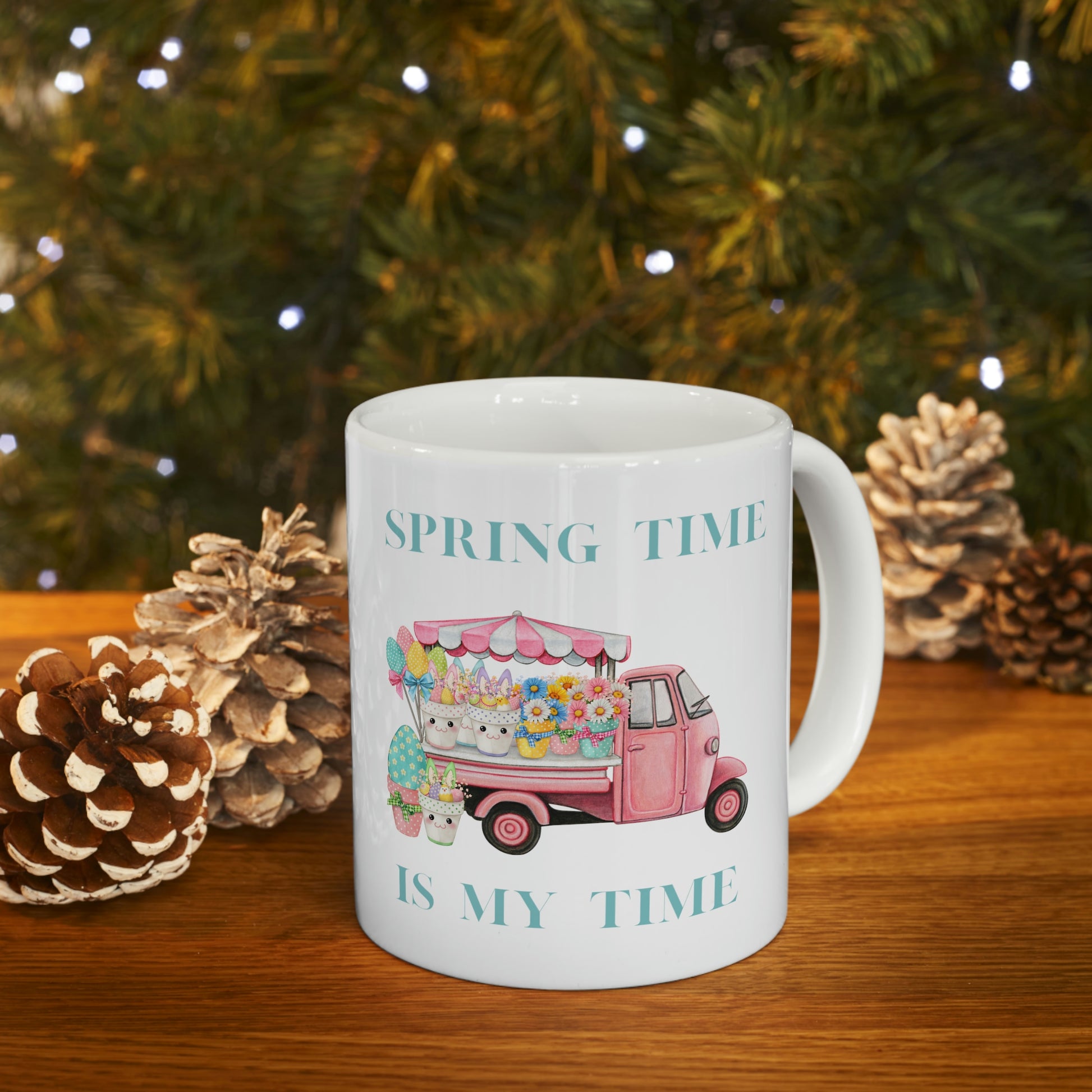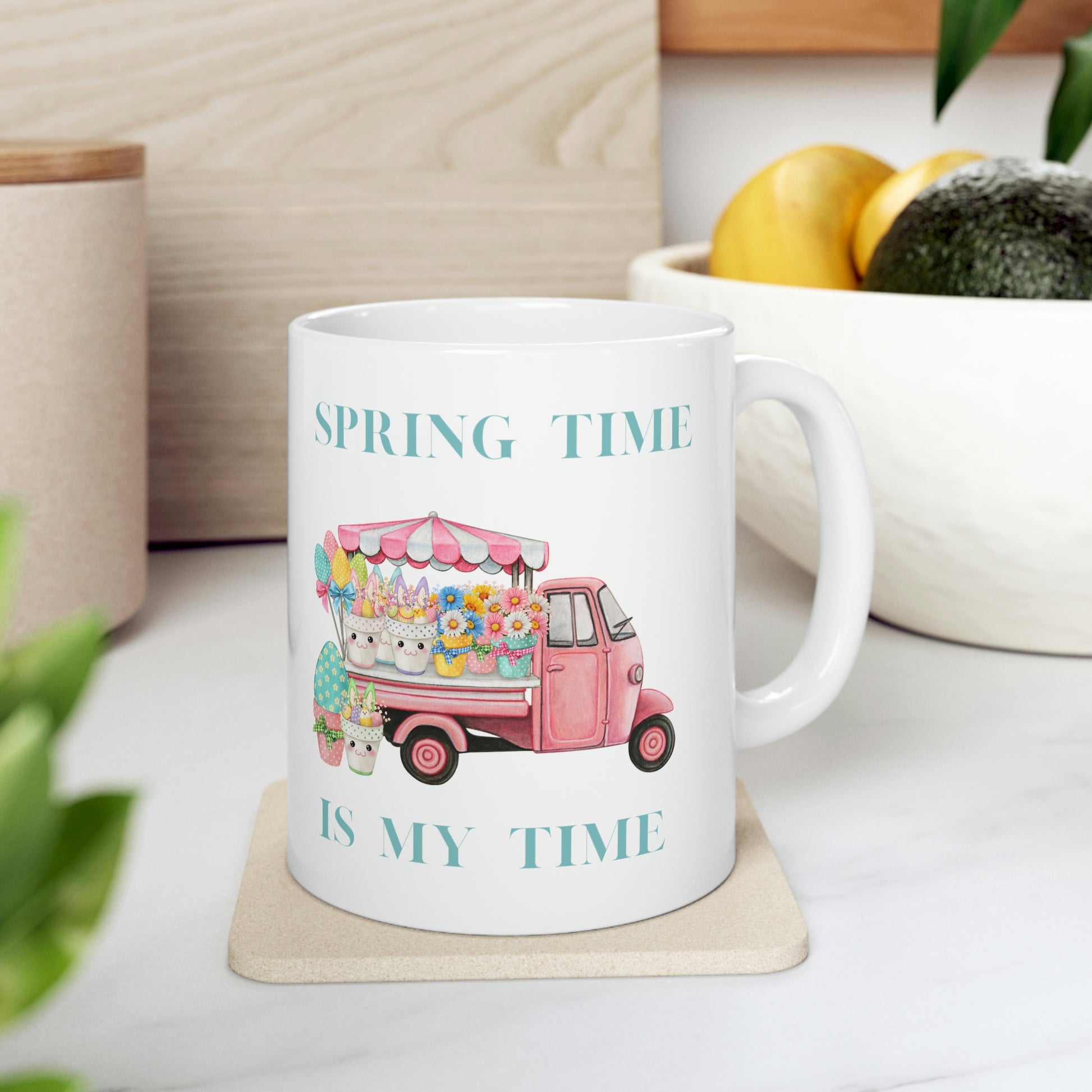 Springtime is the perfect time to show off your style! Enjoy a cup of coffee, tea or your favorite beverage as you get ready for the spring. Our unique Springtime is My Time mug is the perfect companion to our Springtime is My Time t-shirt. The design features an old jalopy truck covered in pastel-colored potted plants that are sure to catch eyes and turn heads. The perfect gift for the person in your life who just loves springtime.