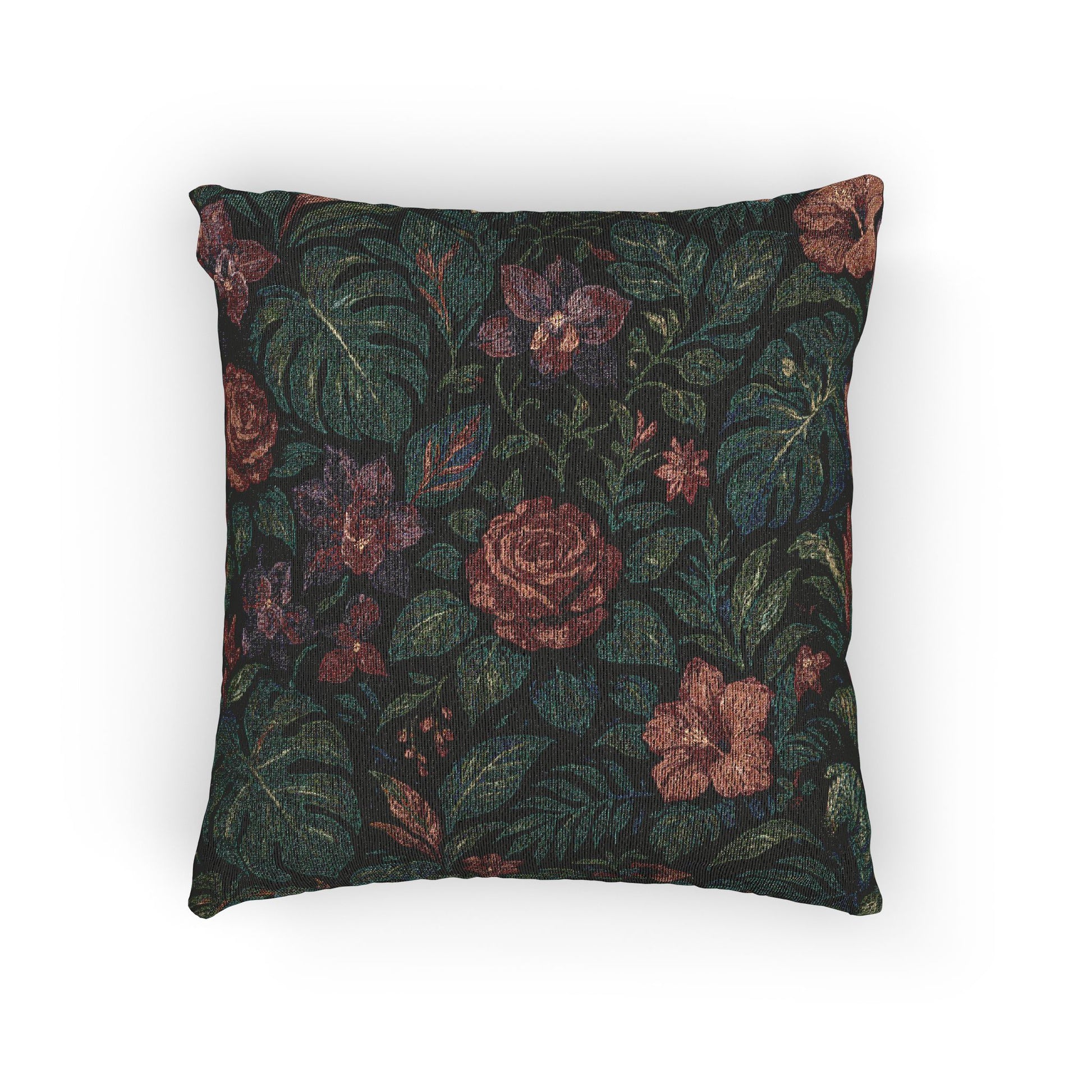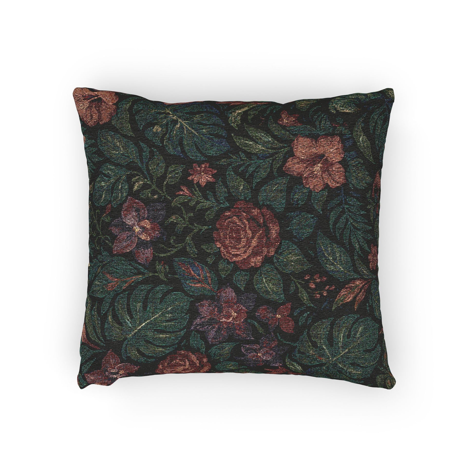 Bring timeless sophistication to your home with this Tapestry Styled Floral Throw Pillow, featuring rich image of roses, tropical leaves, and vintage-style florals in muted jewel tones. The dark background and intricately detailed pattern evoke the artistry of Victorian textiles and European jacquard weaving, making it a perfect accent for cozy, classic, or moody interiors. Each pillow combines old-world charm with modern comfort — ideal for layering on a sofa, armchair, or bed to add depth and texture to your space.