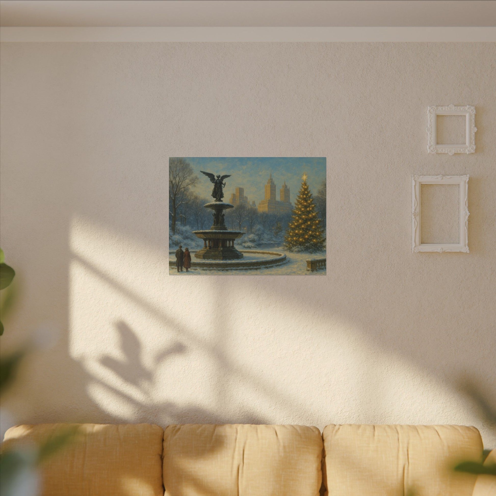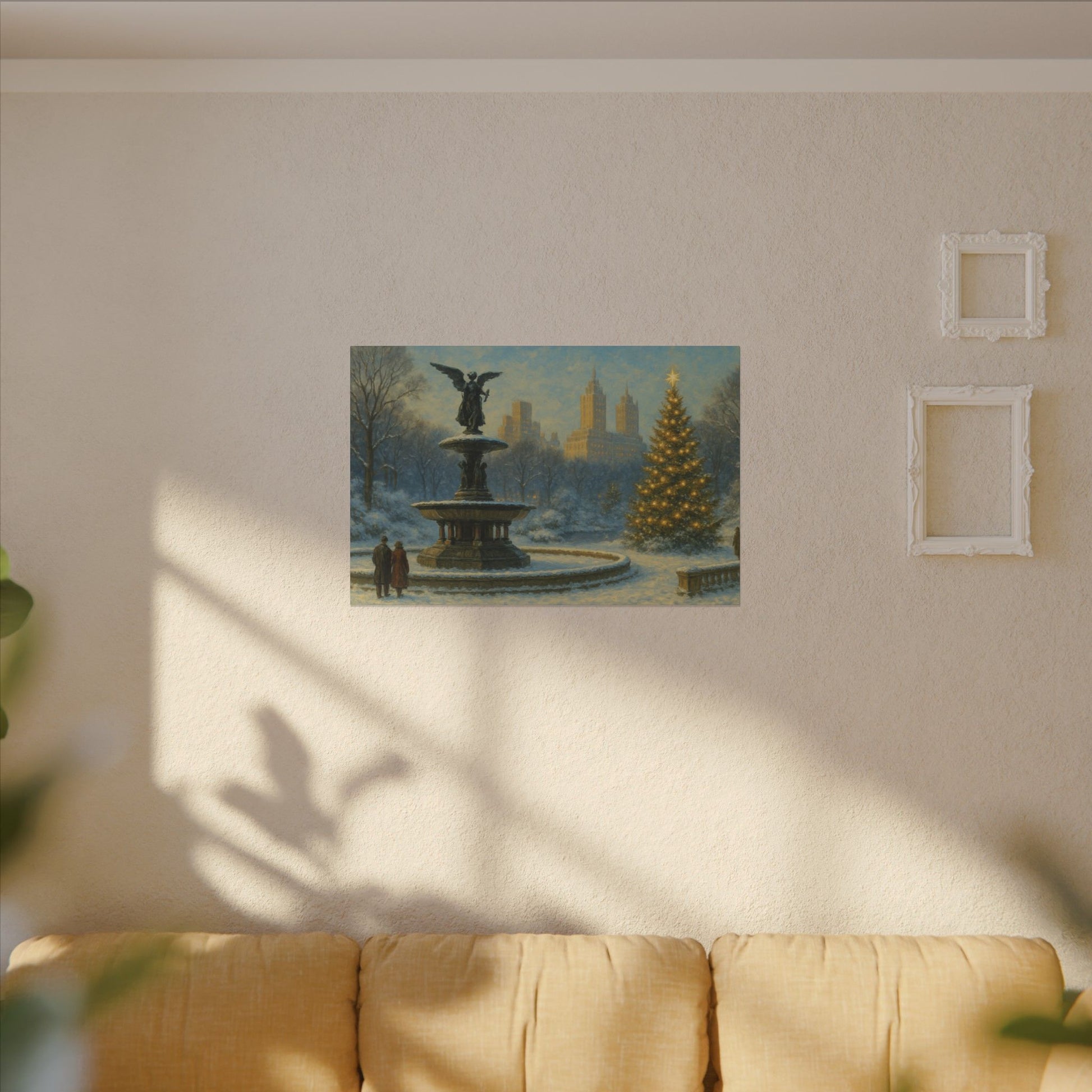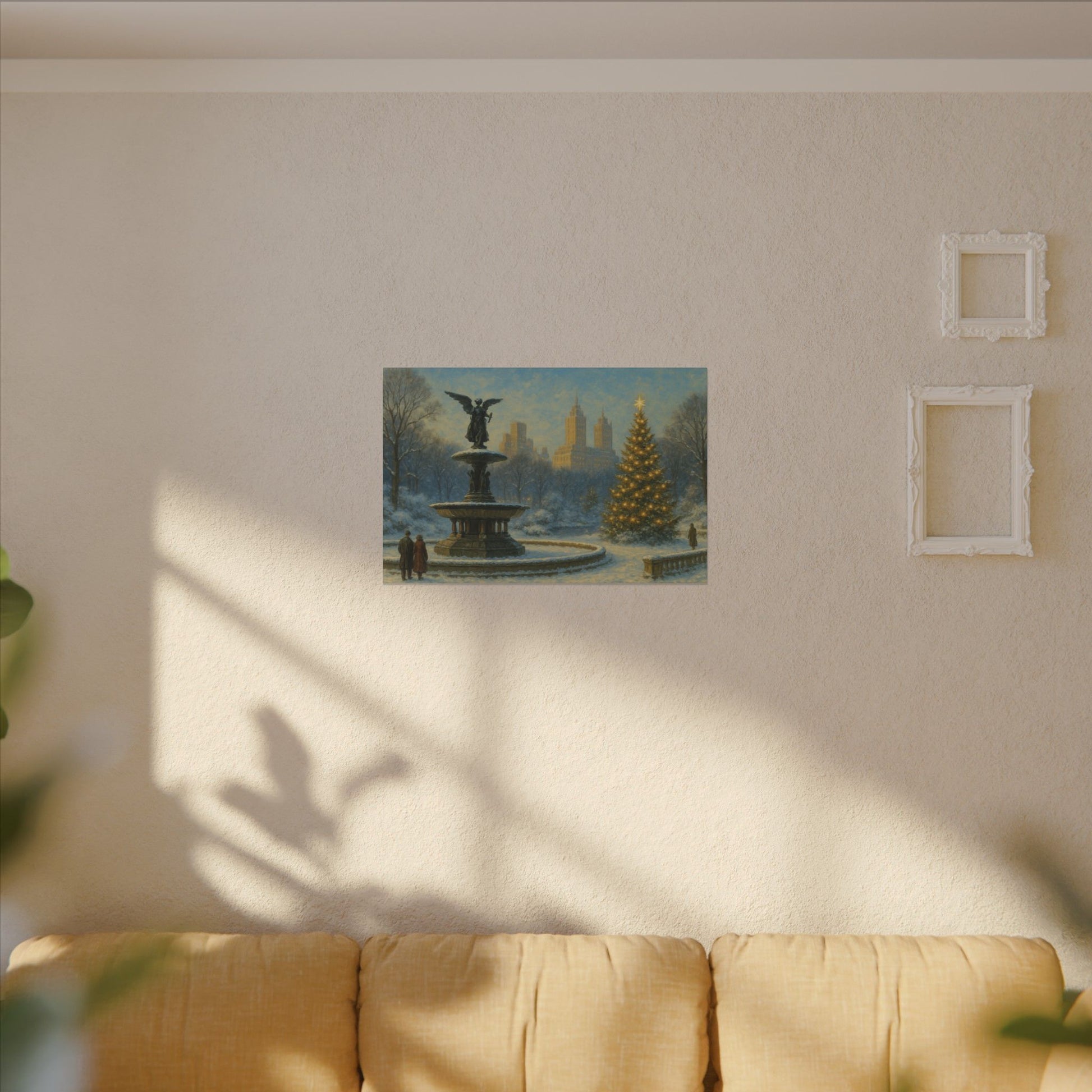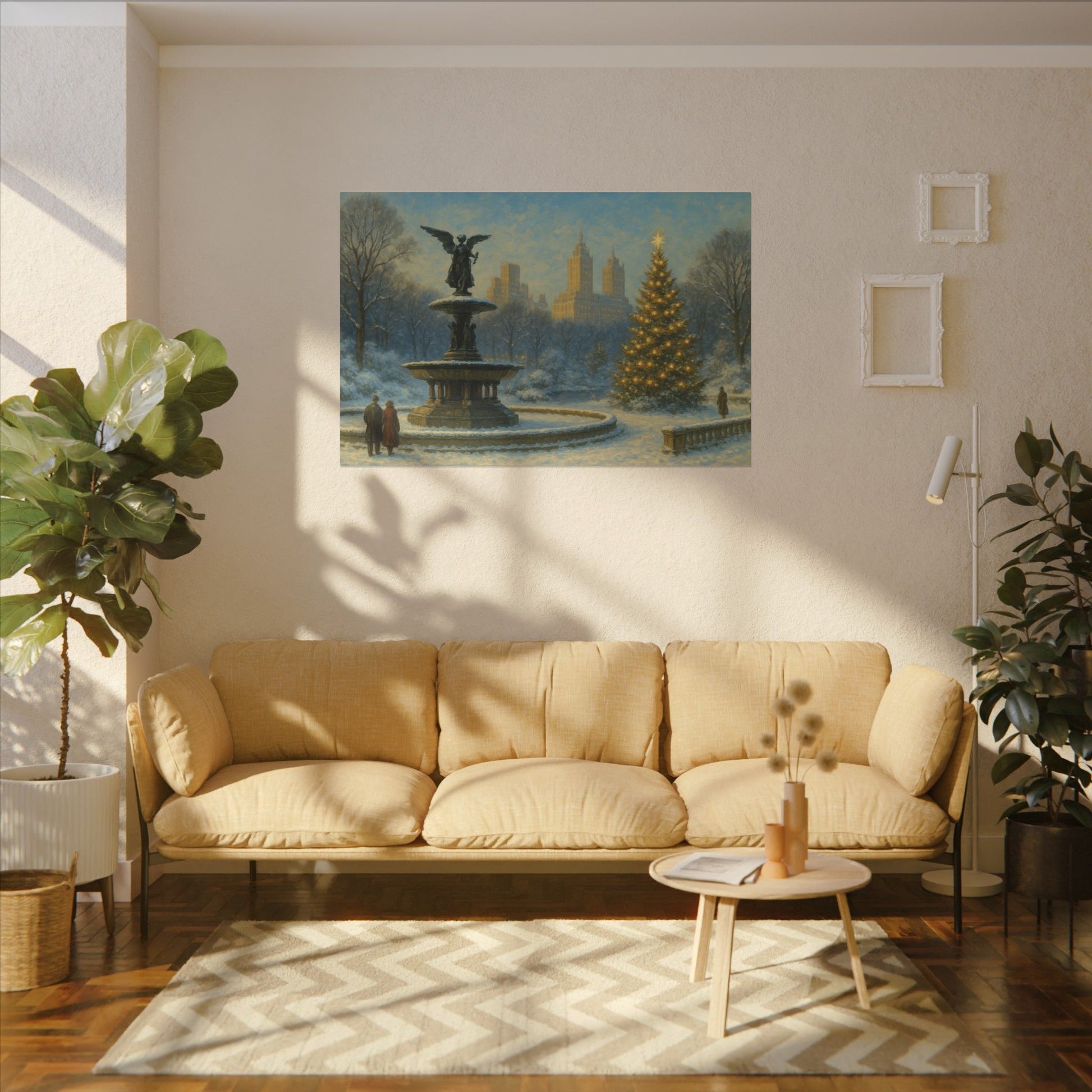 This timeless vintage oil style painting showcases Bethesda Terrace dressed for Christmas, overlooking a festive evergreen glowing beneath soft snowfall. With warm golden lights, iconic stone arches, and a serene winter setting, this artwork captures the romance and nostalgia of Christmas in Central Park. A softly lit winter evening captured on stretched matte canvas — an intimate city-park scene with a glowing Christmas tree, a graceful fountain topped by an angel, and distant skyline silhouettes. The texture of the canvas and the matte finish lend a painterly, museum-quality look that feels like a quiet stroll through snow-dusted paths. Warm golden lights against cool winter blues create depth and atmosphere, inviting a calm, reflective mood. This piece fits naturally above a mantel, in a cozy reading nook, or on a hallway wall where the glow of the tree and the subtle brush-like details can be appreciated up close. The durable cotton-poly canvas and responsibly sourced pine stretcher ensure the artwork stays vibrant and stable for years, while small rubber pads keep it sitting flush and secure when displayed. Each reproduction features premium archival color and painterly texture. Available in multiple sizes.